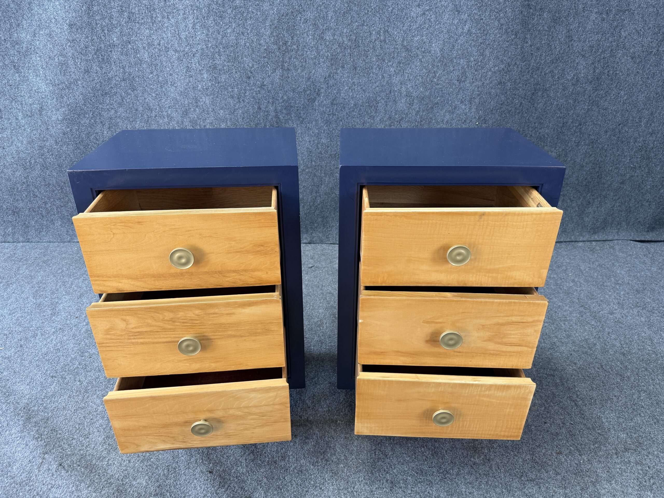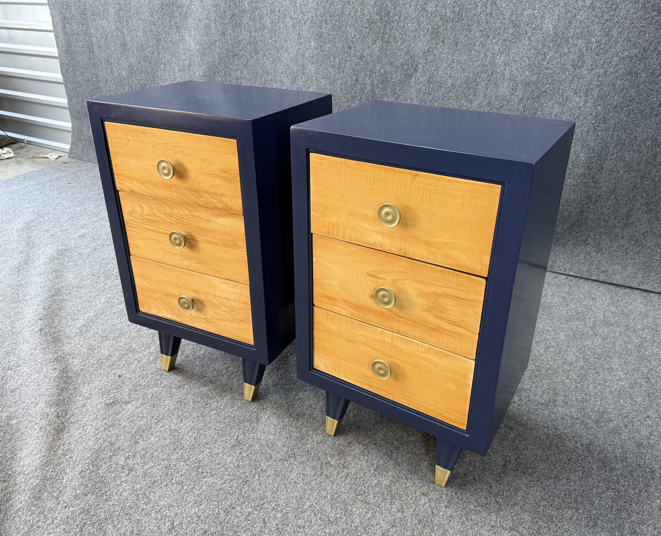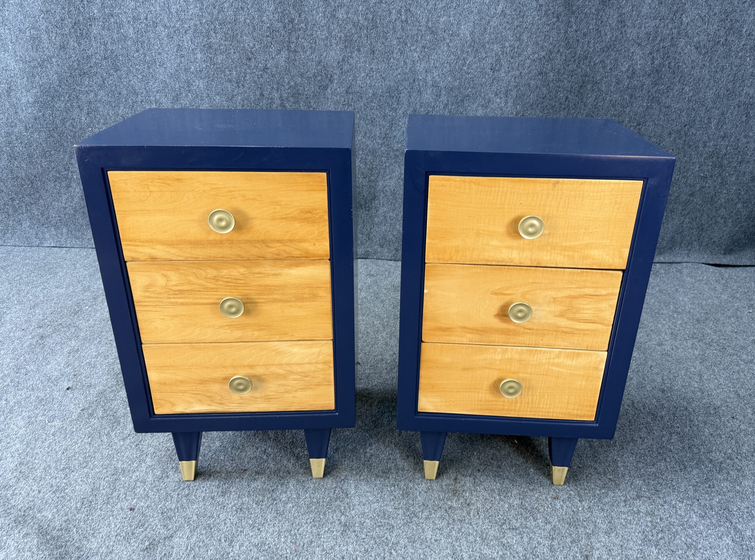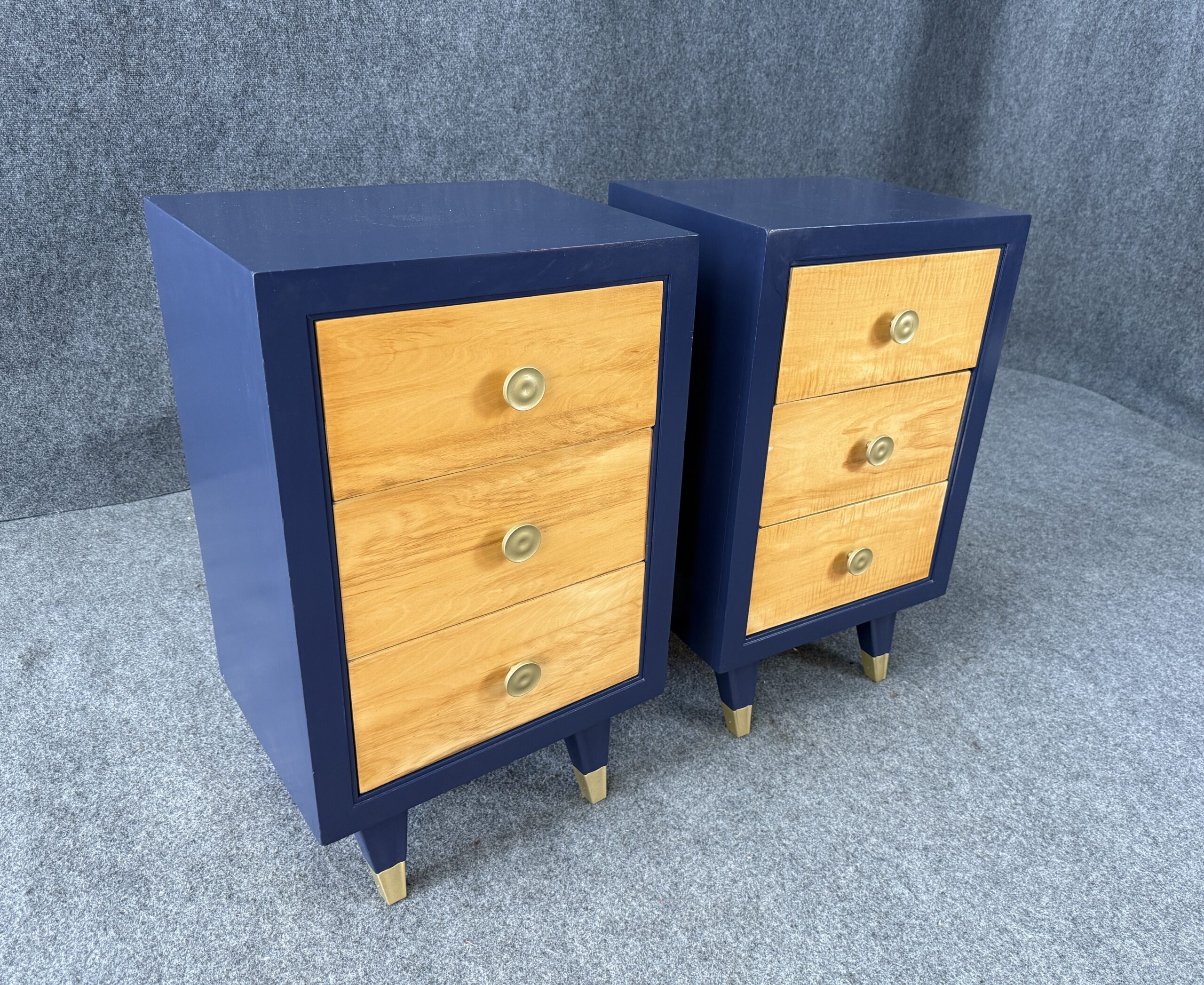 Each nightstand combines natural maple drawer fronts with a deep blue lacquered case, accented by brass pulls and capped legs. The sleek lines and contrasting finishes give the pair a modern yet timeless appeal. With three drawers each, they offer both style and practical bedside storage.