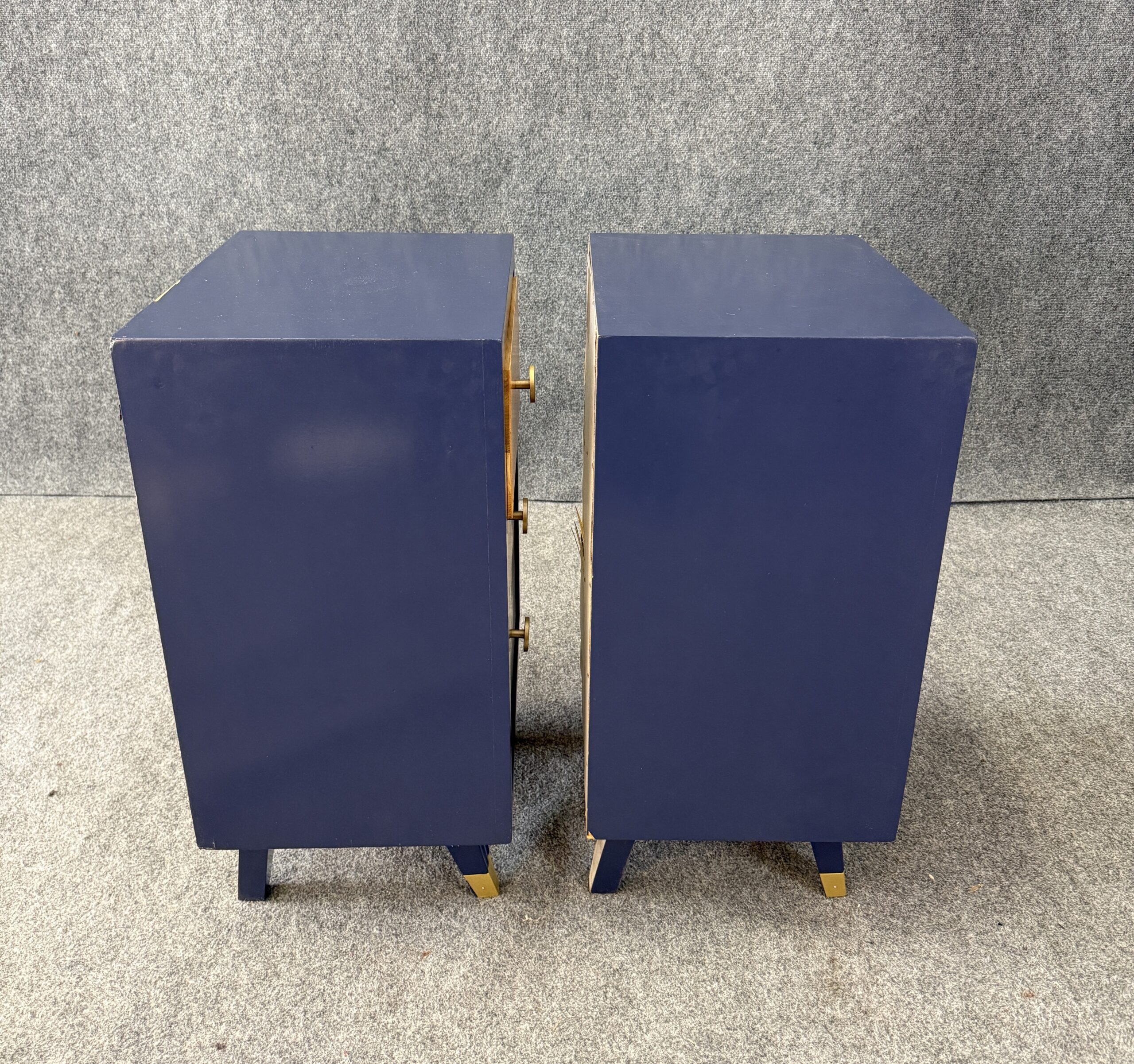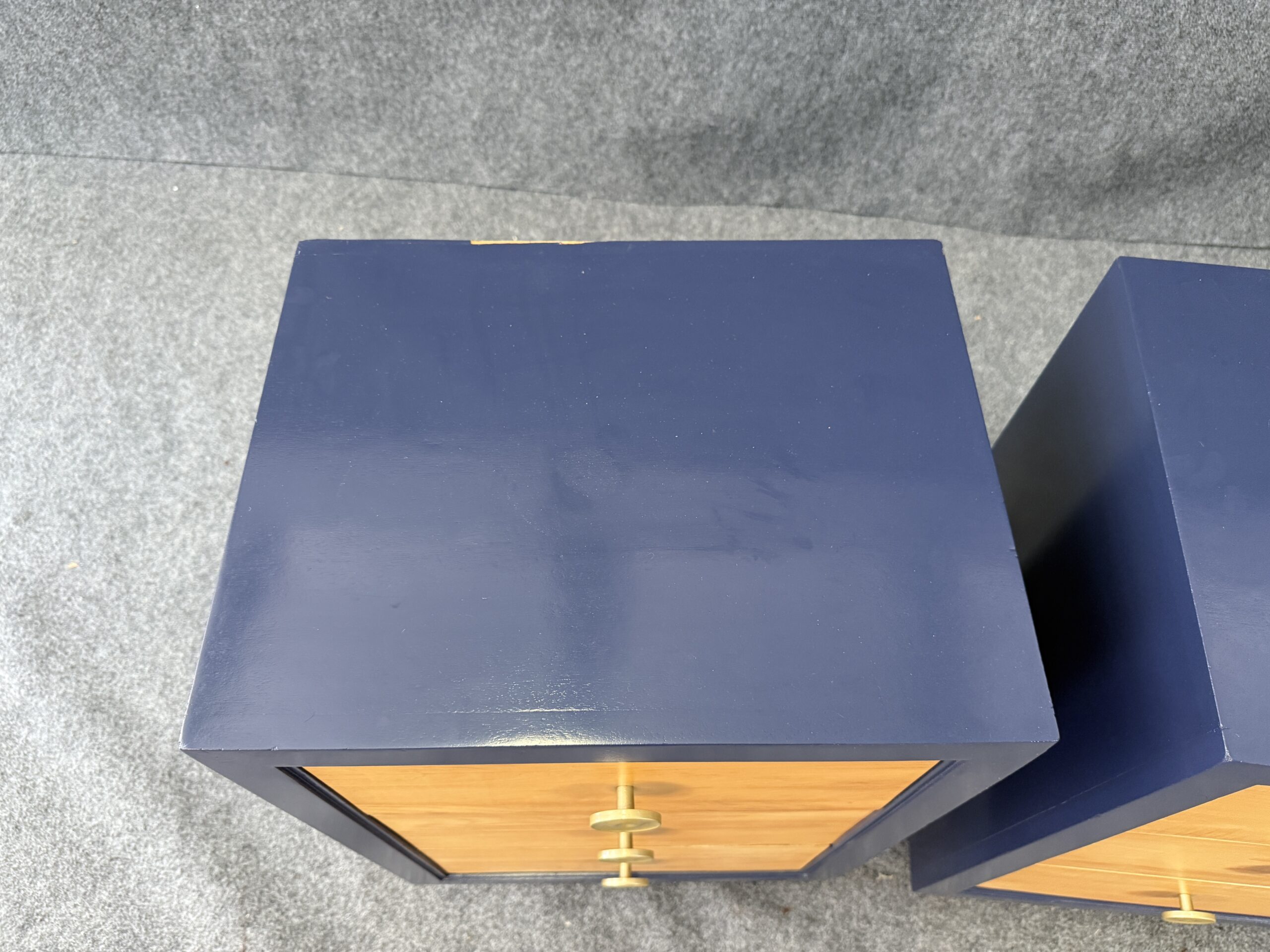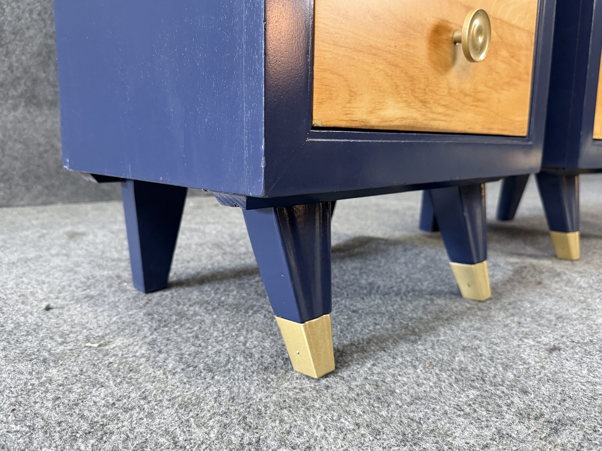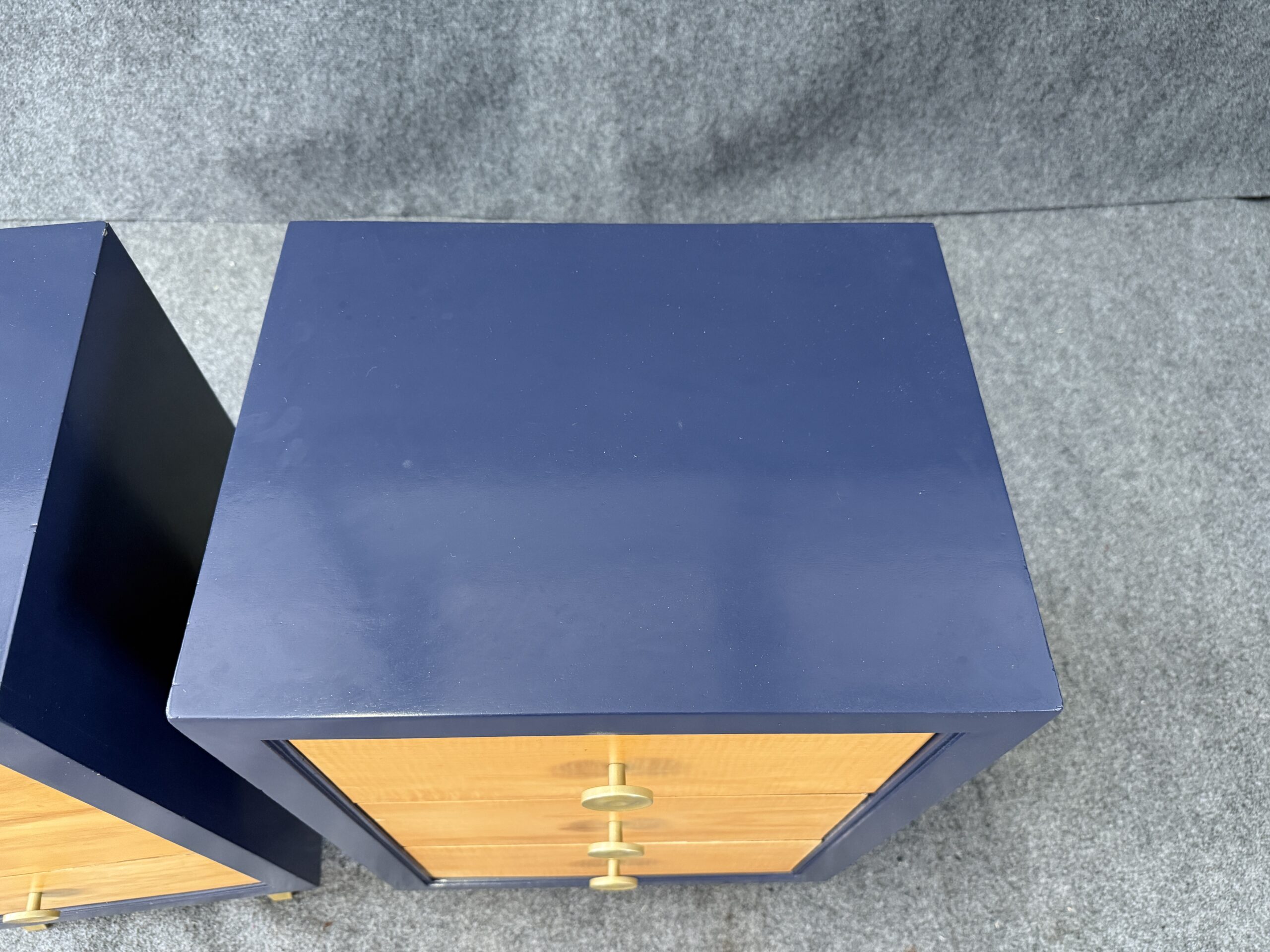 Each nightstand combines natural maple drawer fronts with a deep blue lacquered case, accented by brass pulls and capped legs. The sleek lines and contrasting finishes give the pair a modern yet timeless appeal. With three drawers each, they offer both style and practical bedside storage.