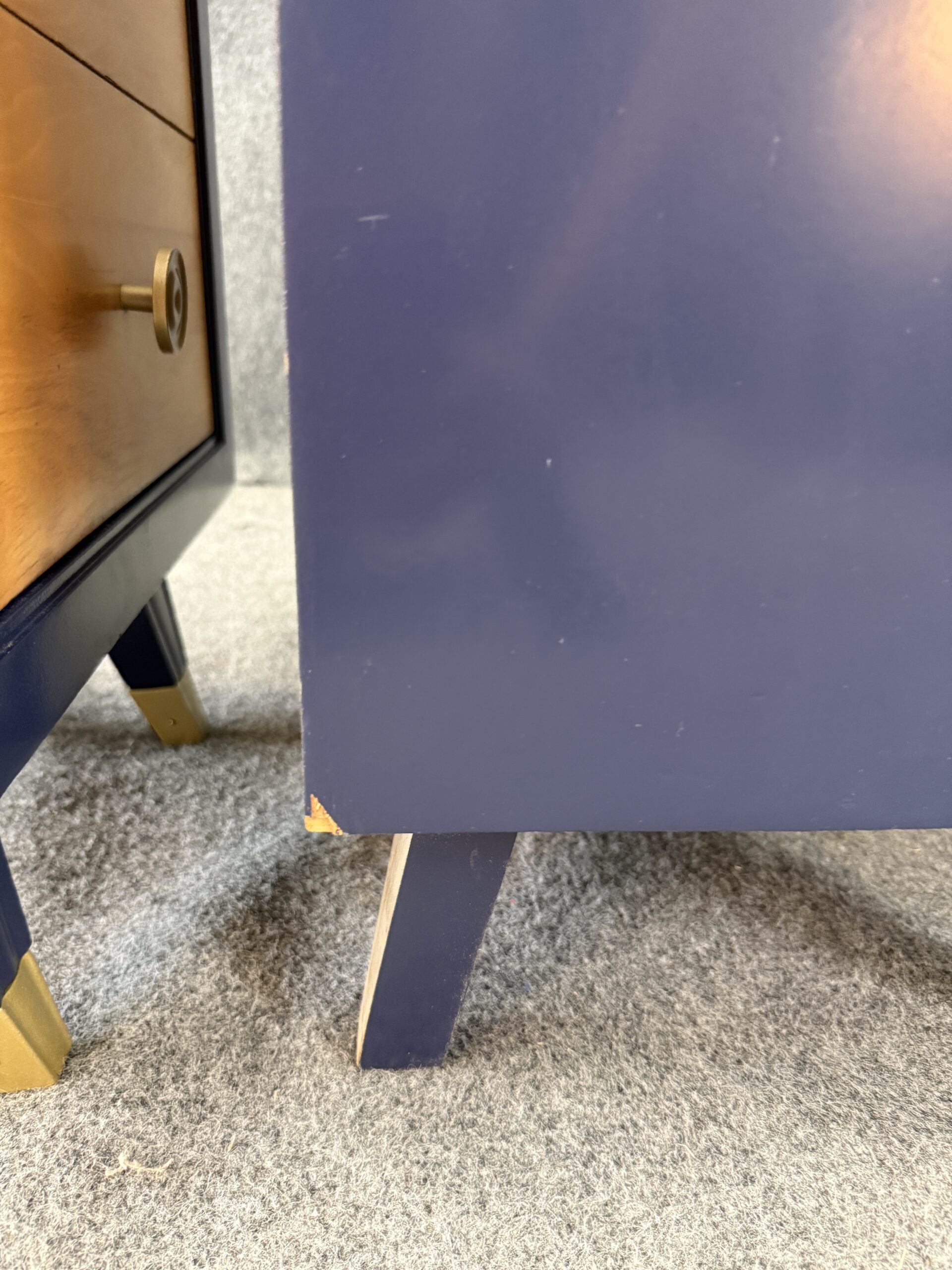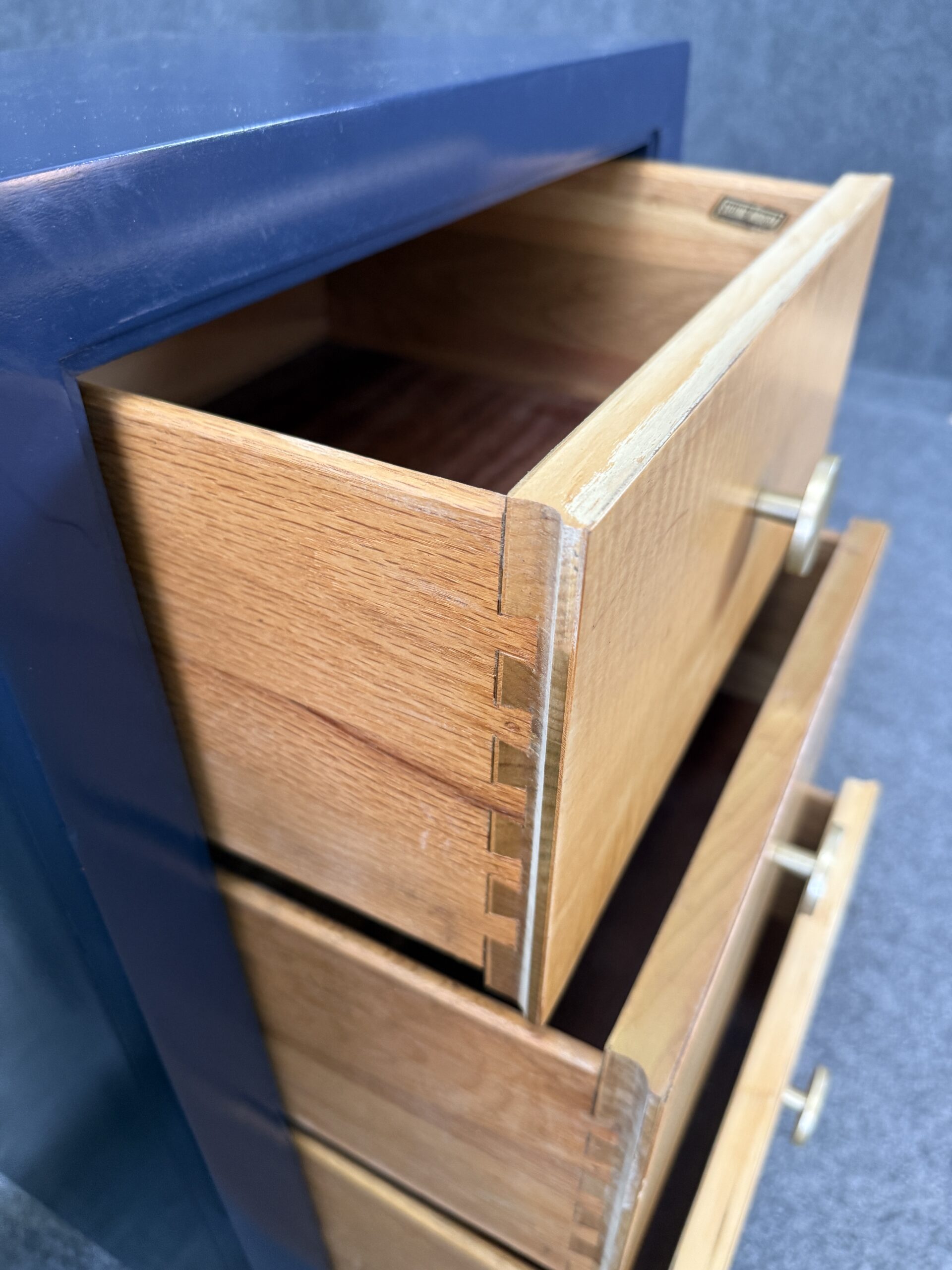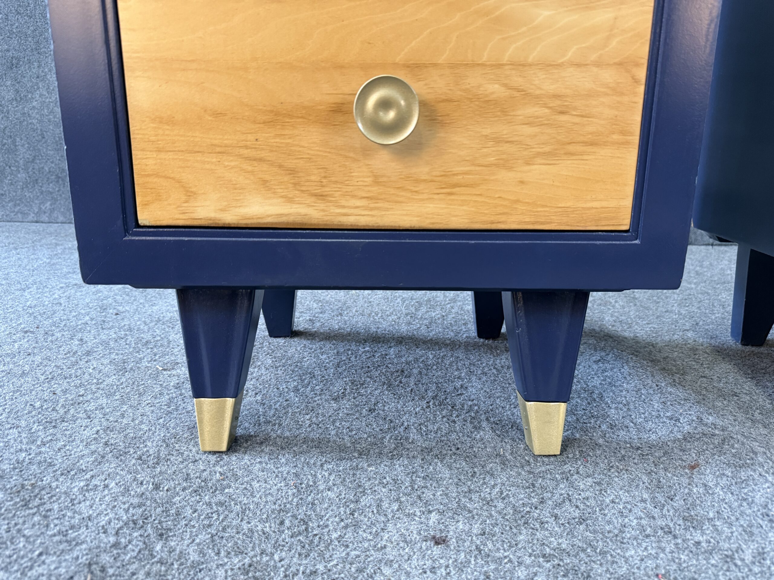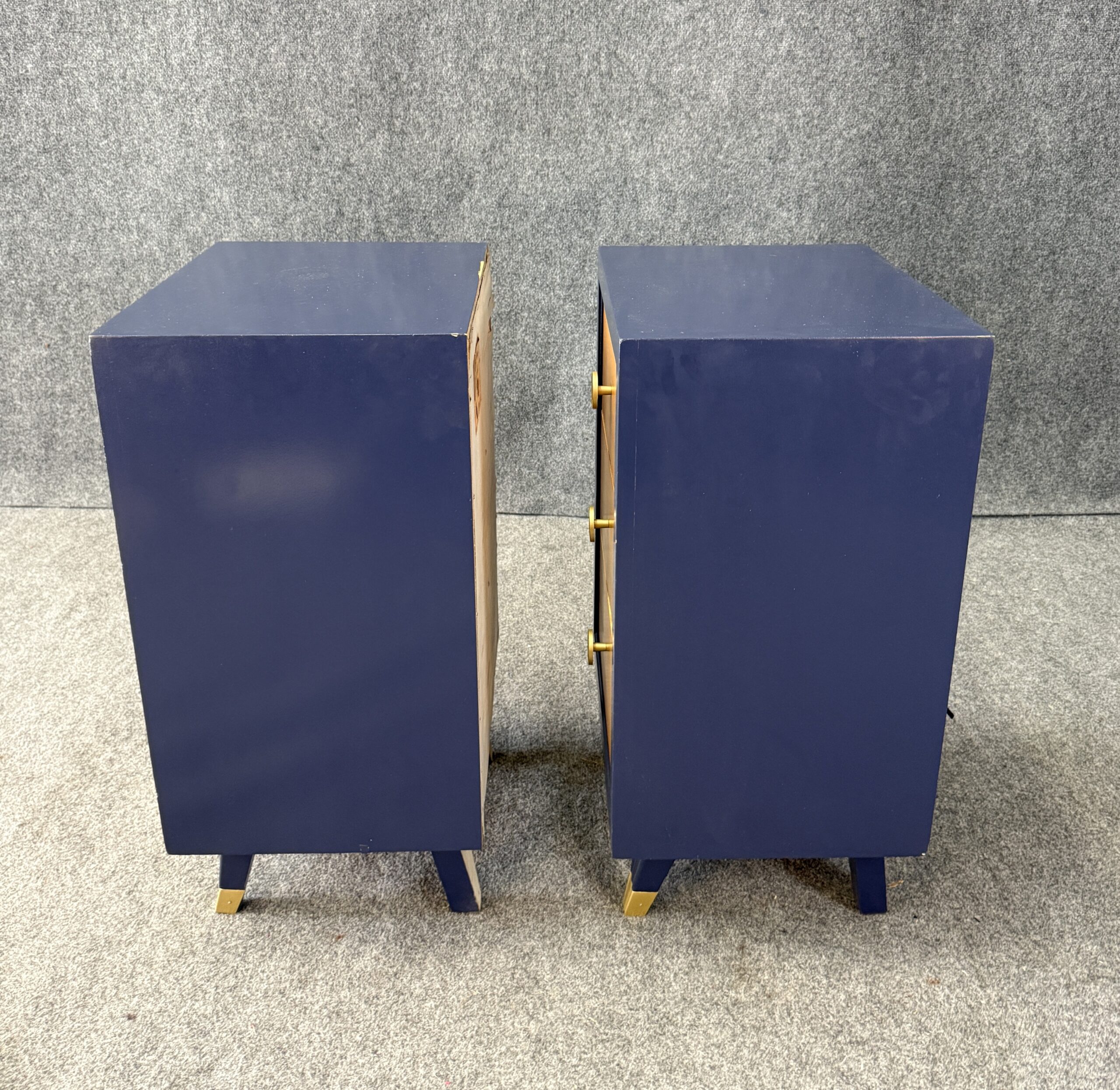 Each nightstand combines natural maple drawer fronts with a deep blue lacquered case, accented by brass pulls and capped legs. The sleek lines and contrasting finishes give the pair a modern yet timeless appeal. With three drawers each, they offer both style and practical bedside storage.