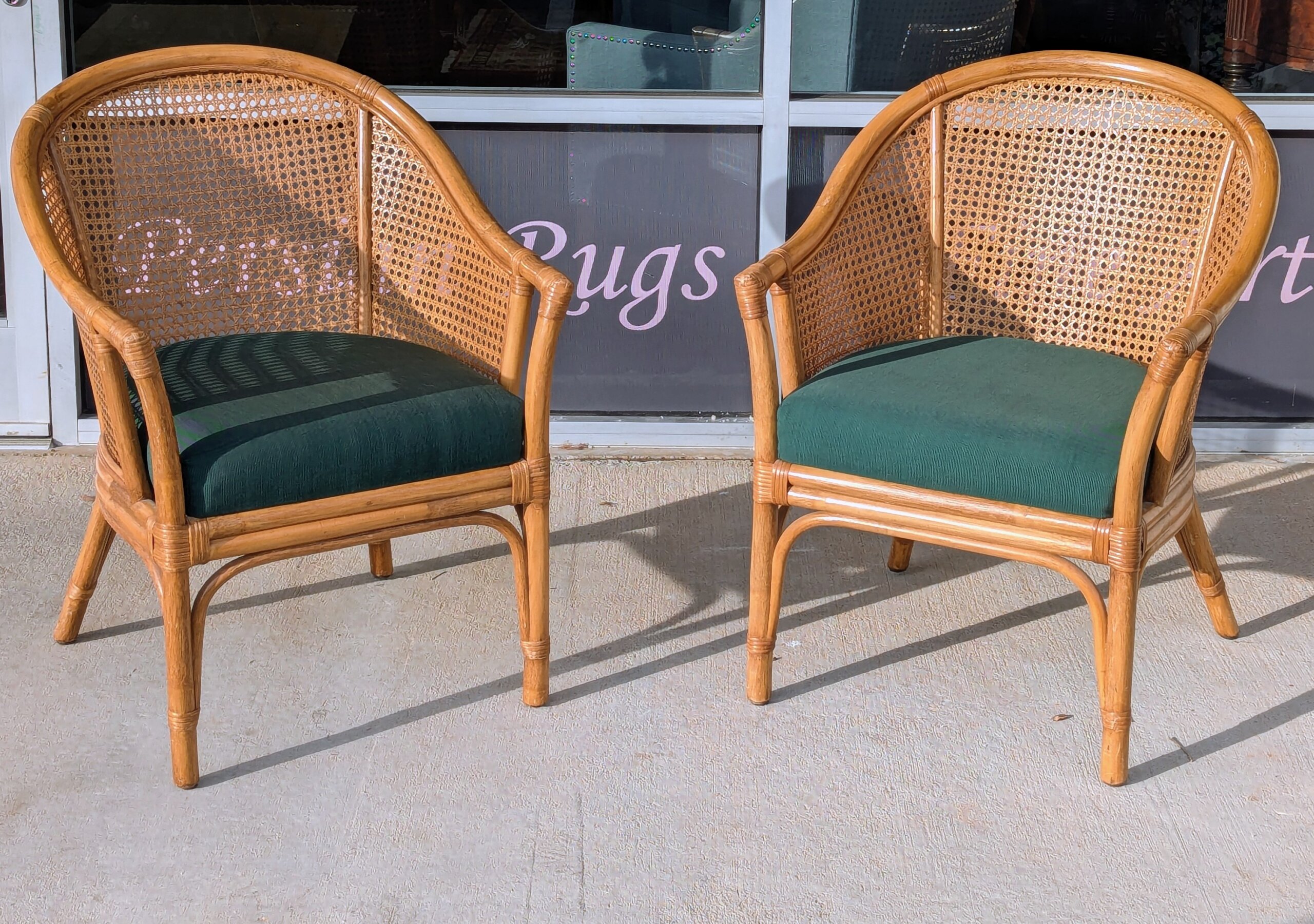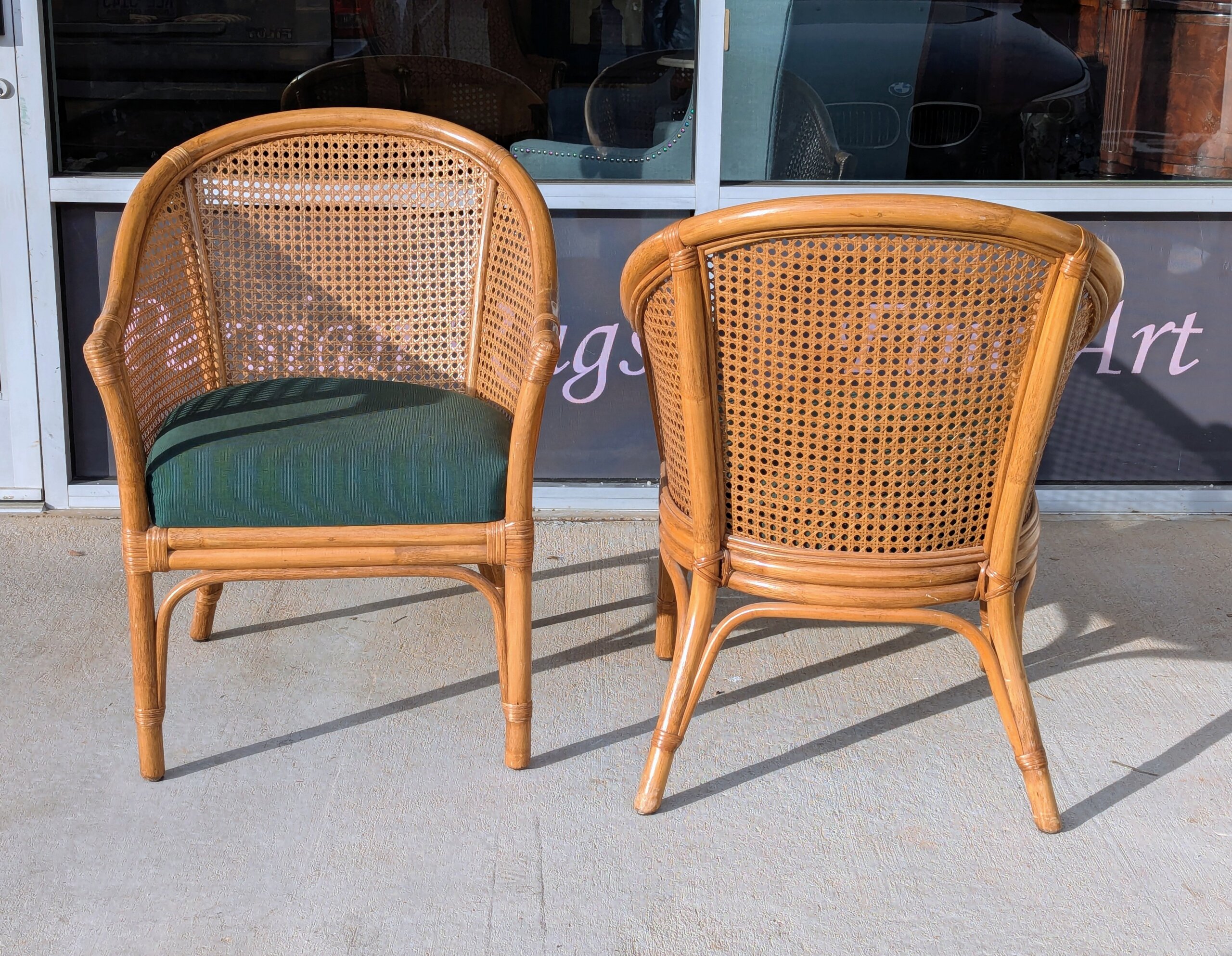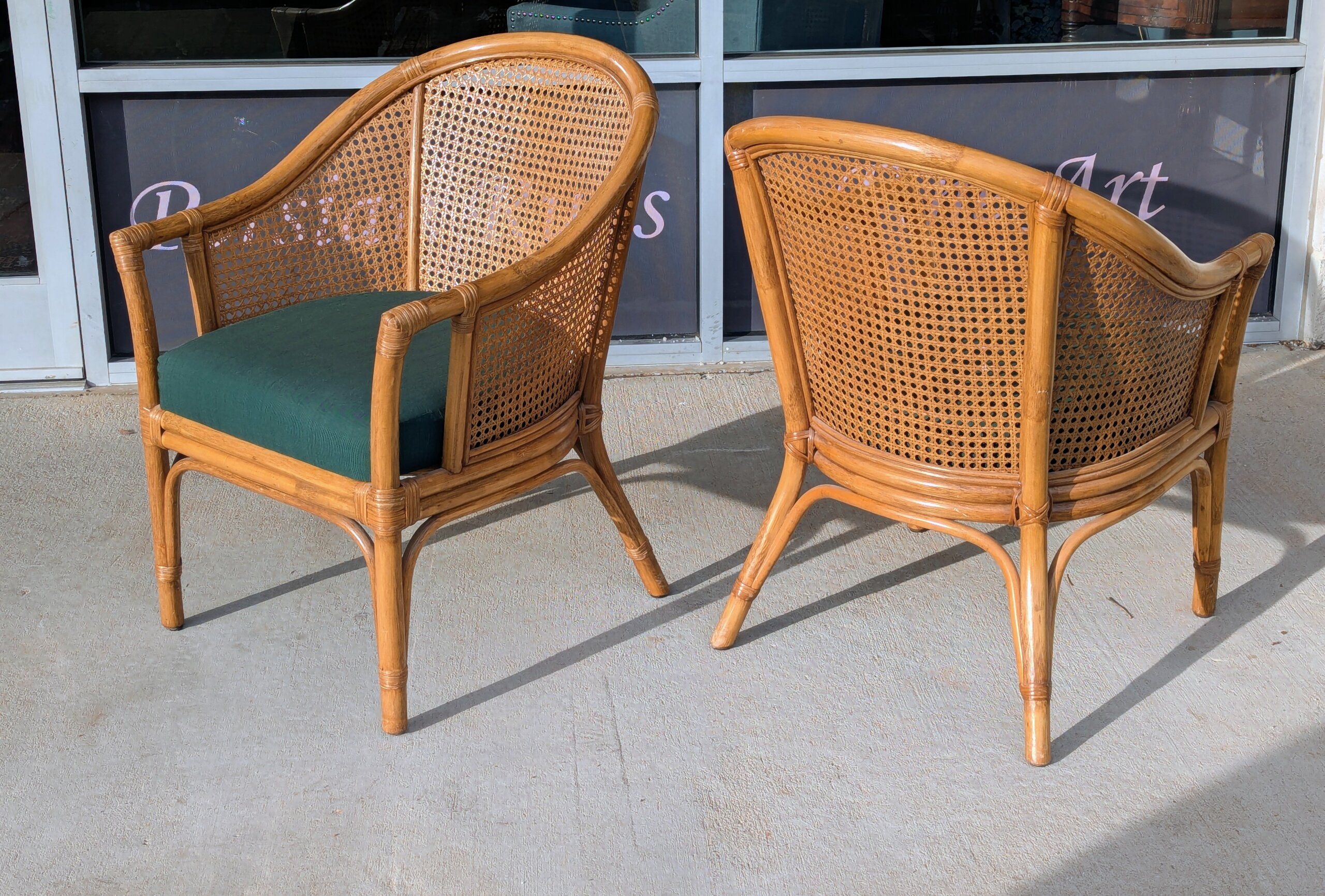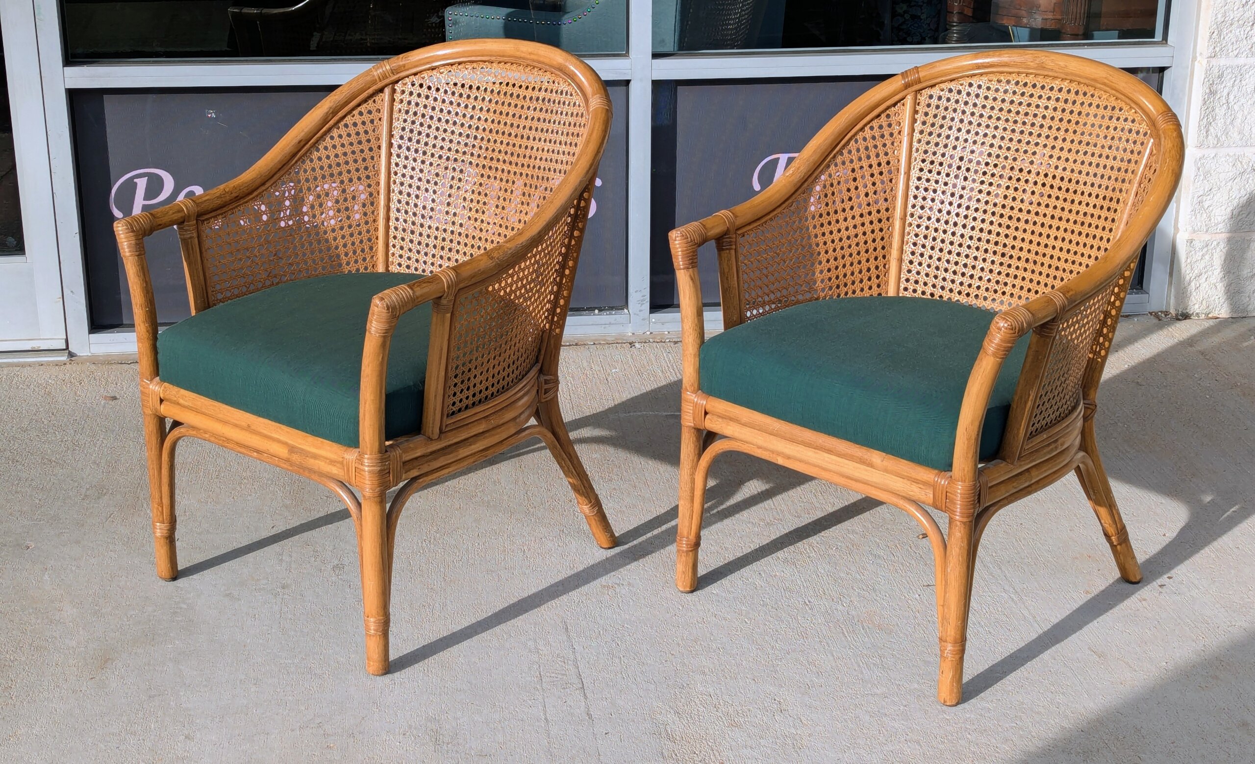 Pair of barrel back style armchairs [ circa 2005] from a recent Chapel Hill estate. Classic styling featuring dark green polished cotton seats with both the rattan and cane work in excellent condition. Sturdy and comfortable!