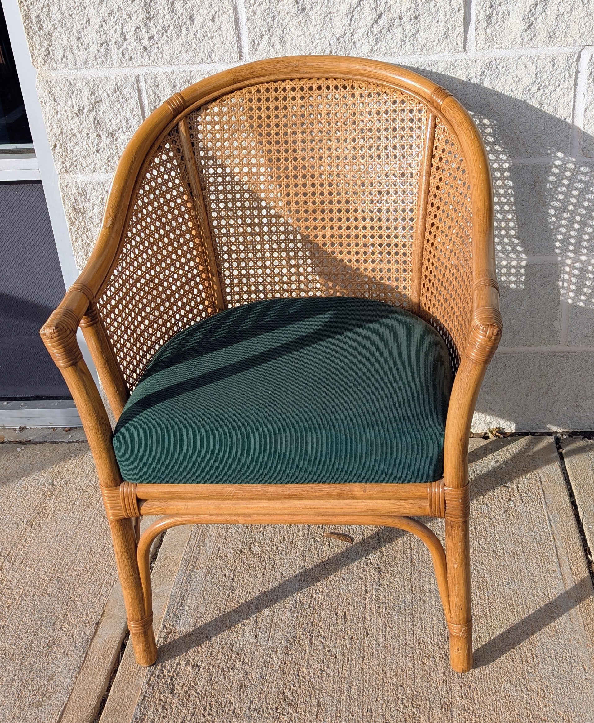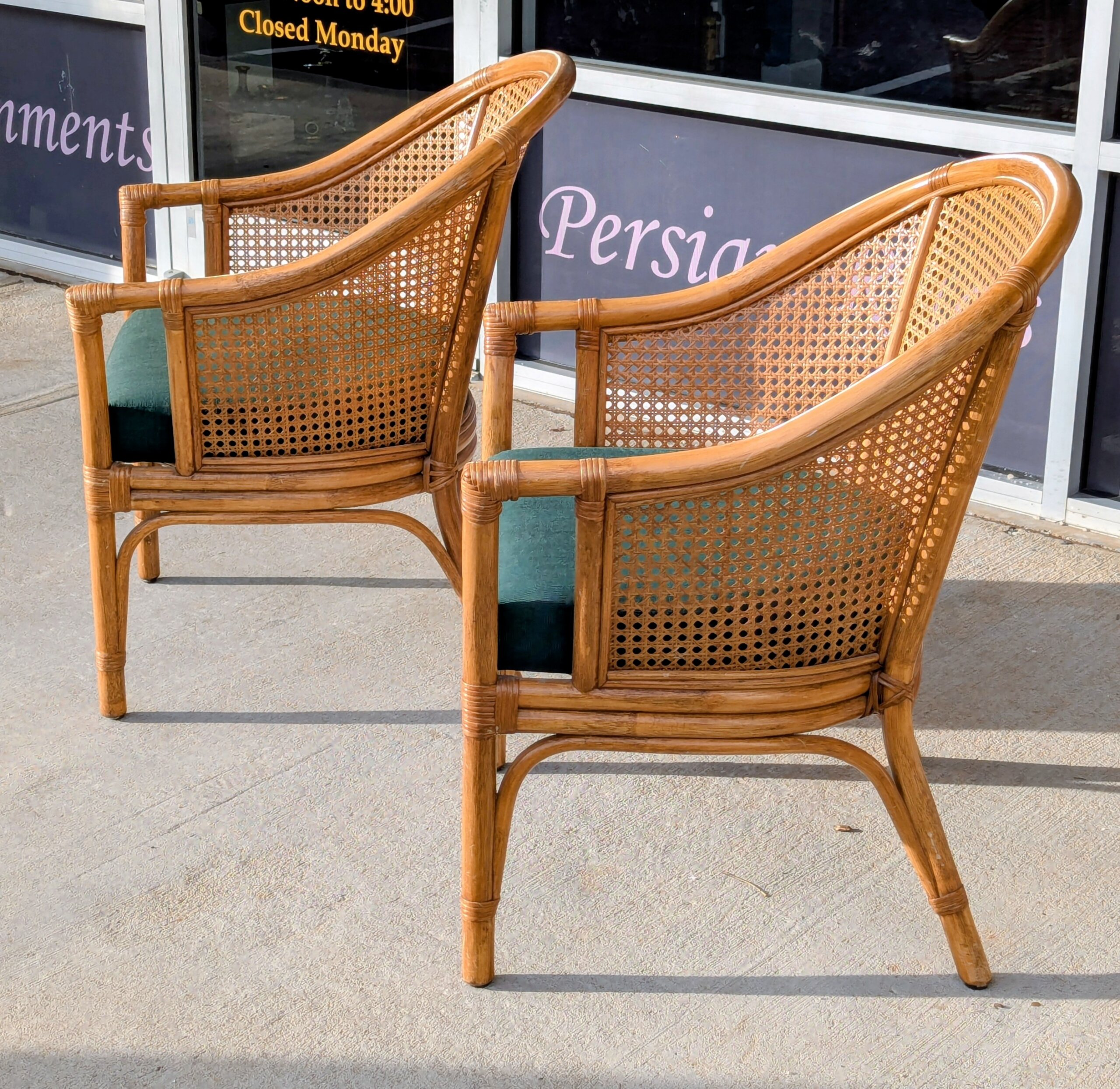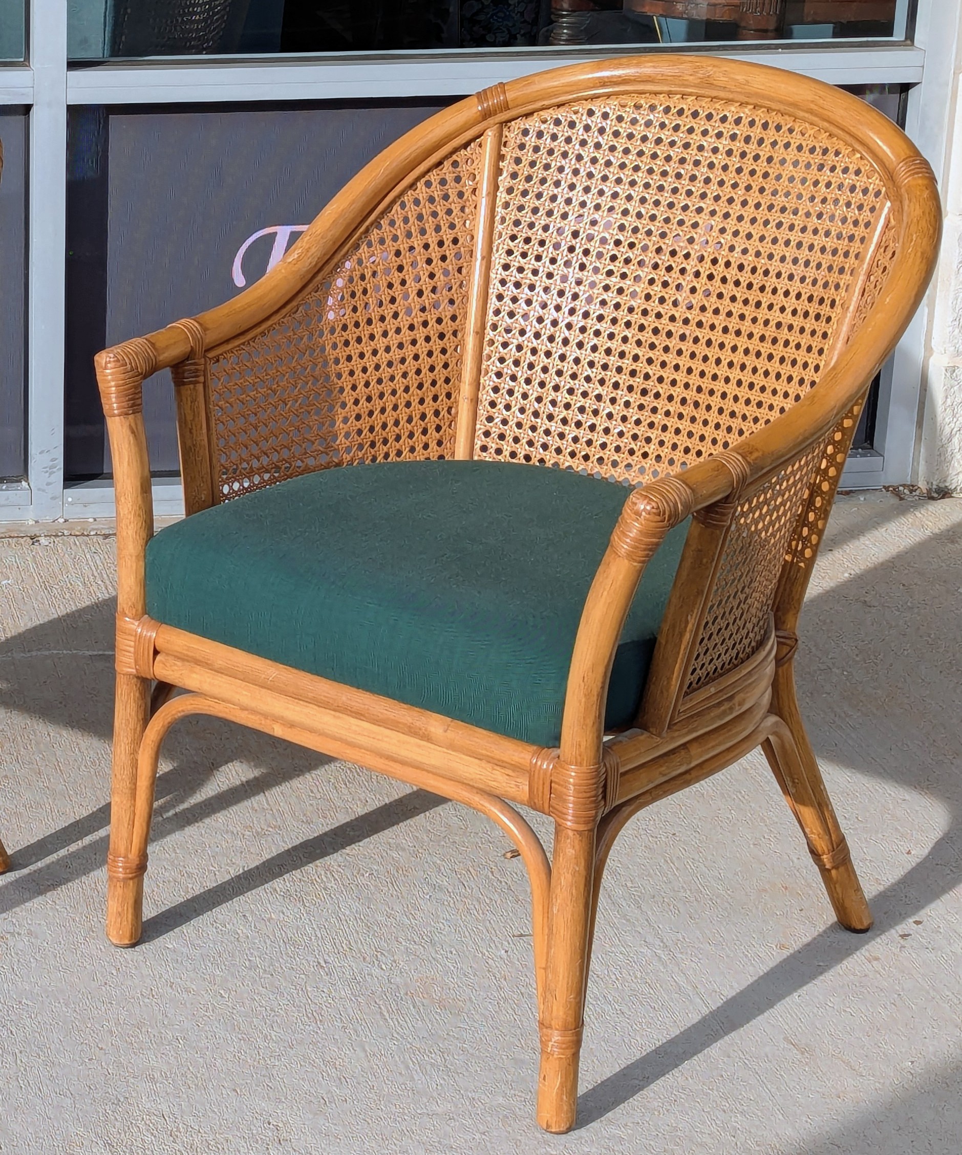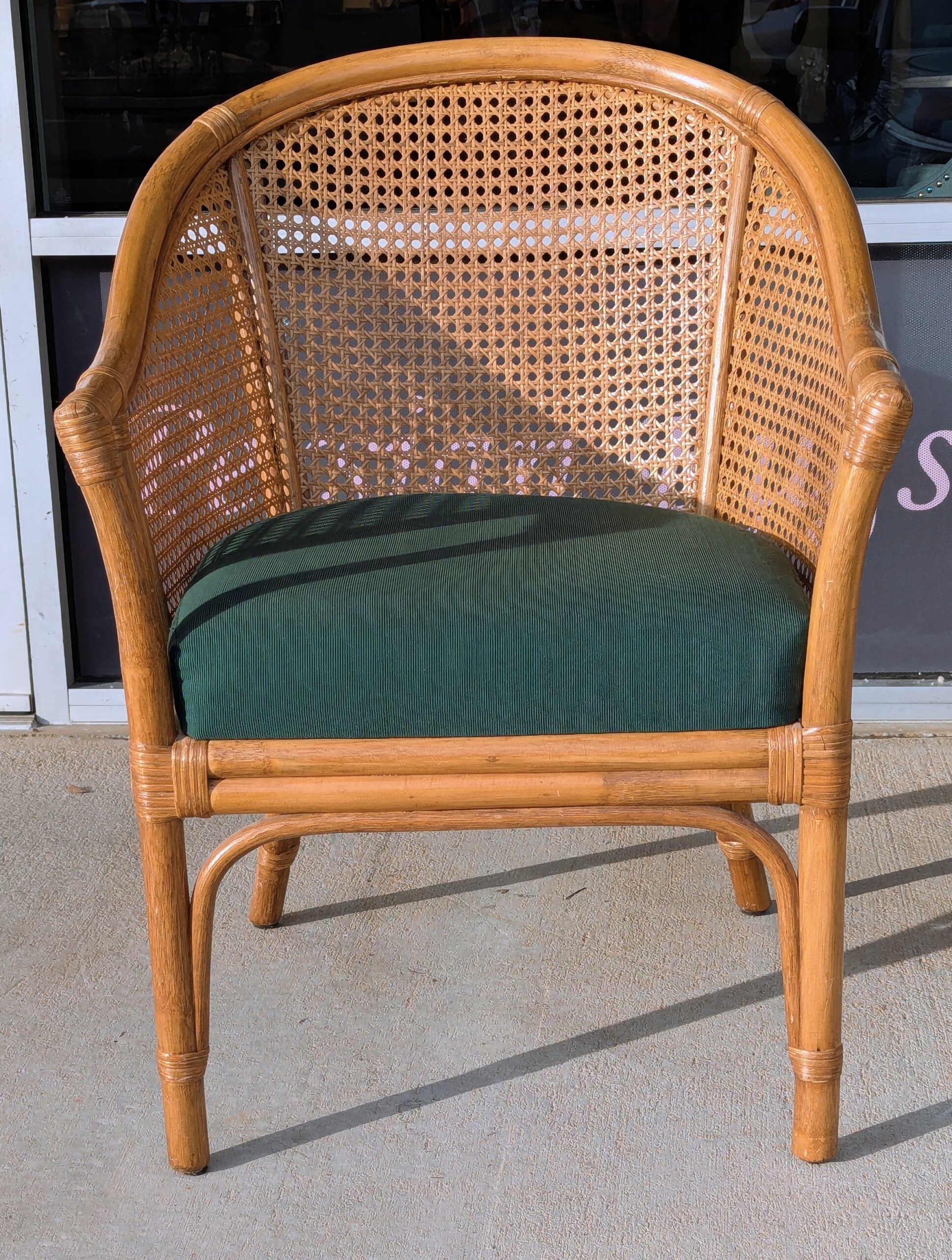 Pair of barrel back style armchairs [ circa 2005] from a recent Chapel Hill estate. Classic styling featuring dark green polished cotton seats with both the rattan and cane work in excellent condition. Sturdy and comfortable!