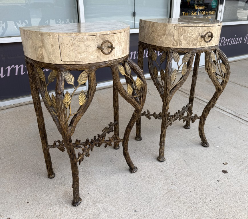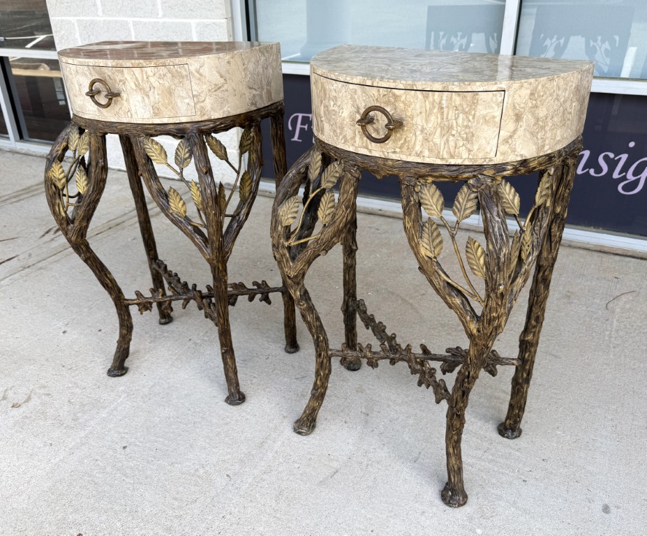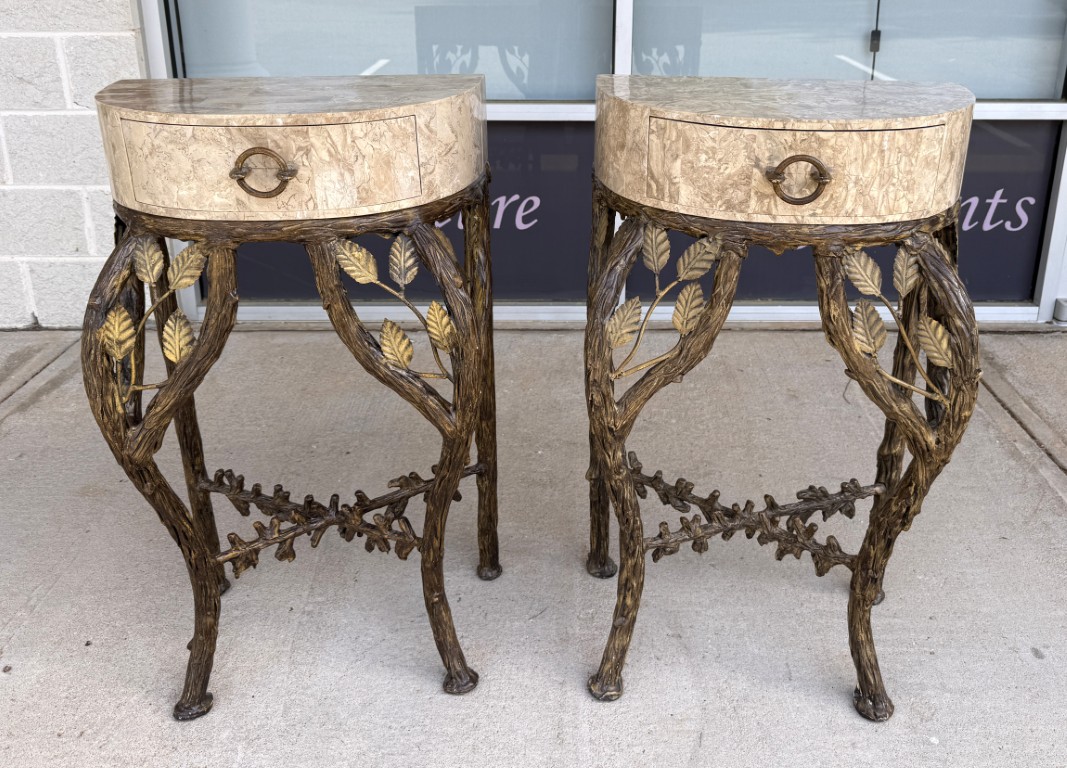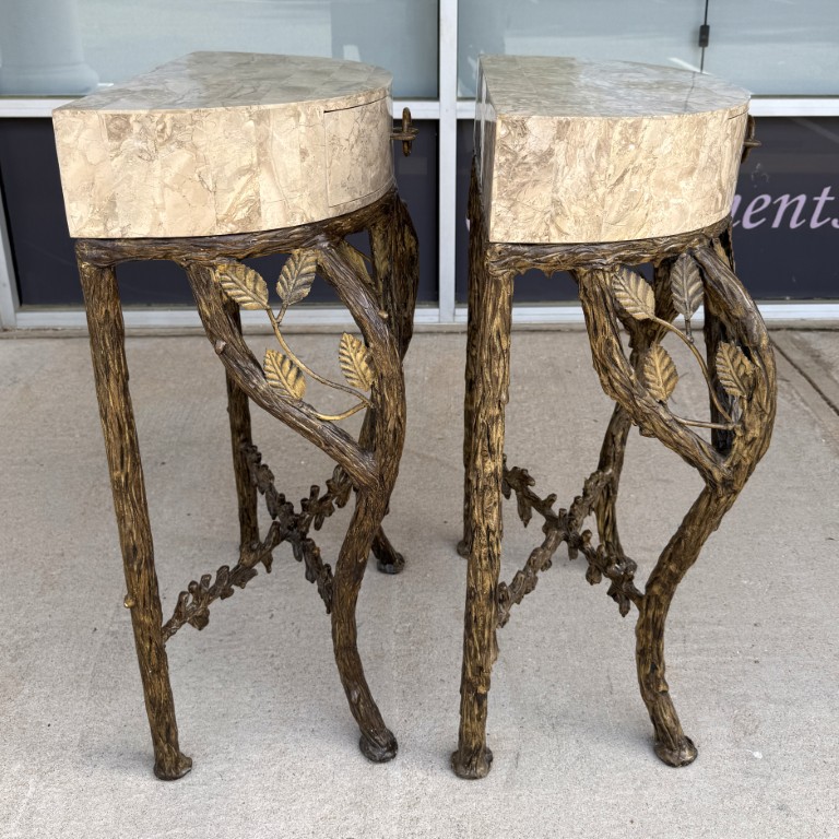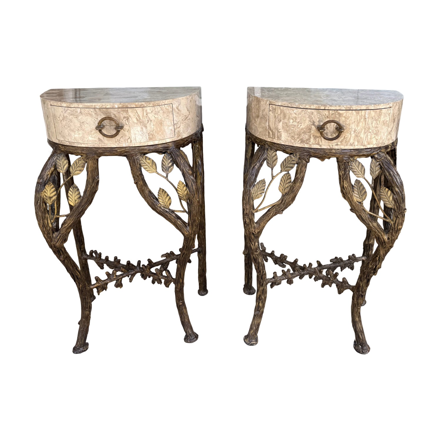This striking pair of tessellated faux marble one-drawer tables features demi-lune tops with beautifully veined surfaces, each fitted with a single storage drawer accented by ring pulls. The sculptural metal bases, designed as intertwined tree branches with gilt leaf details, add an organic, nature-inspired elegance that makes these tables true statement pieces.