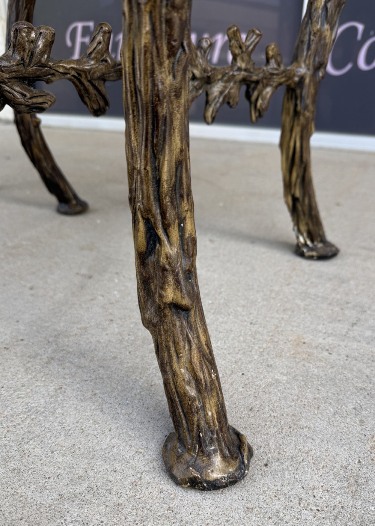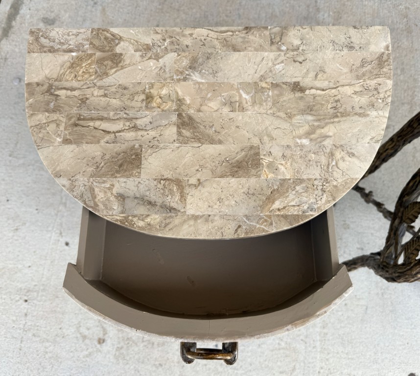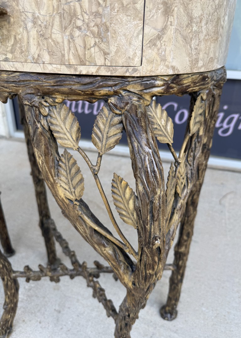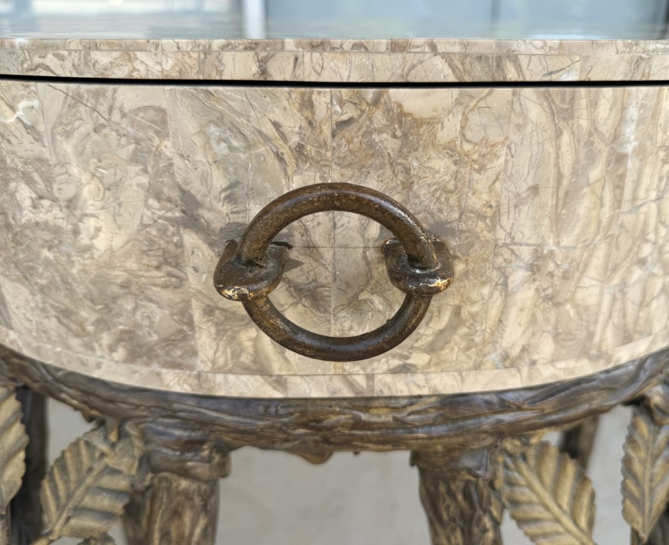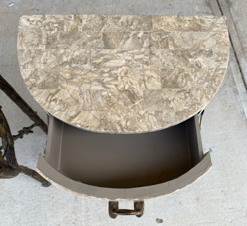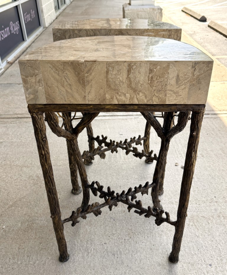 This striking pair of tessellated faux marble one-drawer tables features demi-lune tops with beautifully veined surfaces, each fitted with a single storage drawer accented by ring pulls. The sculptural metal bases, designed as intertwined tree branches with gilt leaf details, add an organic, nature-inspired elegance that makes these tables true statement pieces.