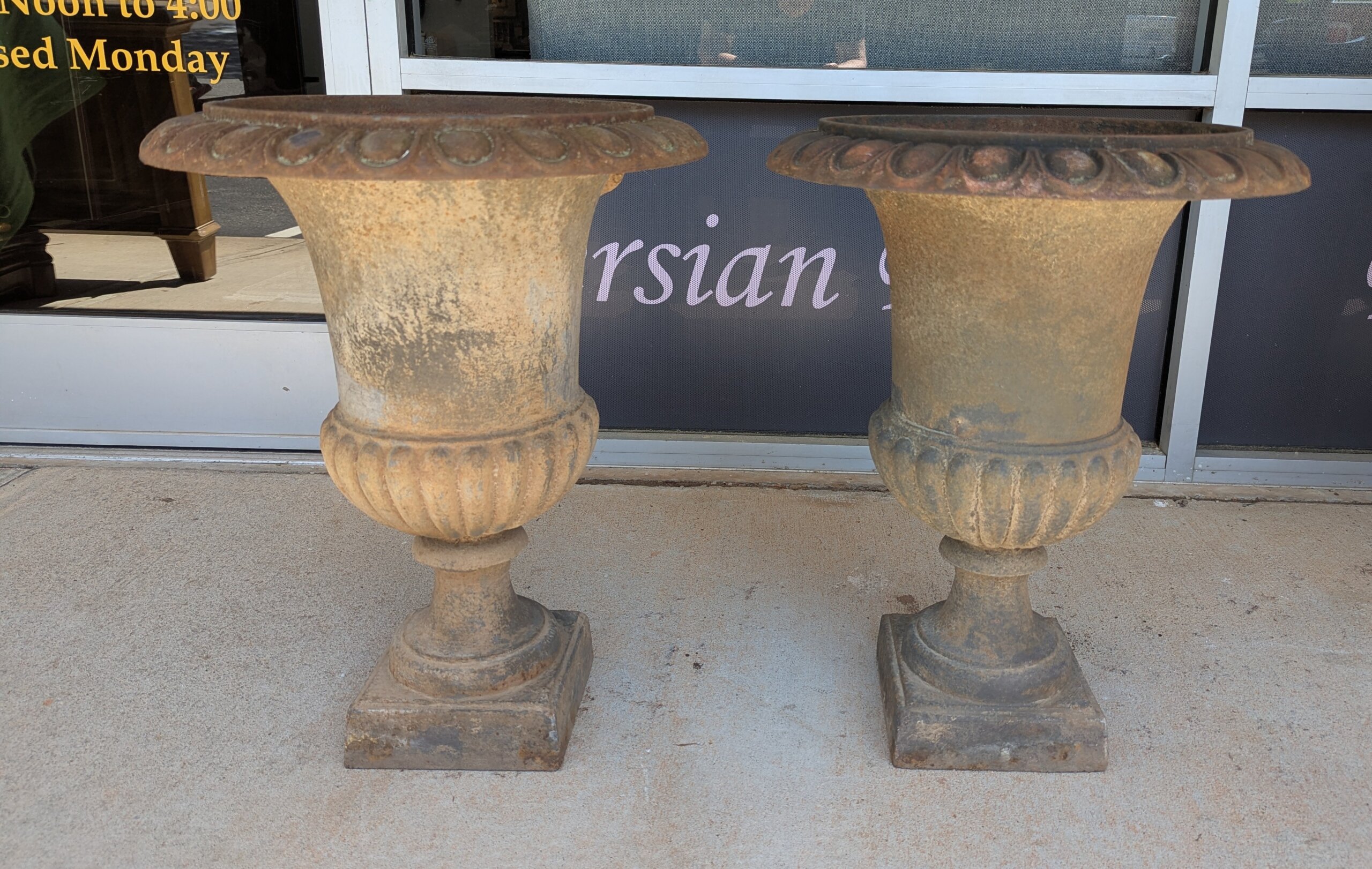 Your happiness with this item is of the utmost importance to us so please review the photographs carefully for condition. We endeavor to try and list any issues we may observe; we may not necessarily note all minor nicks and dings or we may simply miss something. Please inspect carefully to ensure your full happiness with this item. The urns are in excellent estate condition showing only minor rust and light wear.