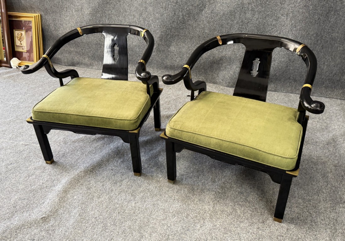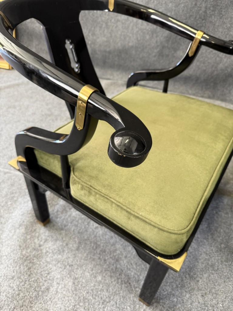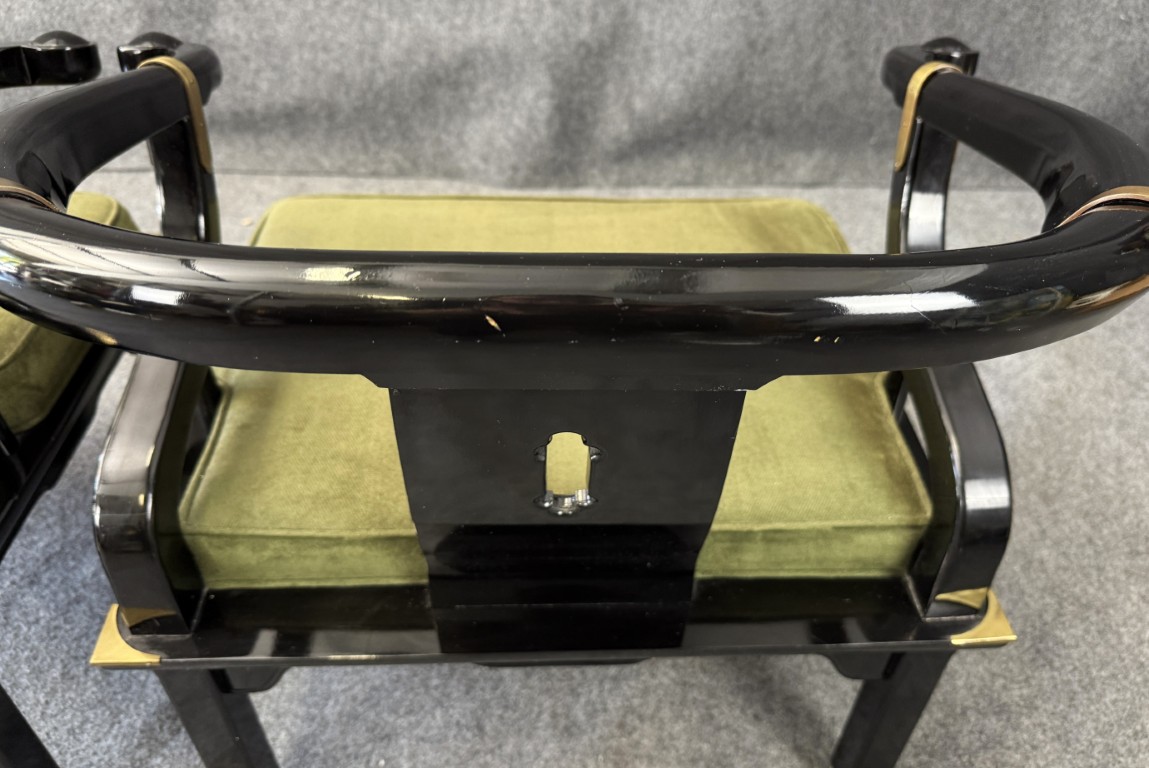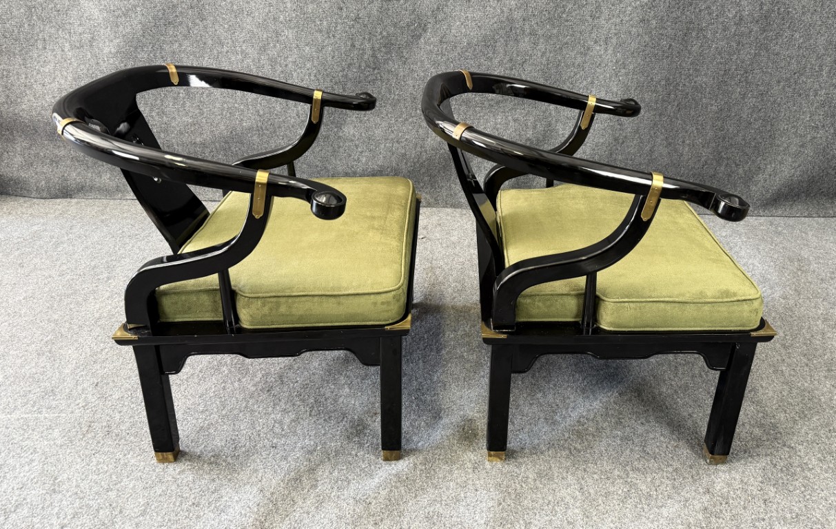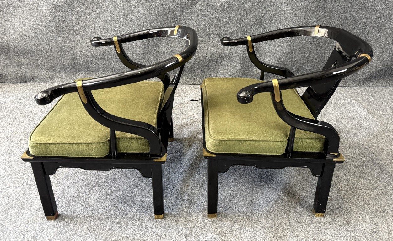 This striking pair of vintage James Mont-style horseshoe chairs features a high-gloss black lacquer finish accented by brass fittings and olive green upholstered cushions. Their sculptural curved backs and Asian-inspired silhouette embody the bold, glamorous aesthetic for which Mont was known.