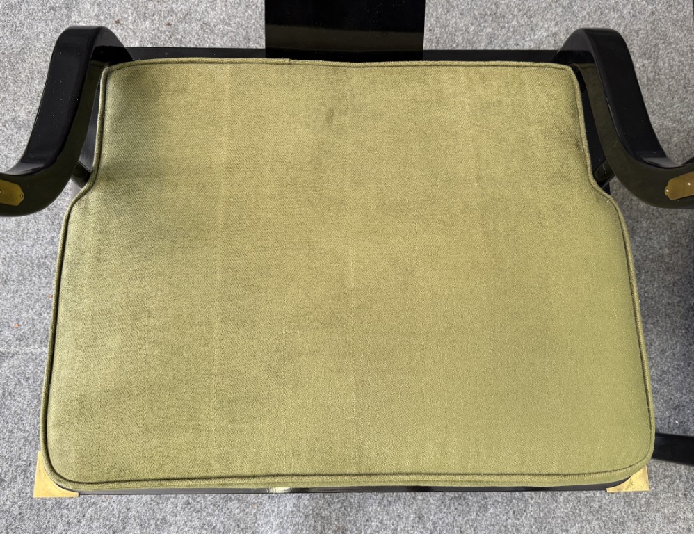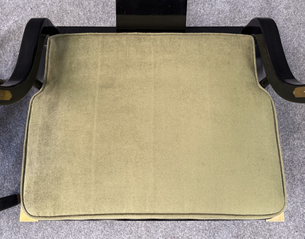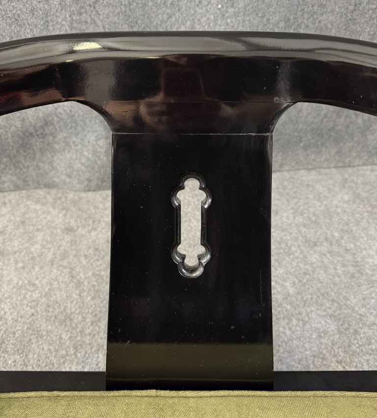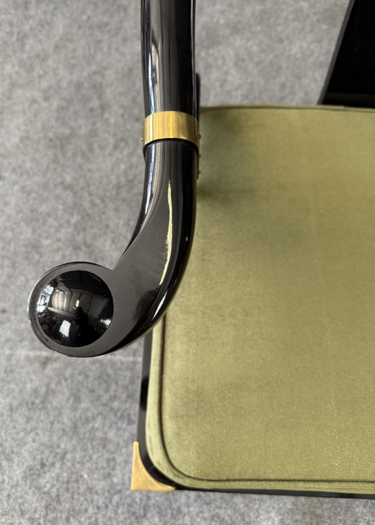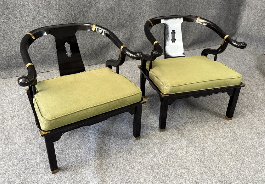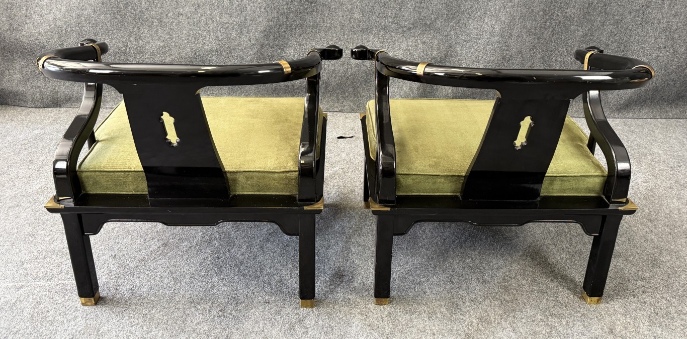 This striking pair of vintage James Mont-style horseshoe chairs features a high-gloss black lacquer finish accented by brass fittings and olive green upholstered cushions. Their sculptural curved backs and Asian-inspired silhouette embody the bold, glamorous aesthetic for which Mont was known.
