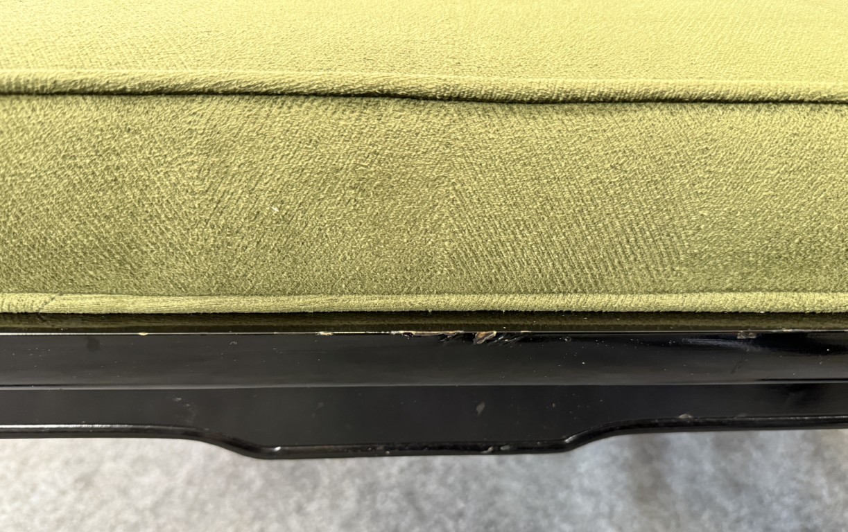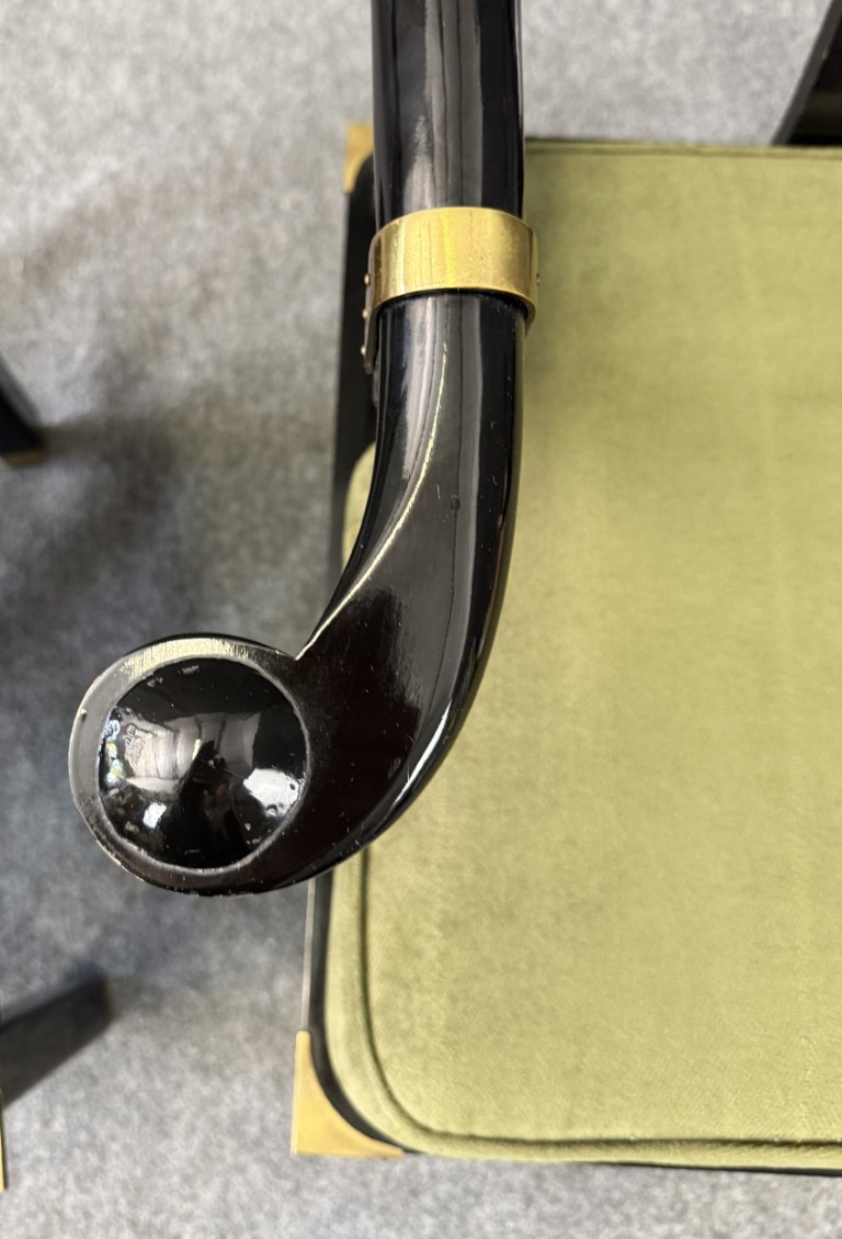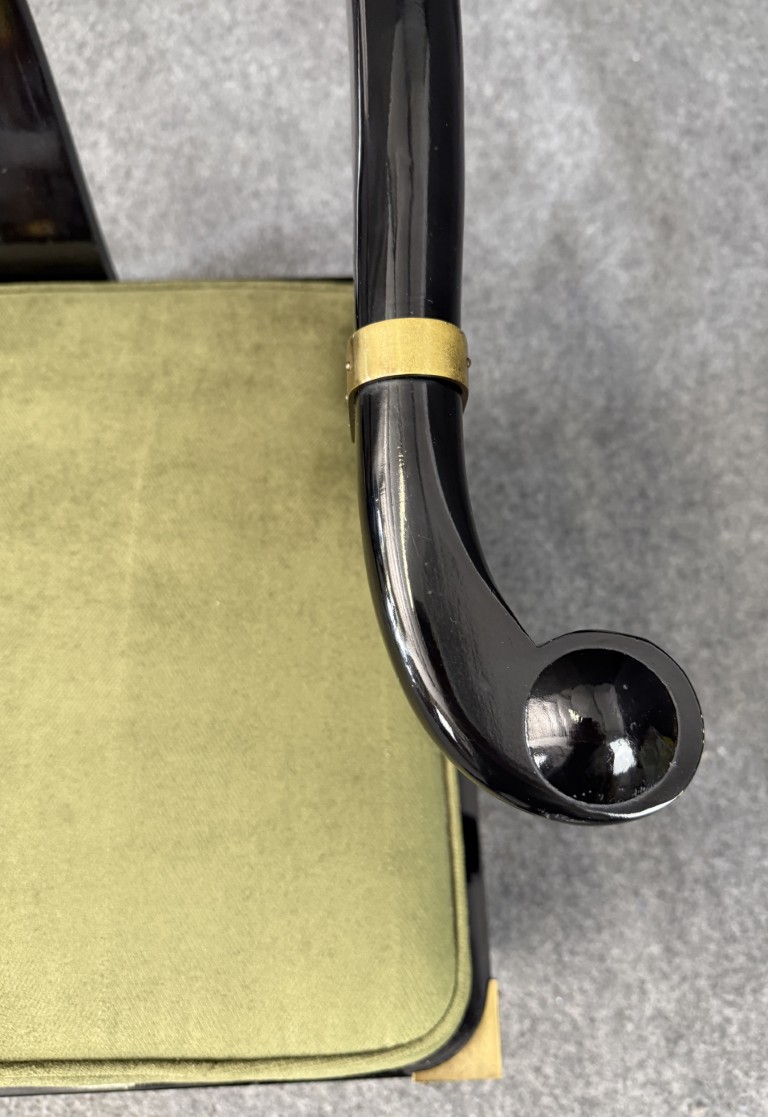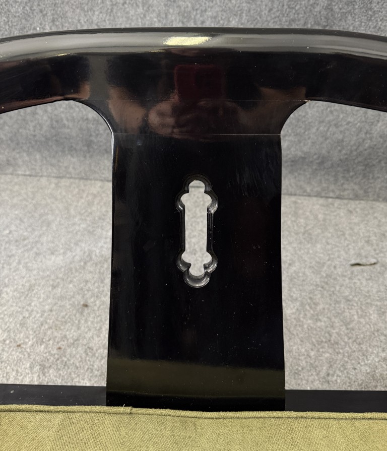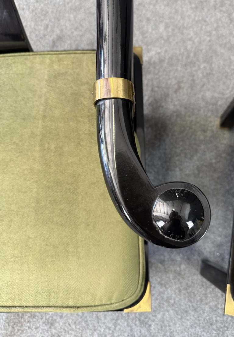 This striking pair of vintage James Mont-style horseshoe chairs features a high-gloss black lacquer finish accented by brass fittings and olive green upholstered cushions. Their sculptural curved backs and Asian-inspired silhouette embody the bold, glamorous aesthetic for which Mont was known.