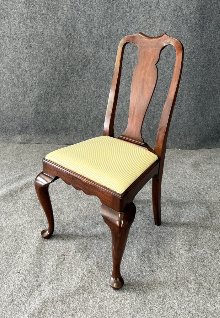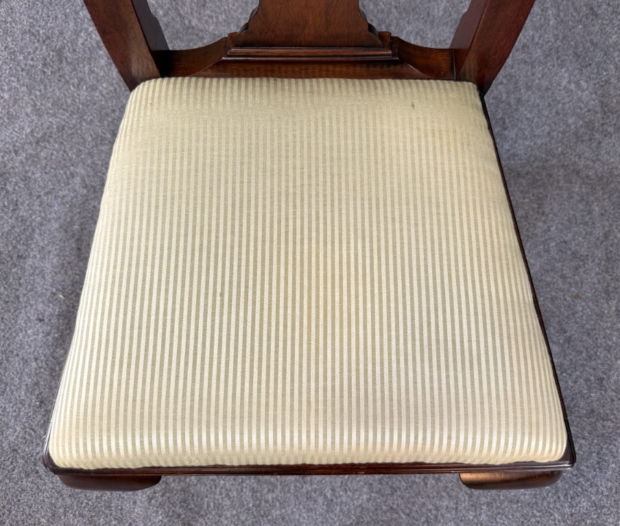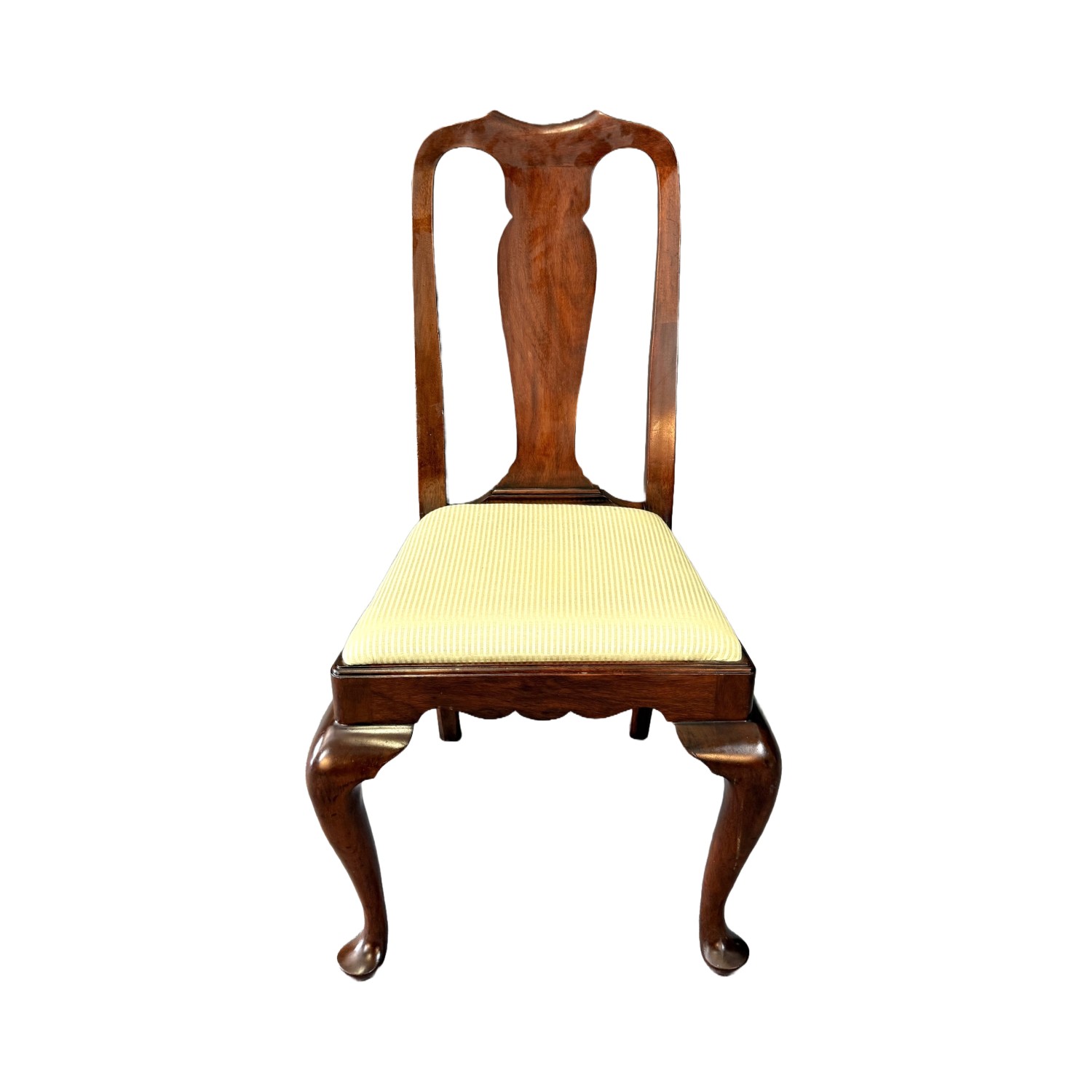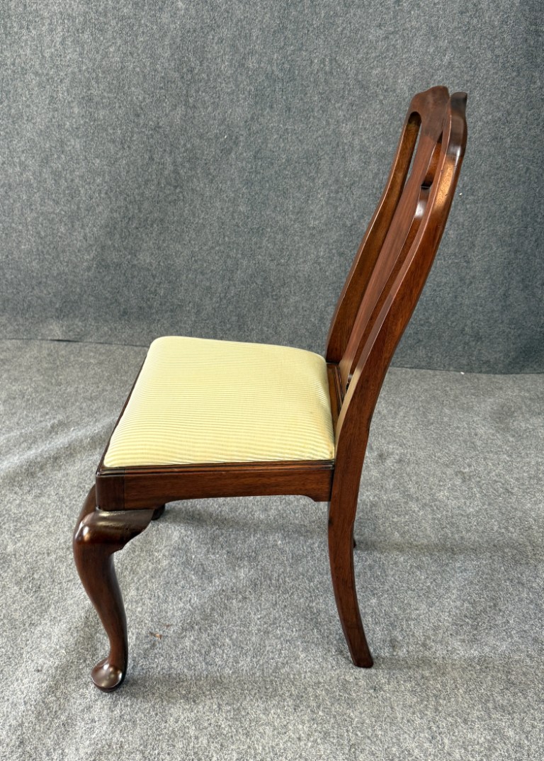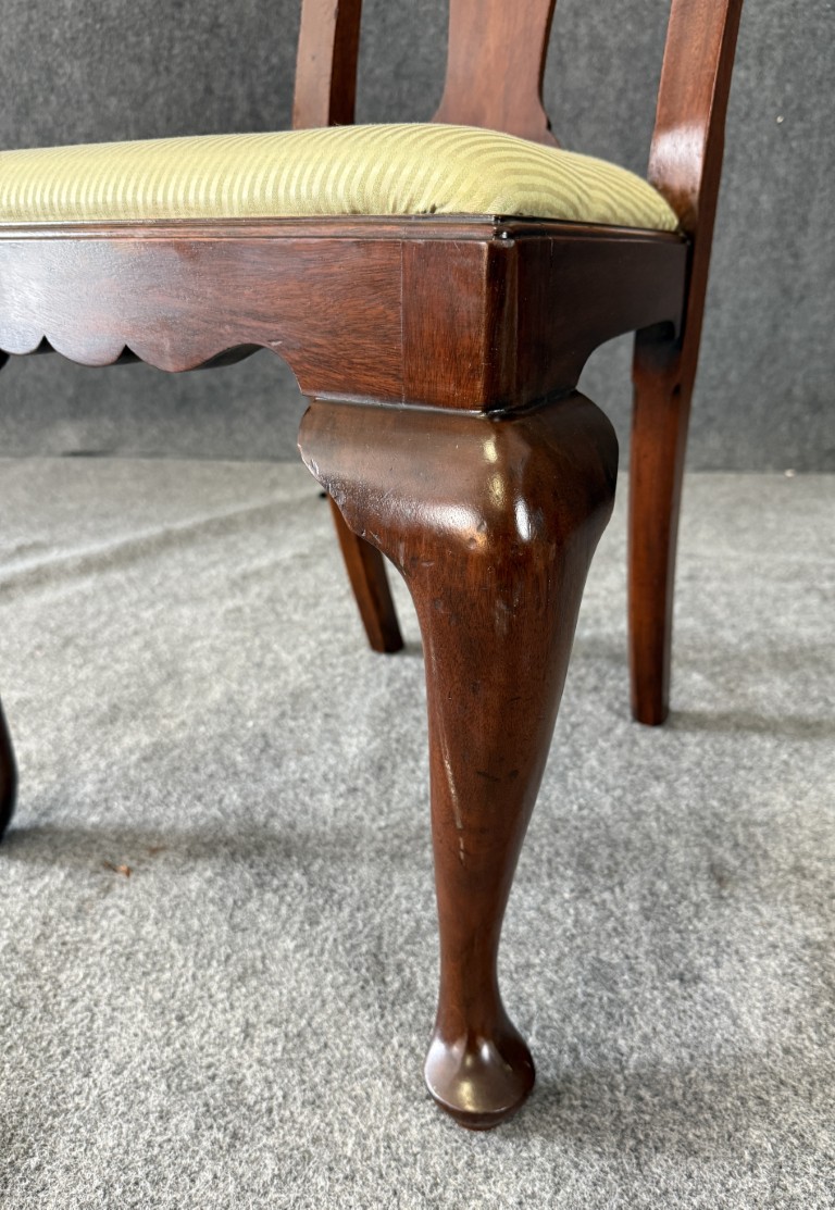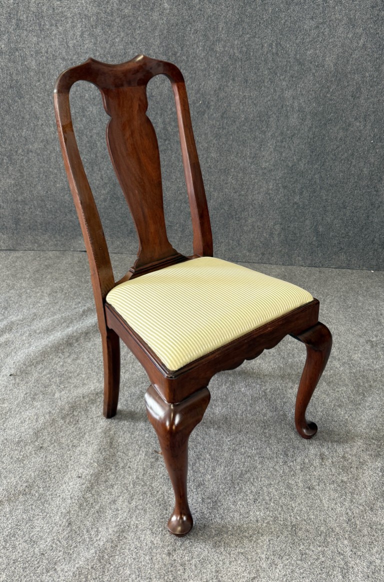This Queen Anne mahogany side chair features a vase-shaped splat and cabriole legs with pad feet, showcasing refined 18th-century inspired design. The seat is upholstered in pale green striped fabric, offering a soft contrast to the rich mahogany frame.