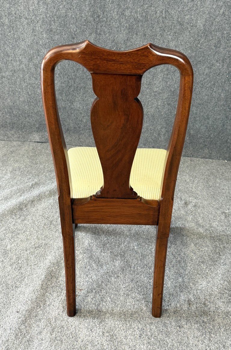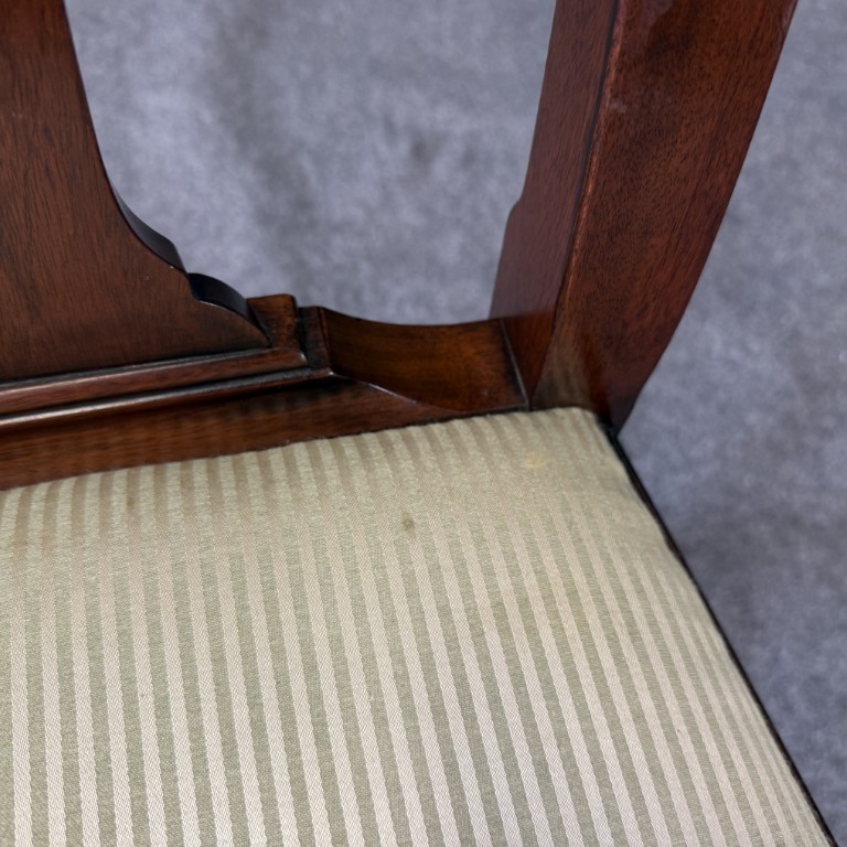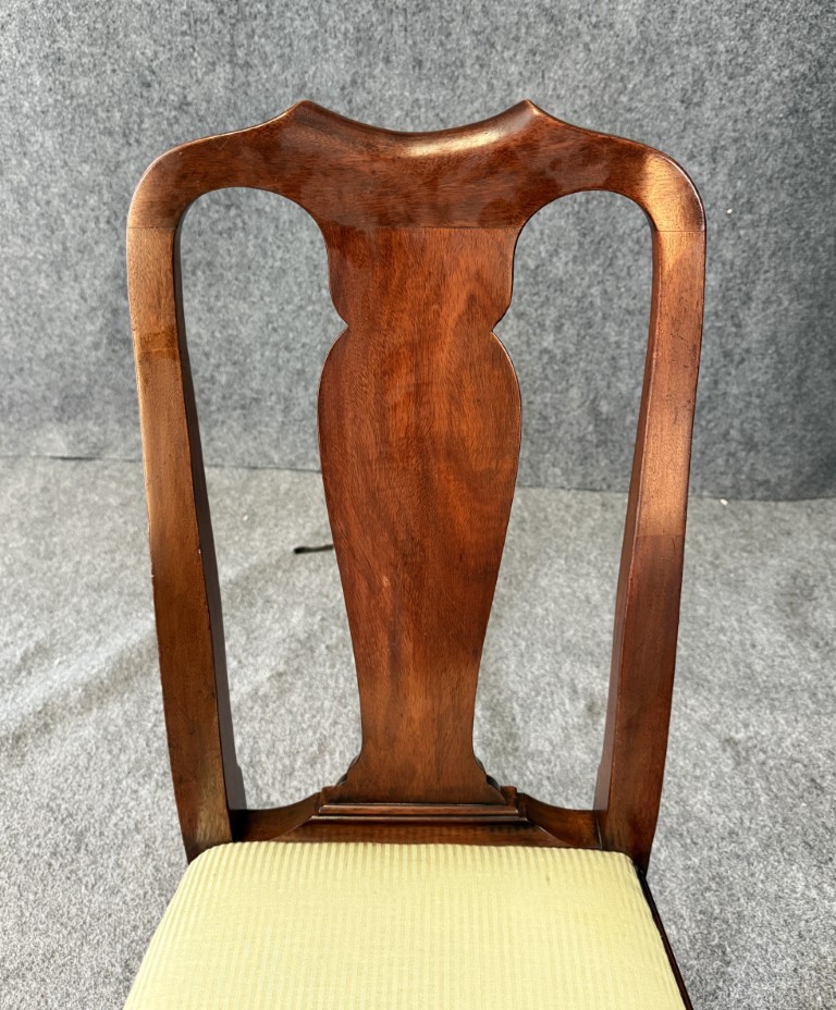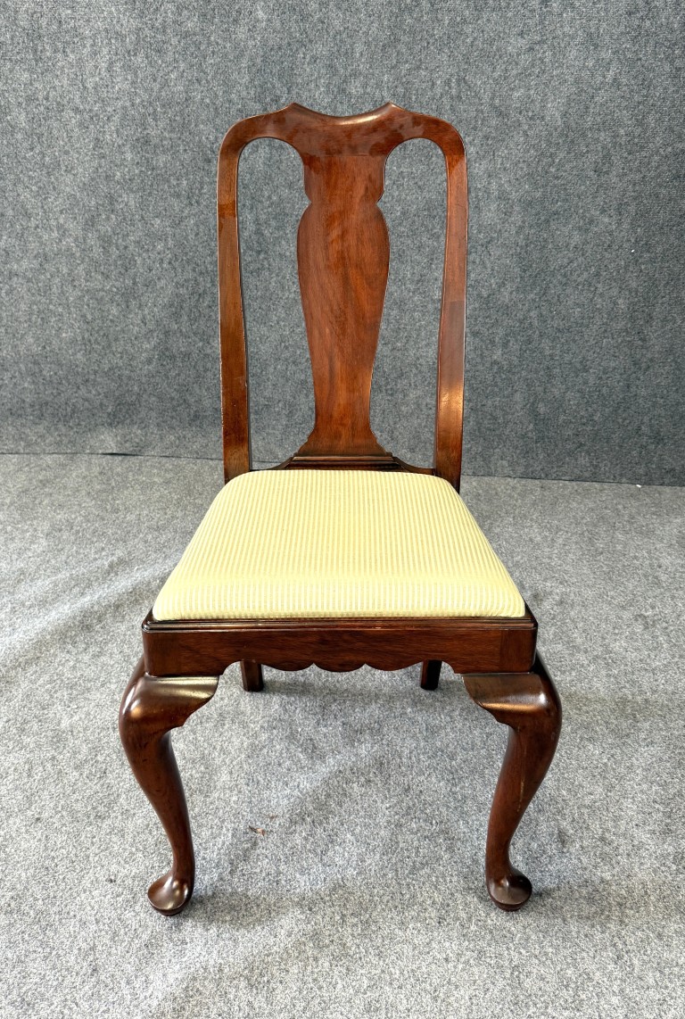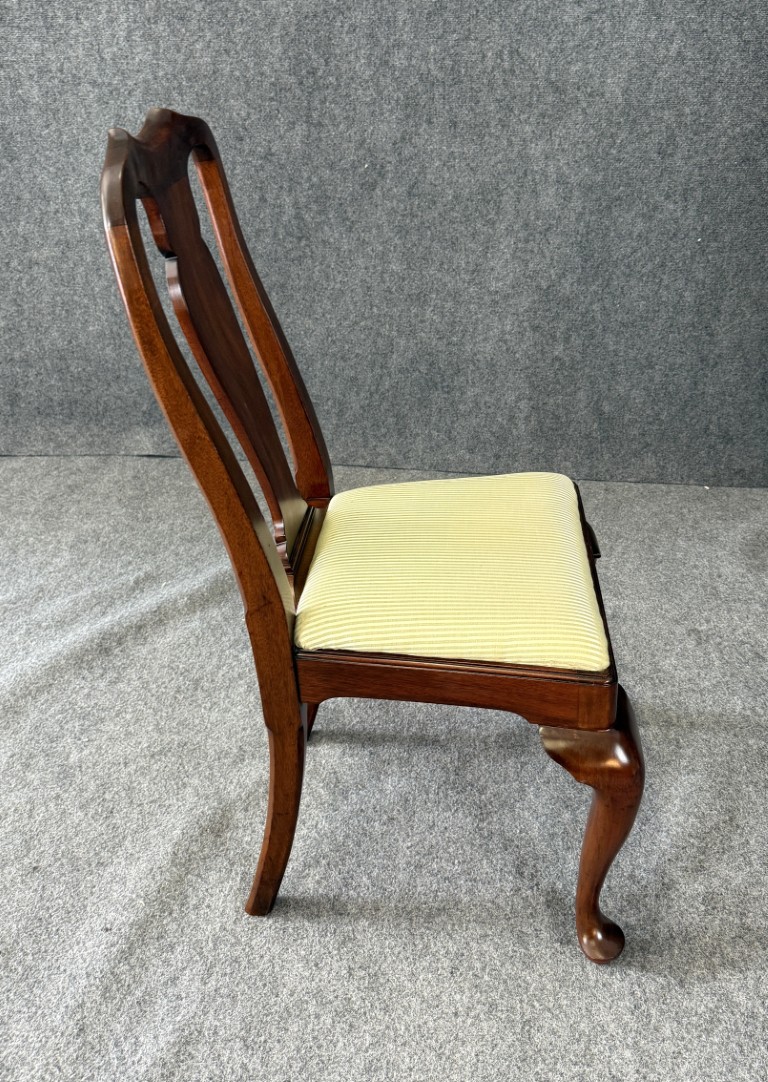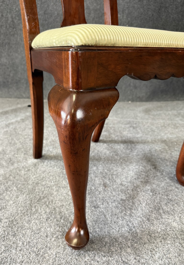 This Queen Anne mahogany side chair features a vase-shaped splat and cabriole legs with pad feet, showcasing refined 18th-century inspired design. The seat is upholstered in pale green striped fabric, offering a soft contrast to the rich mahogany frame.