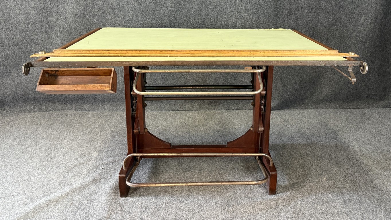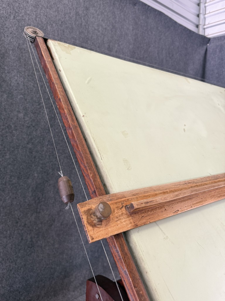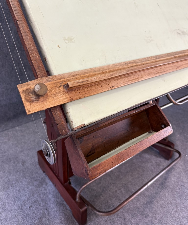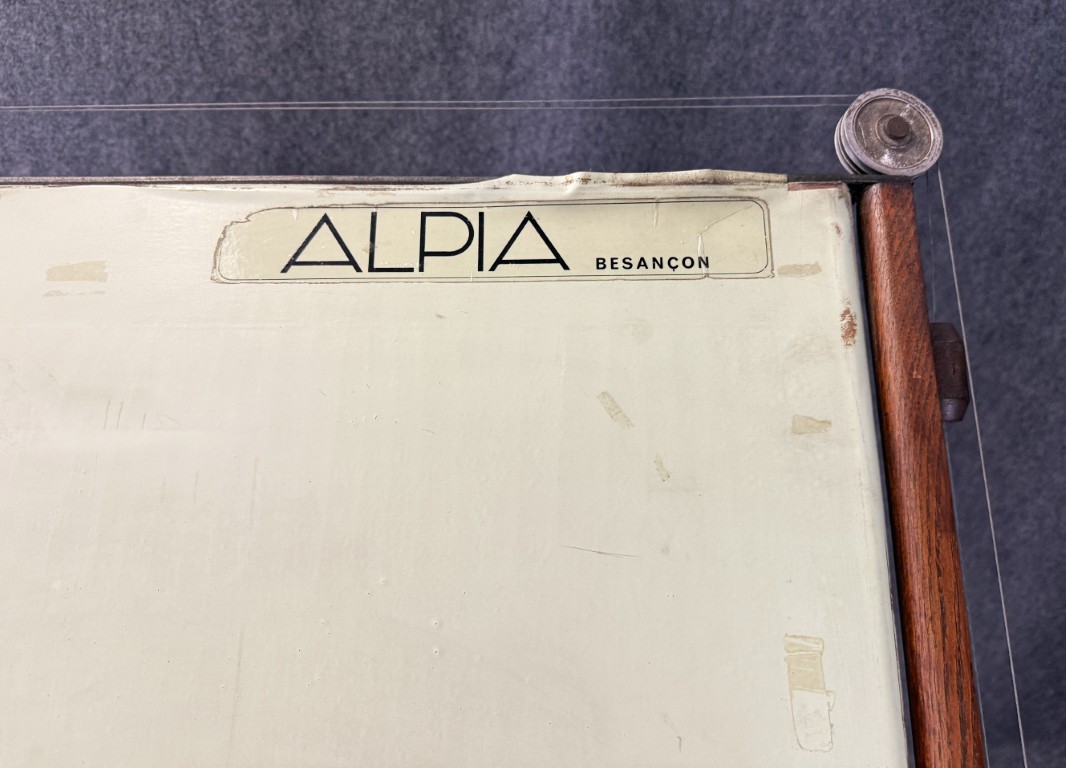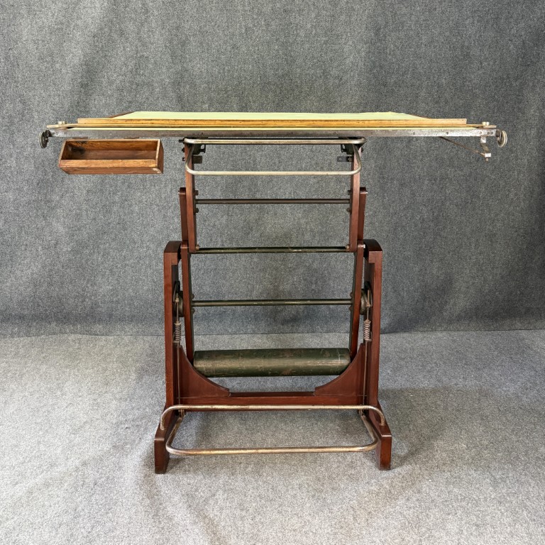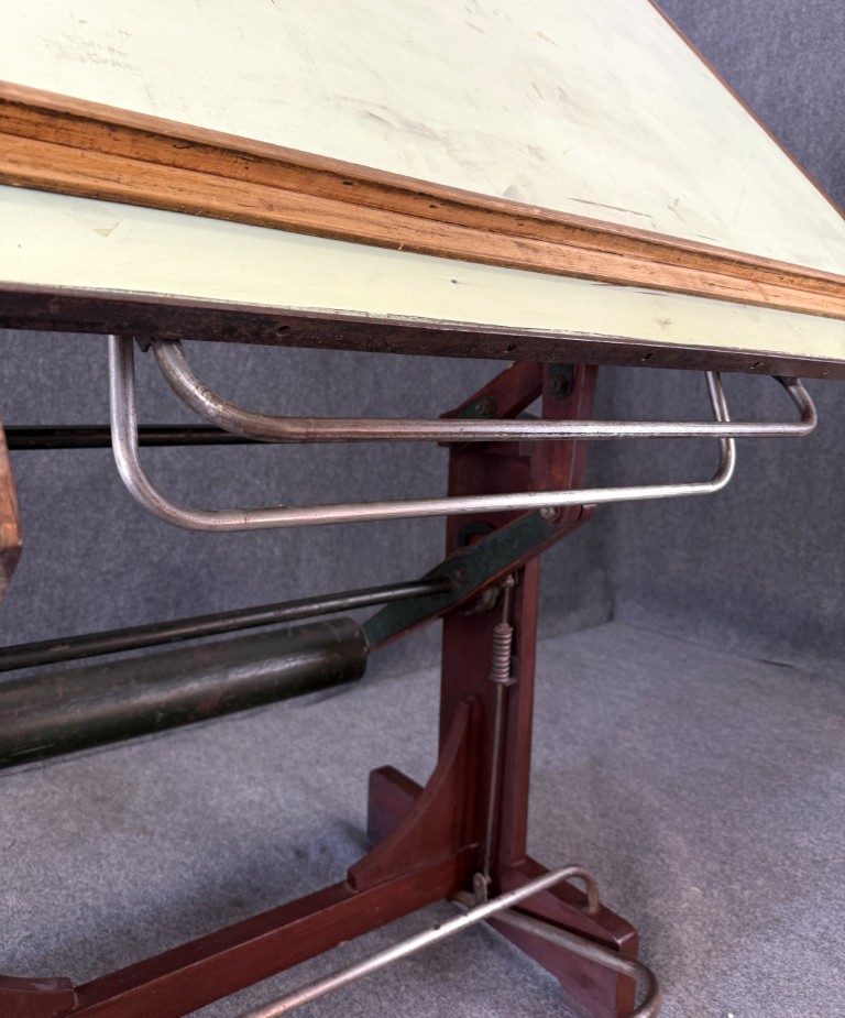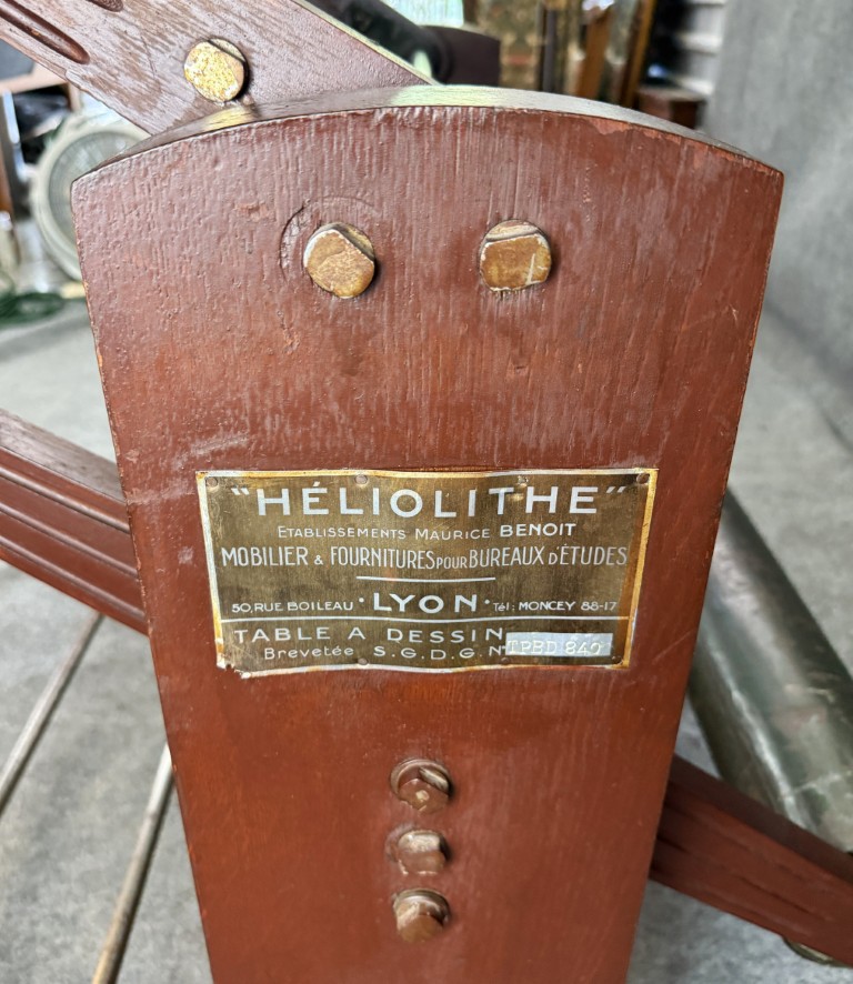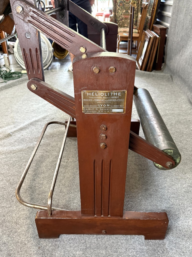 This is a rare early-20th-century French architect’s drafting table by Héliolithe, a renowned Lyon-based manufacturer of professional drawing furniture. The table features a counterweighted adjustable tilting top mounted on a beechwood base with decorative vertical carvings and chrome-plated steel supports. Its expansive drafting surface is fitted with an Alpia parallel motion mechanism, a precision instrument also made in France. Dating from roughly the 1930s–1960s, this piece reflects the refined industrial craftsmanship once found in Europe’s architectural ateliers and engineering offices.