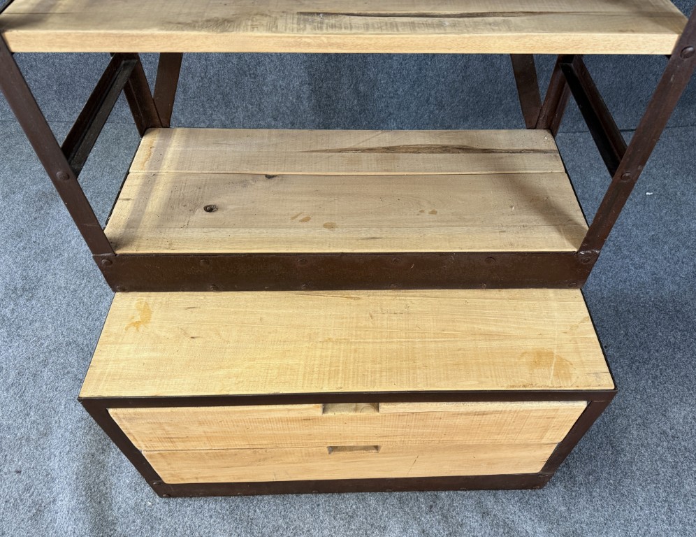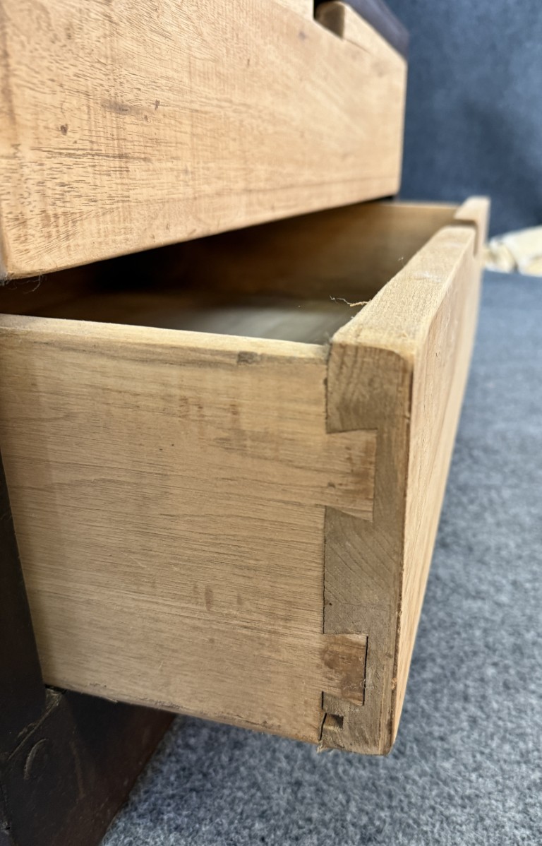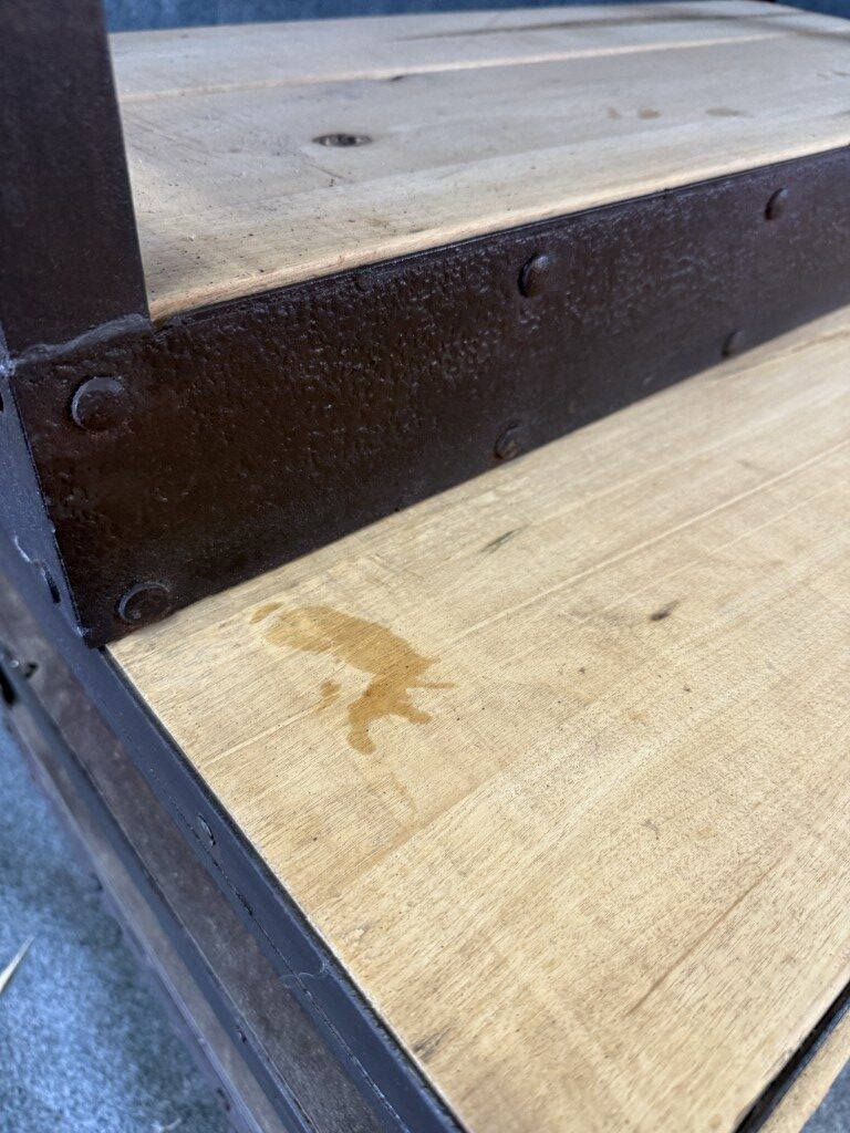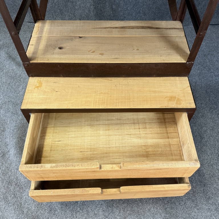 Your happiness with this item is of the utmost importance to us so please review the photographs carefully for condition. We endeavor to try and list any issues we may observe; we may not necessarily note all minor nicks and dings or we may simply miss something. Please inspect carefully to ensure your full happiness with this item. For this particular piece we found wear consistent with age and prior use, including a water stain on the top of one. Given its handmade and hand-finished nature, variations in the wood or metal work are to be expected and celebrated; each item is unique and no two are exactly alike.