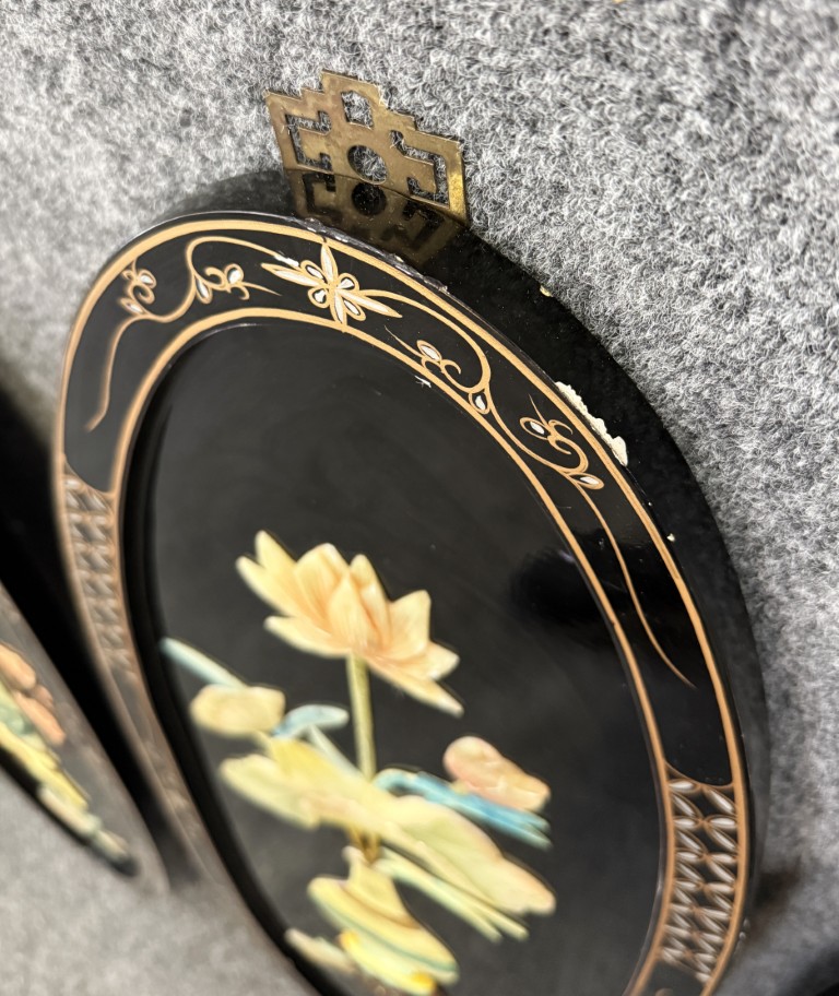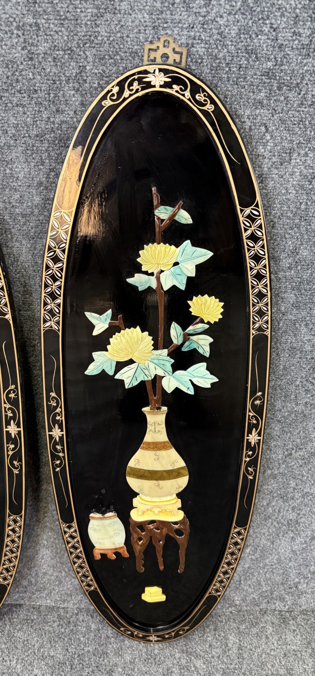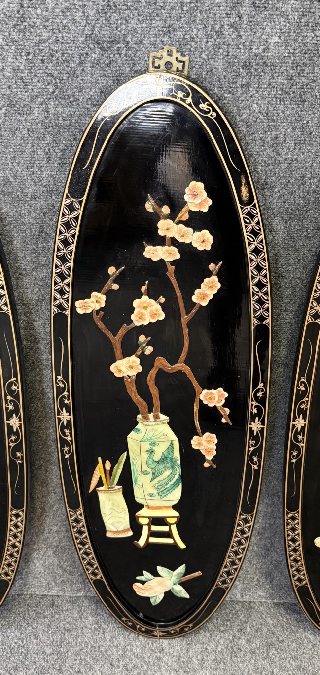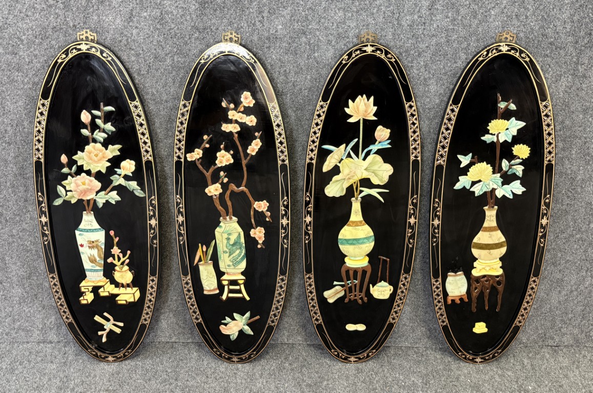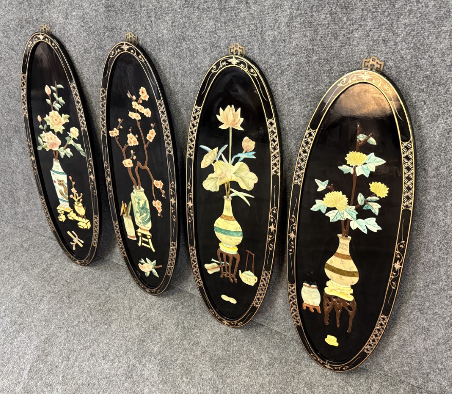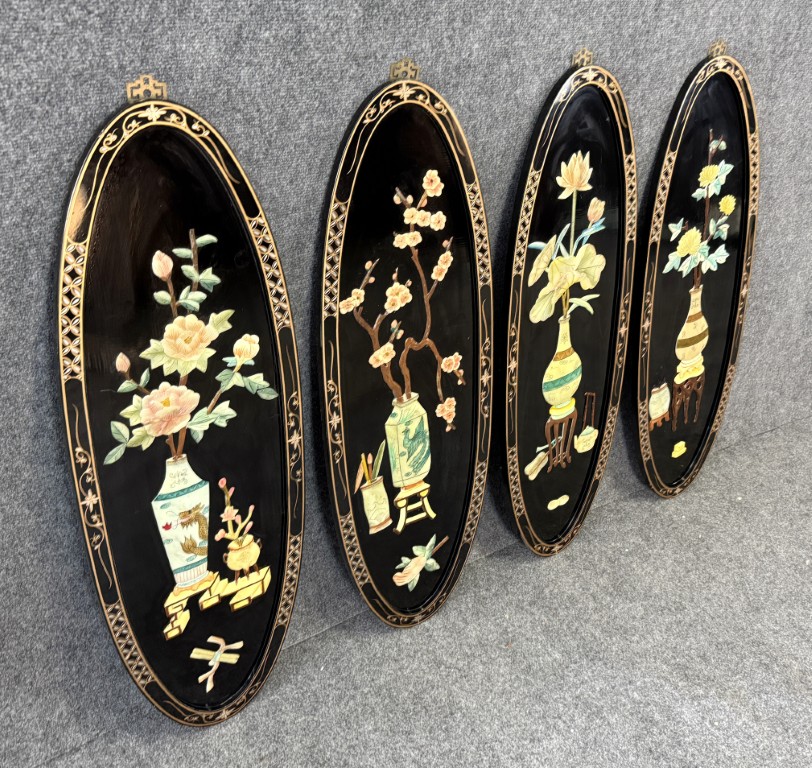 Set of 4 Asian Lacquered Wall Panels with Mother-of-Pearl Floral Designs