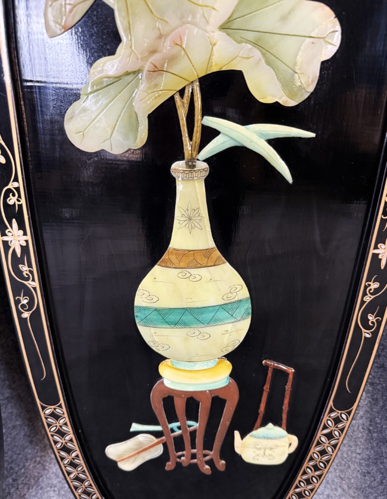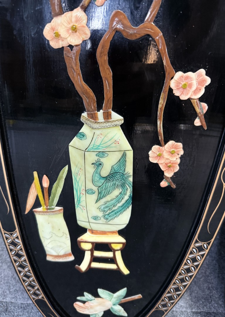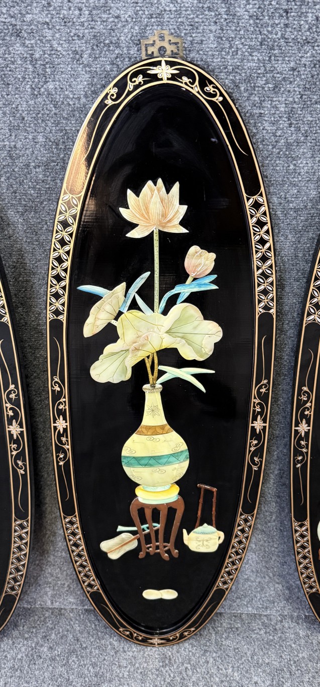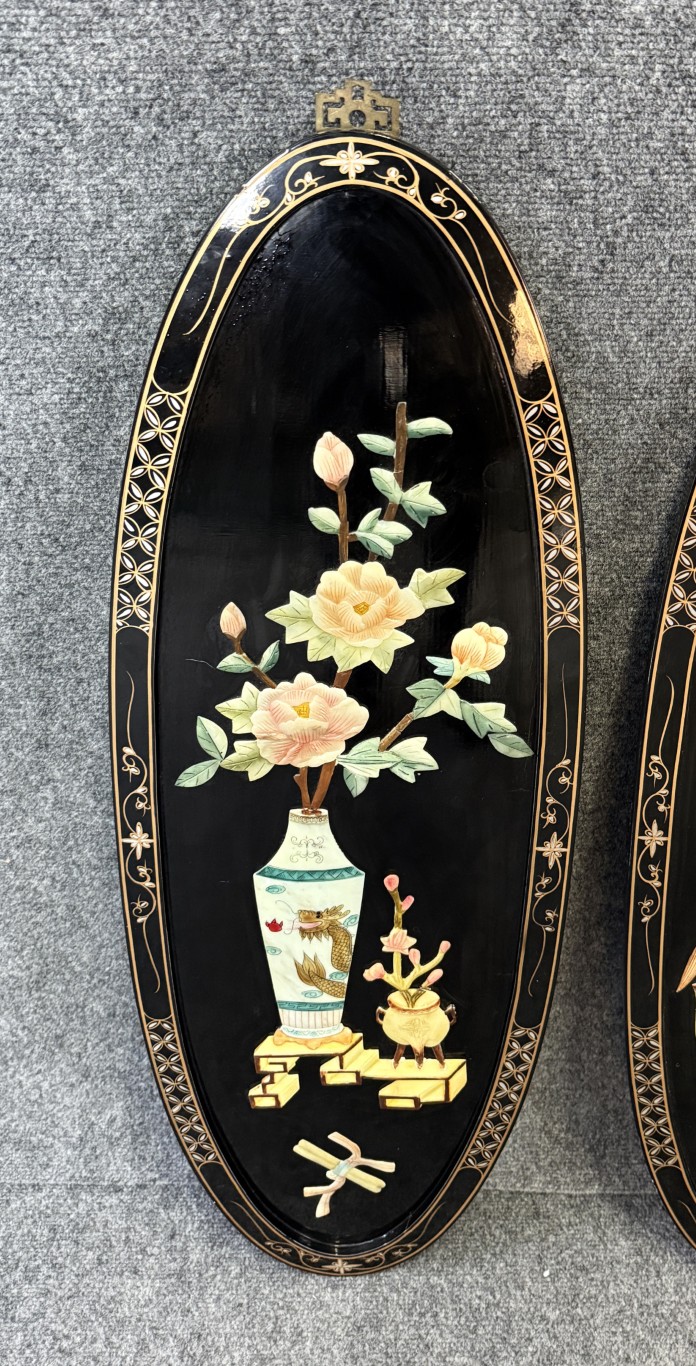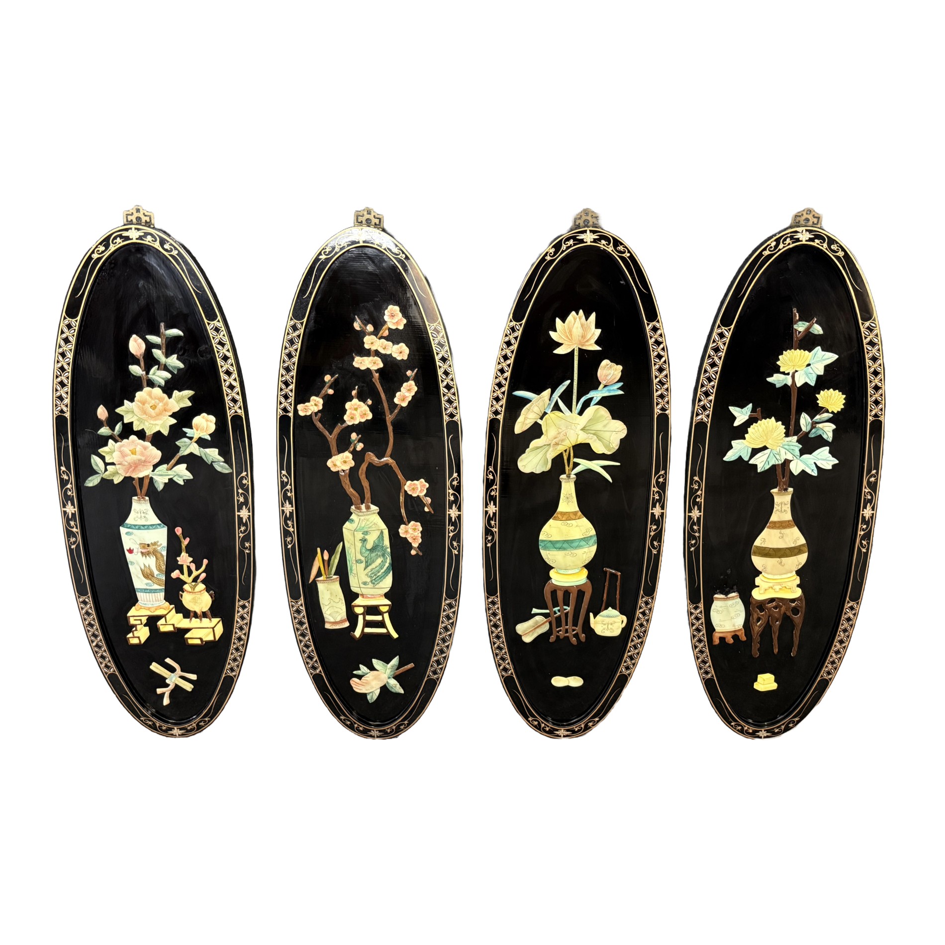 Set of 4 Asian Lacquered Wall Panels with Mother-of-Pearl Floral Designs