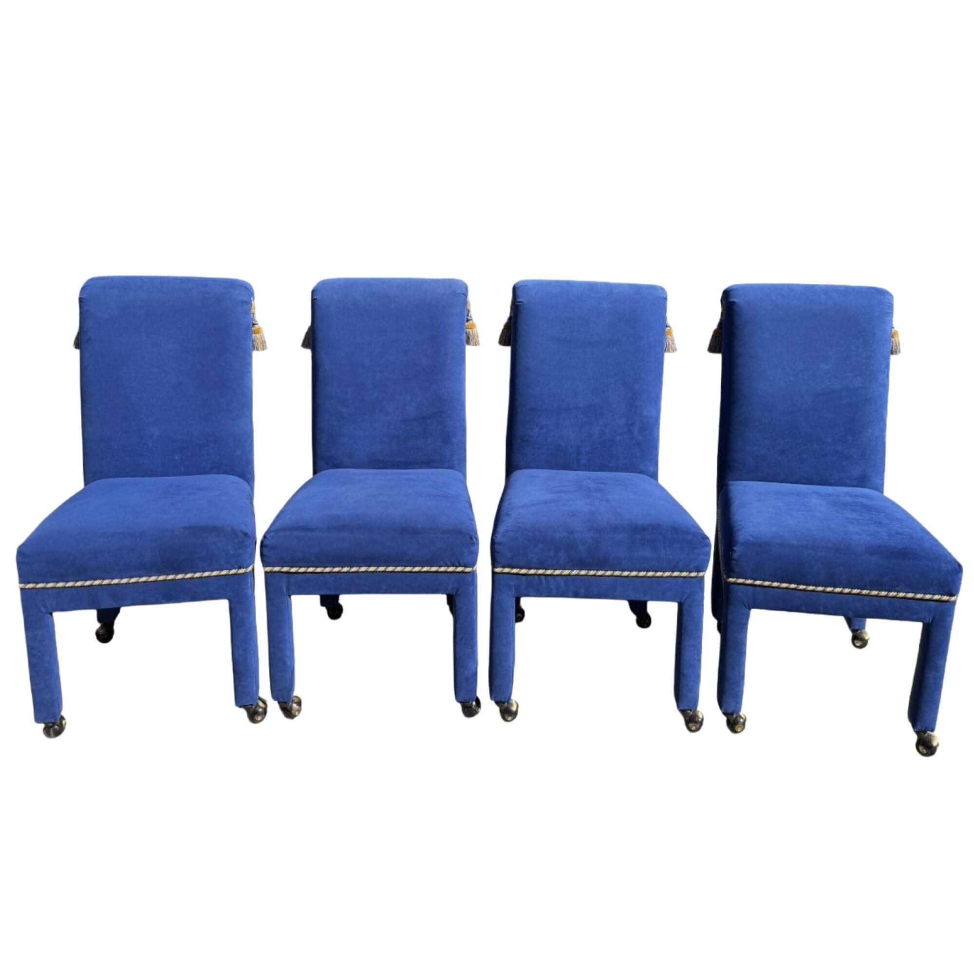 The four royal blue upholstered chairs bring a touch of opulence, highlighted by gold-and-blue cord trim and decorative tassels at each rolled back. Elegant and theatrical, this set perfectly blends vintage glamour with modern flair.