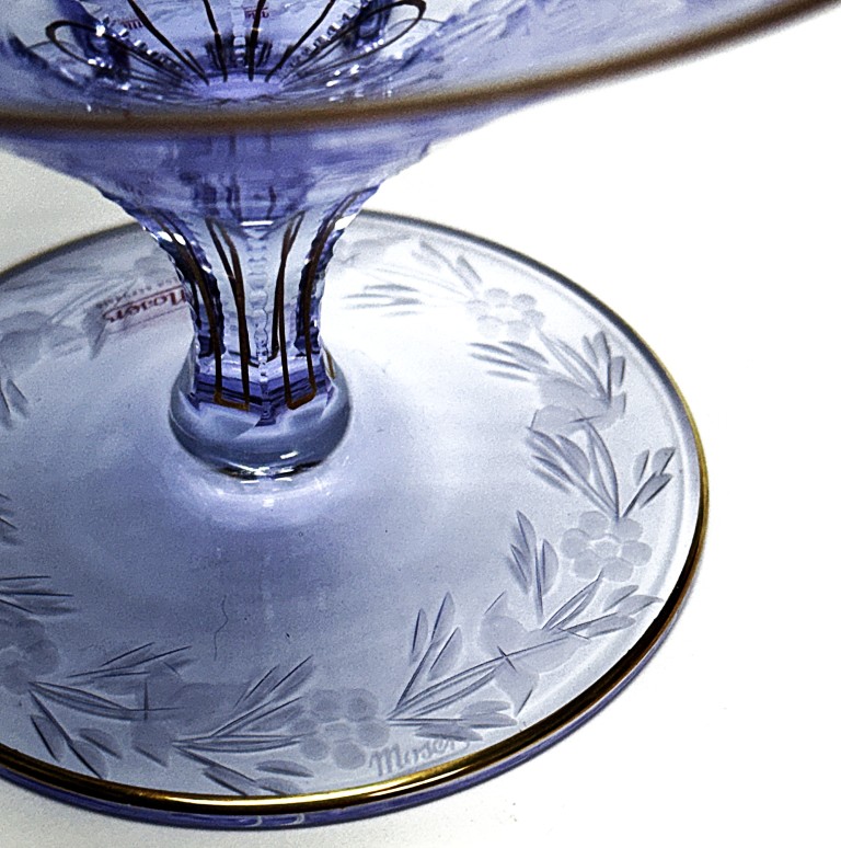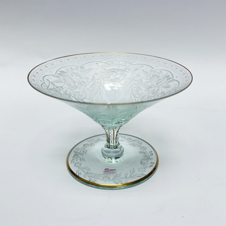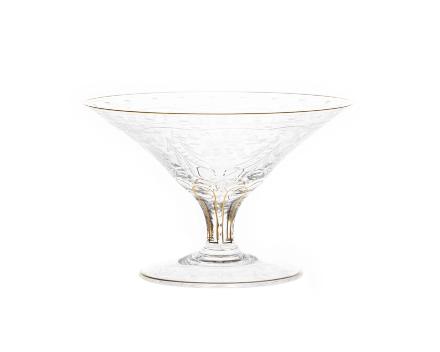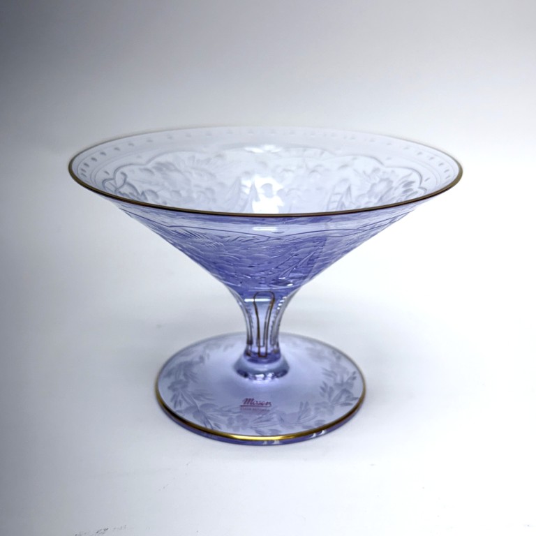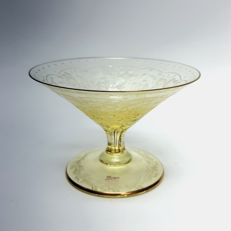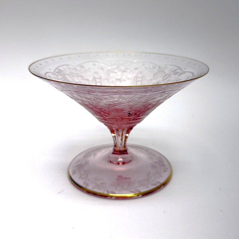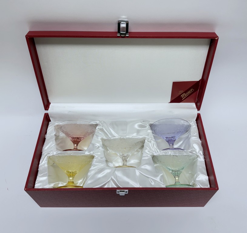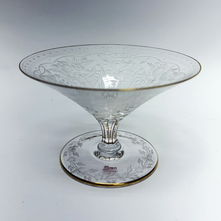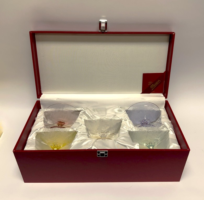 This Set of 5 Moser Handcrafted Crystal Maharani Cocktail / Dessert Coupes is new in box and showcases the collection’s iconic 1895 design, where delicate floral engraving meets Moser’s precise hand-cut crystal accented with 24-carat gold. Part of one of Moser’s most celebrated historic lines, the Maharani collection was created for the wife of the Maharaja of Travancore and later cherished by dignitaries including Sultan Mohammed V of Morocco, Ethiopian Crown Prince Asfa Wossen, President Sukarno of Indonesia, and the royal families of Bahrain and Alirajpur. Luxurious, collectible, and beautifully presented, this set makes an exceptional gift for any connoisseur of fine crystal.