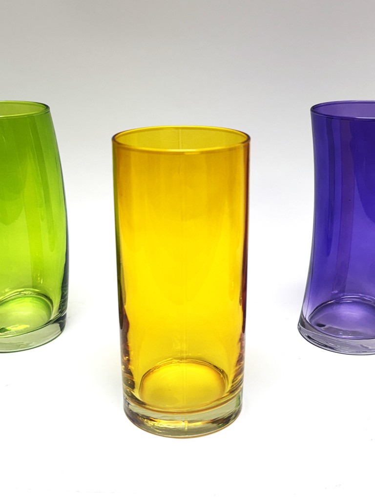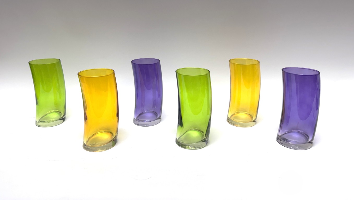 This Set of 6 Colorful Vintage Curved German Highball Glasses features a playful bent silhouette and vibrant hues of green, yellow, and purple, giving each glass a sculptural, mid-century flair. Perfect for cocktails or everyday use, they bring a cheerful burst of color and personality to any bar or table setting.
