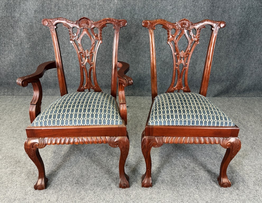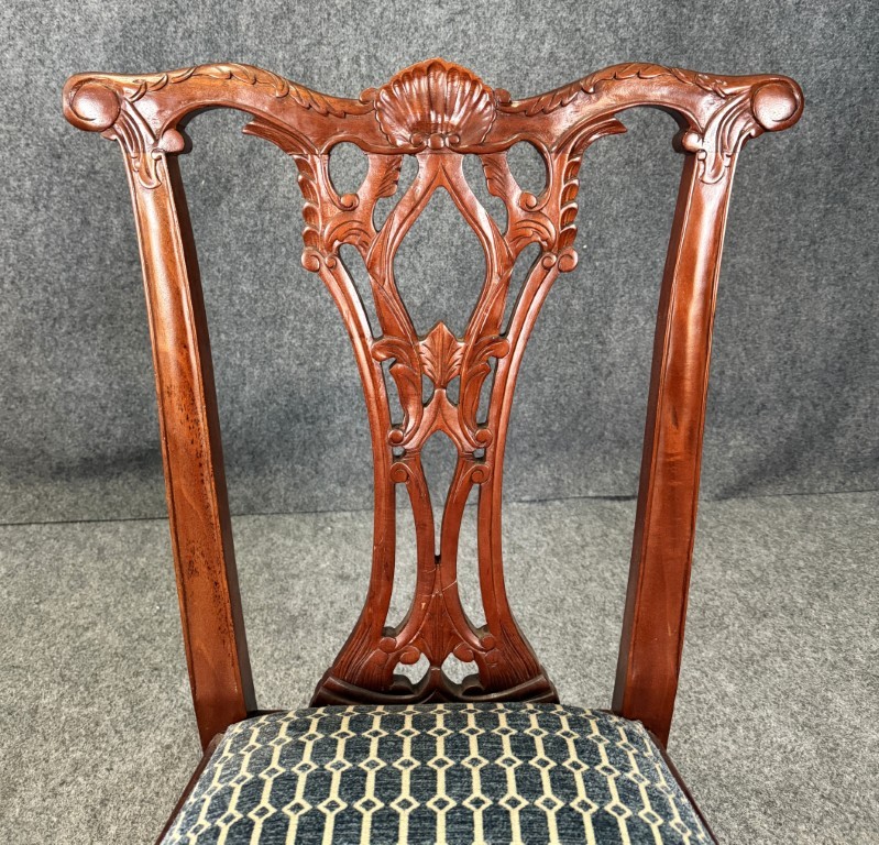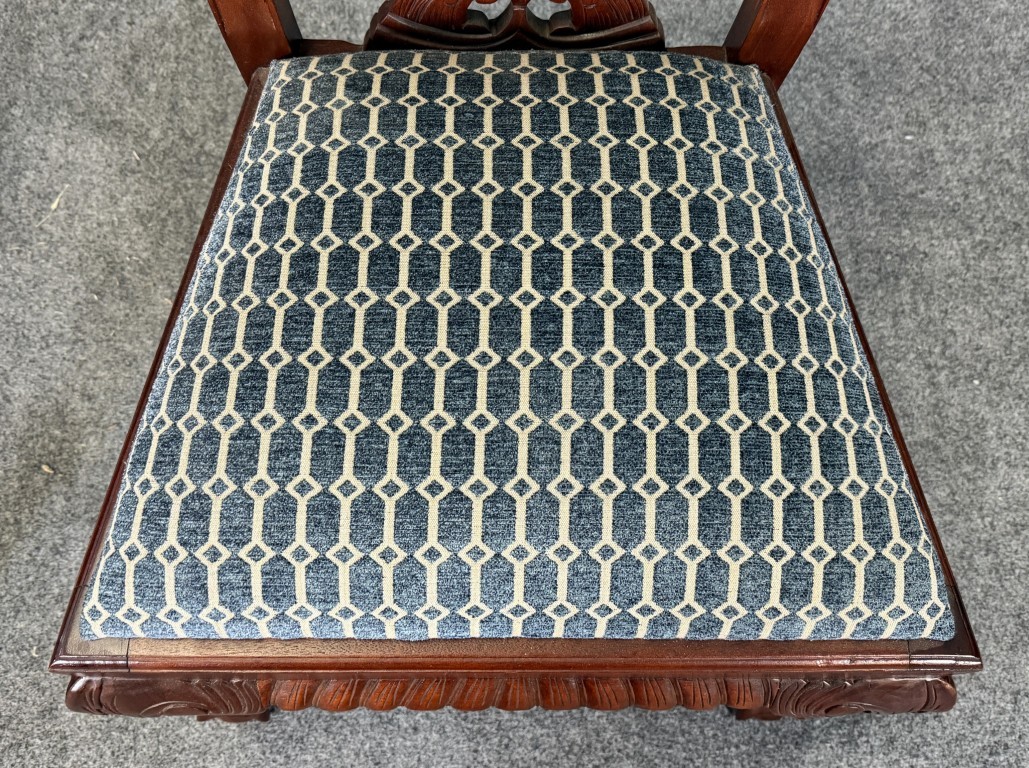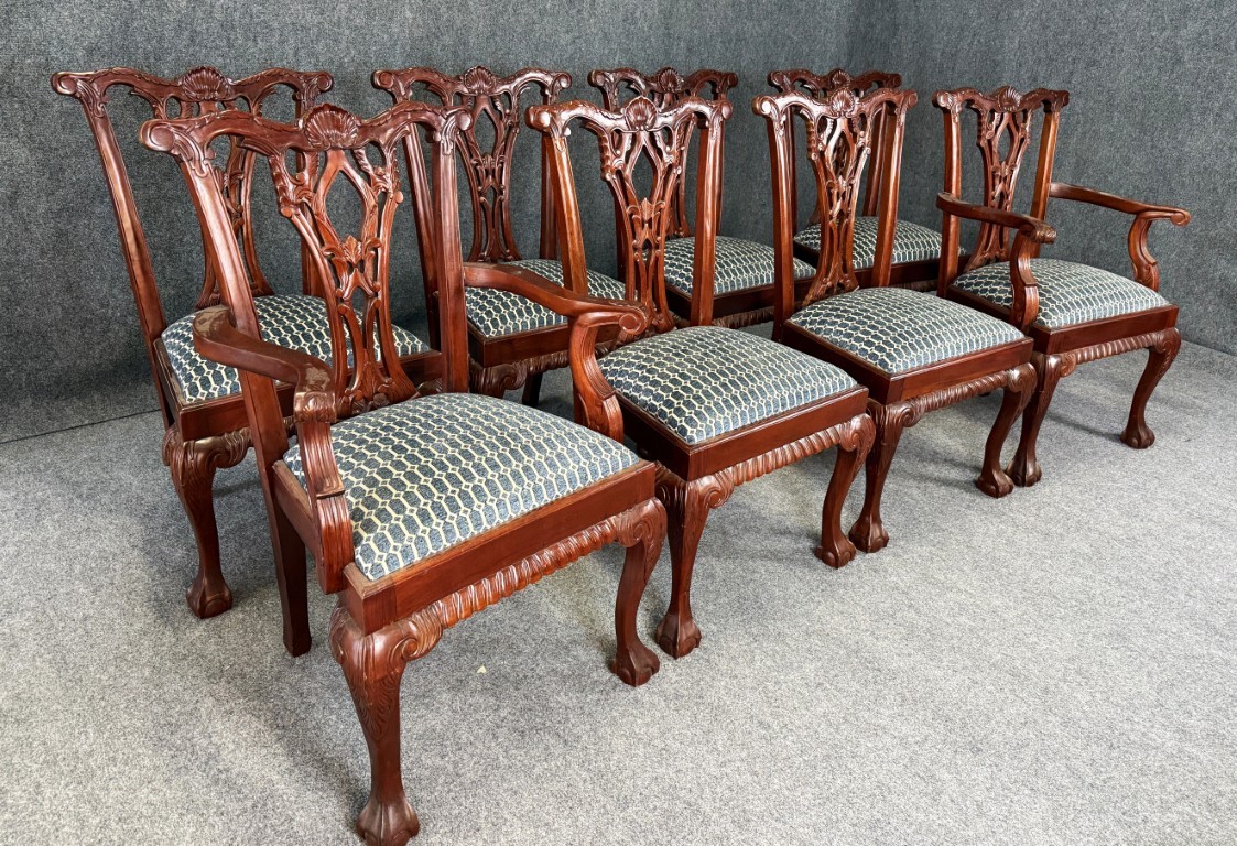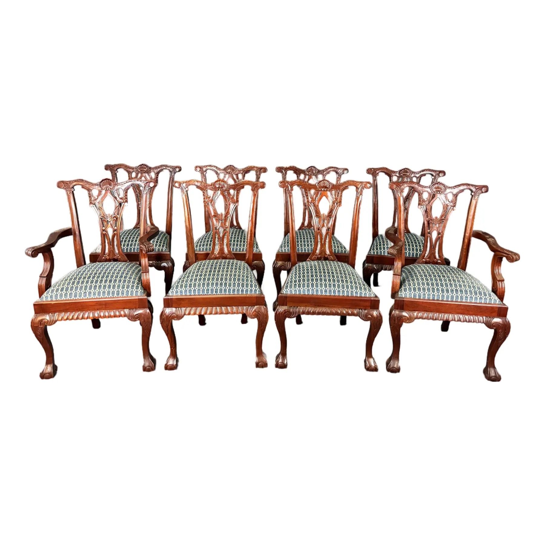 This set of eight solid mahogany dining chairs features finely carved pierced splat backs with shell crest rails, cabriole legs, and traditional ball-and-claw feet, all finished in a warm, rich tone. The seats are upholstered in a tailored blue geometric fabric, offering comfortable seating while maintaining a classic, formal dining room presence.