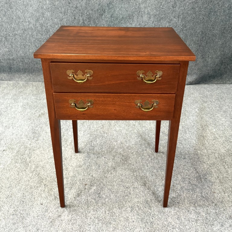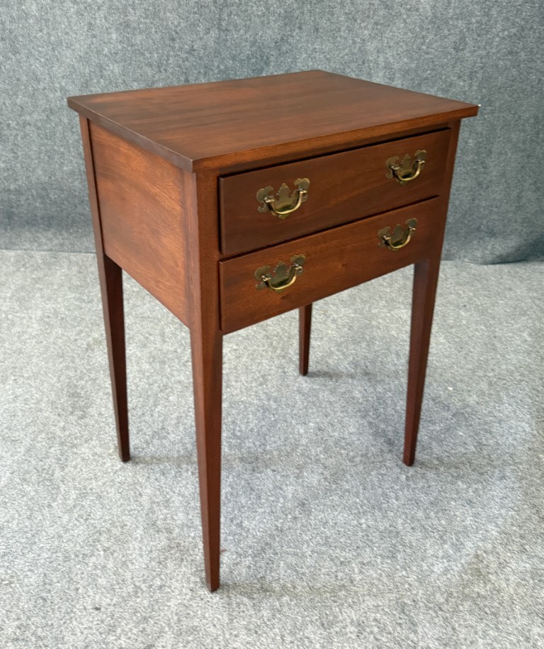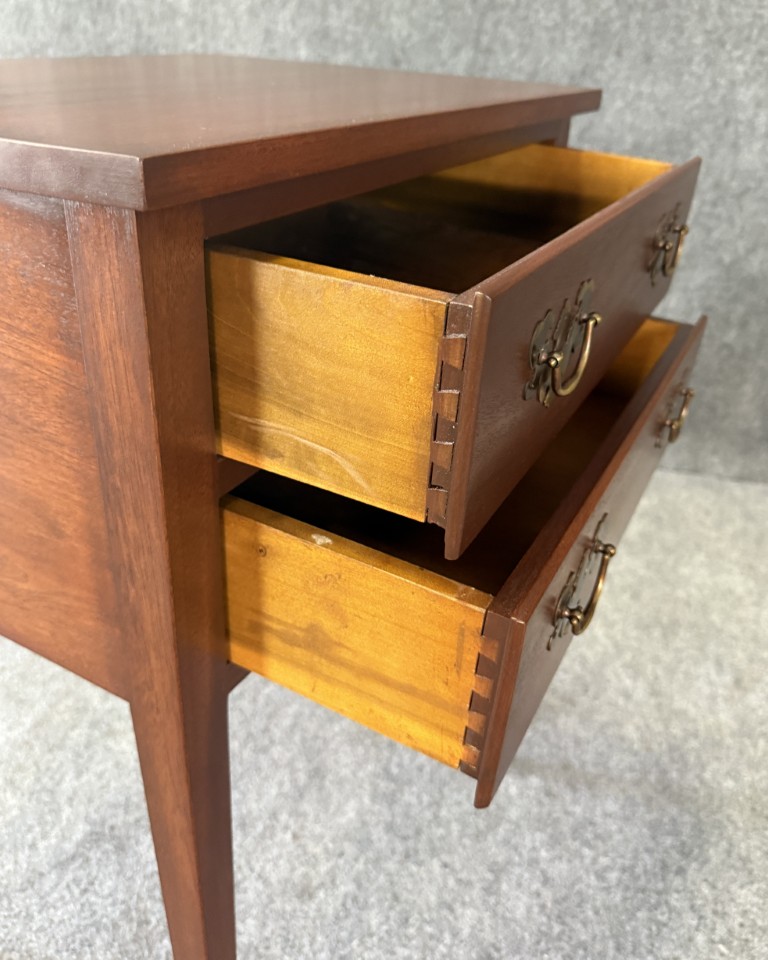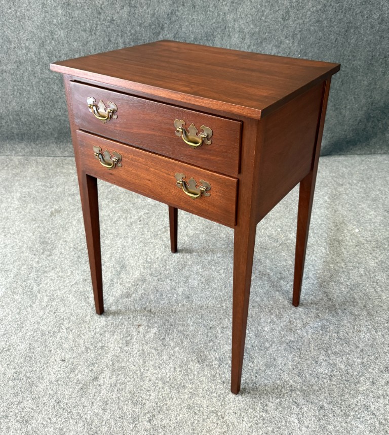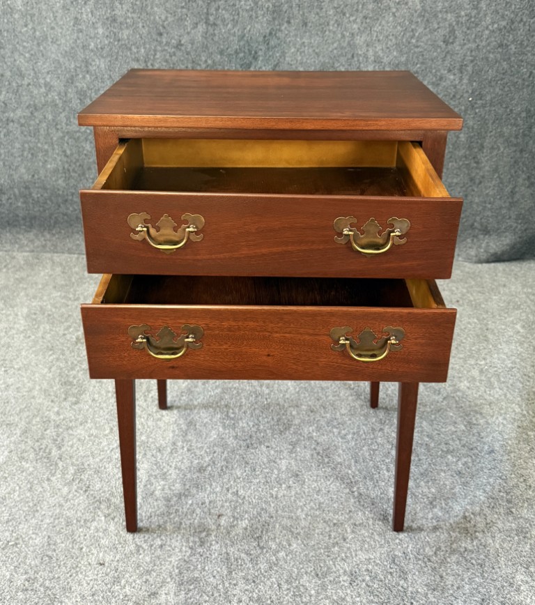 This solid mahogany side table features two drawers with brass bail pulls, offering both style and storage. Its tapered legs and warm finish give it a timeless, refined look suitable for any room.