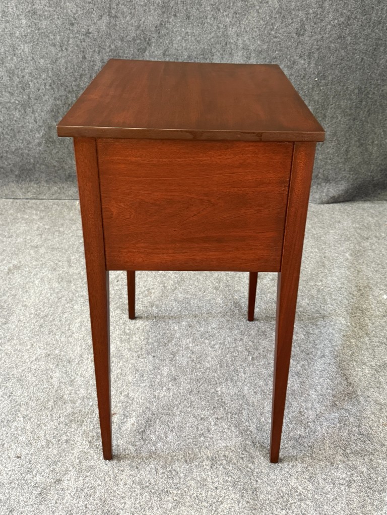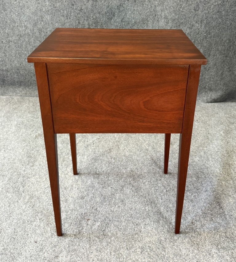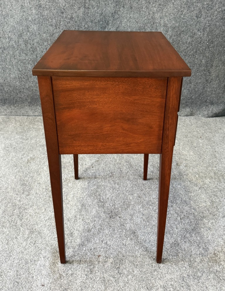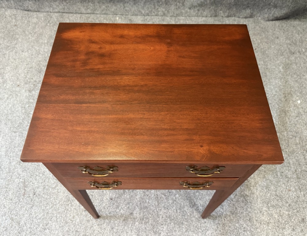 This solid mahogany side table features two drawers with brass bail pulls, offering both style and storage. Its tapered legs and warm finish give it a timeless, refined look suitable for any room.