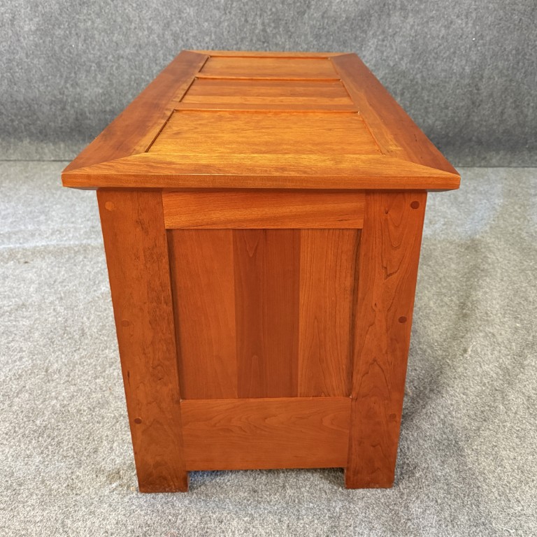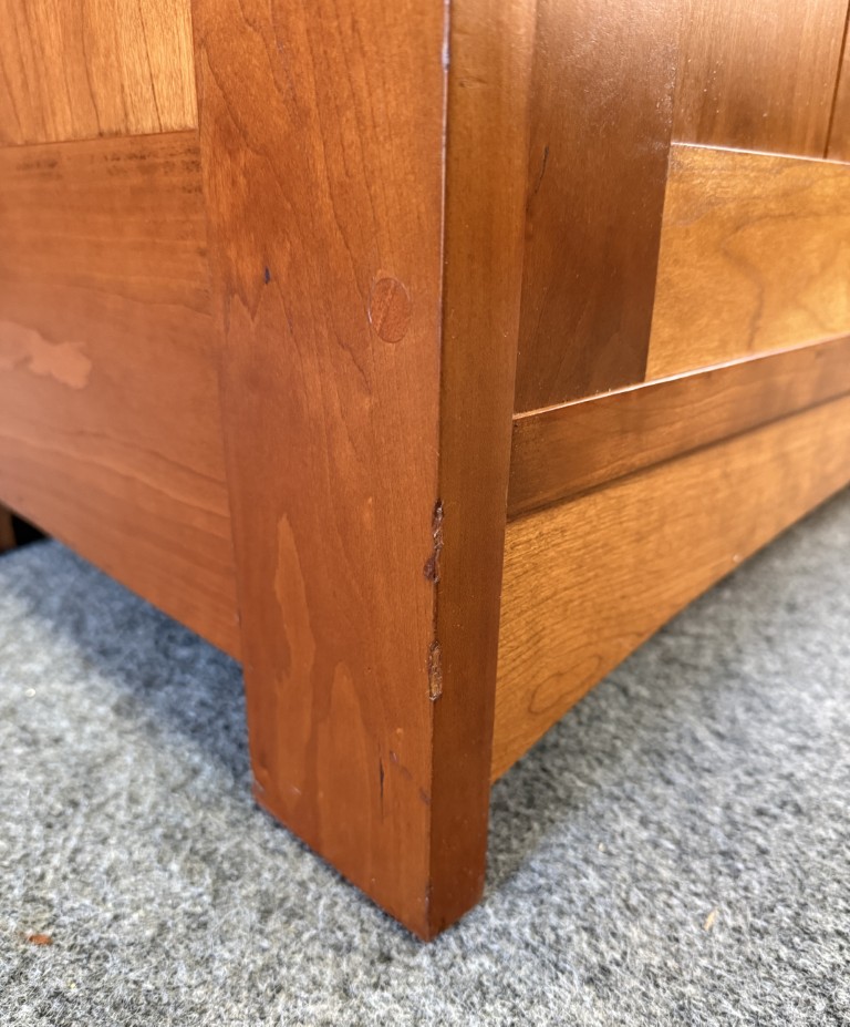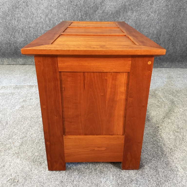 This Stickley cherry blanket chest features warm solid cherry construction accented by distinctive bowtie inlays, with a gently arched base and a lift-top lid opening to a cedar-lined interior for natural storage protection. Its clean lines and visible joinery reflect classic Mission-style craftsmanship while offering generous, practical storage. Stickley is renowned for its commitment to solid hardwood construction, traditional joinery, and enduring American Arts & Crafts design.
