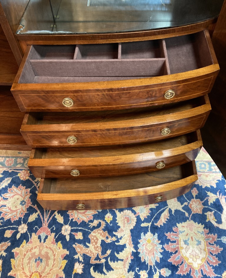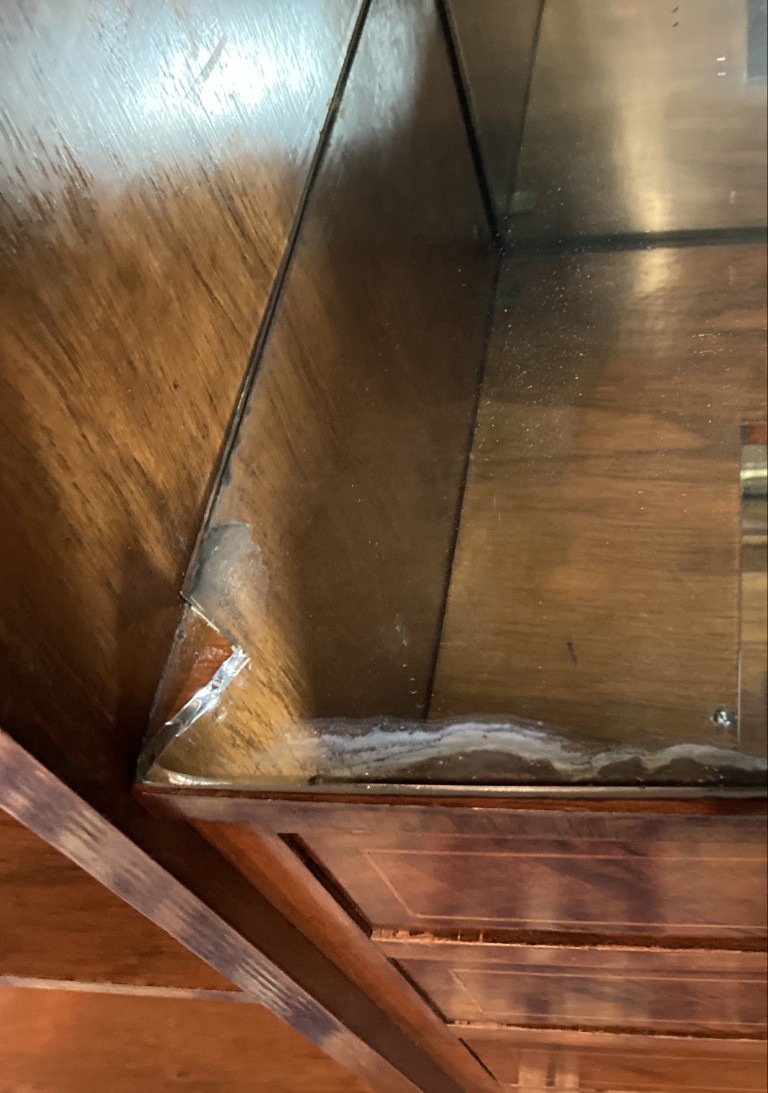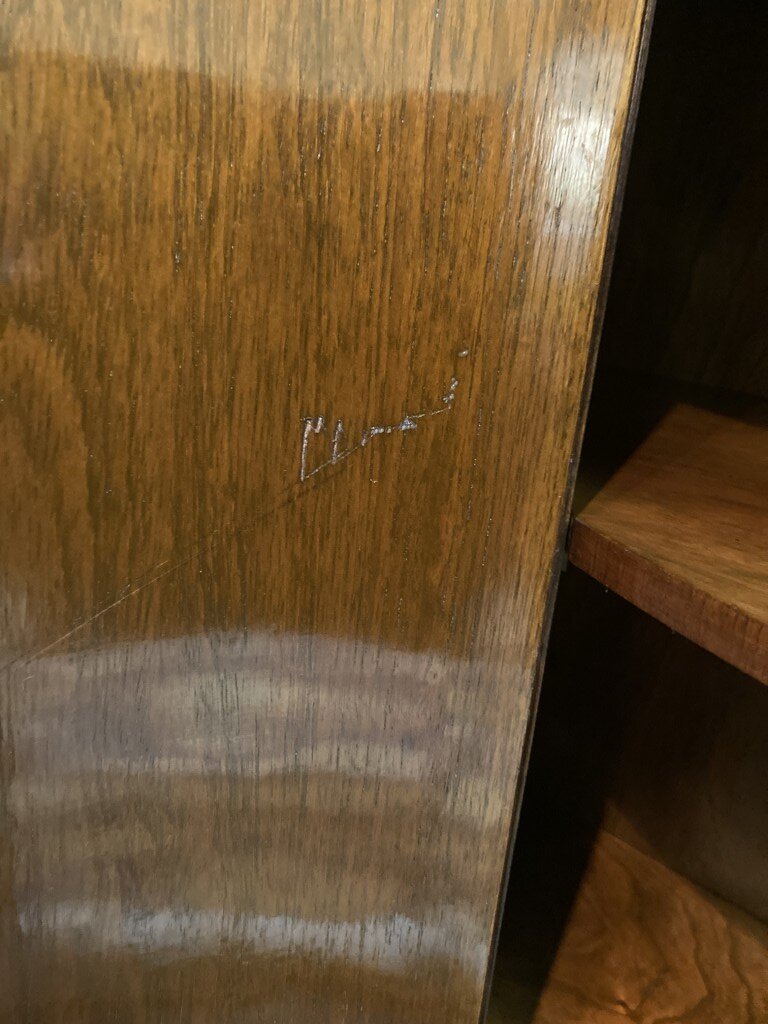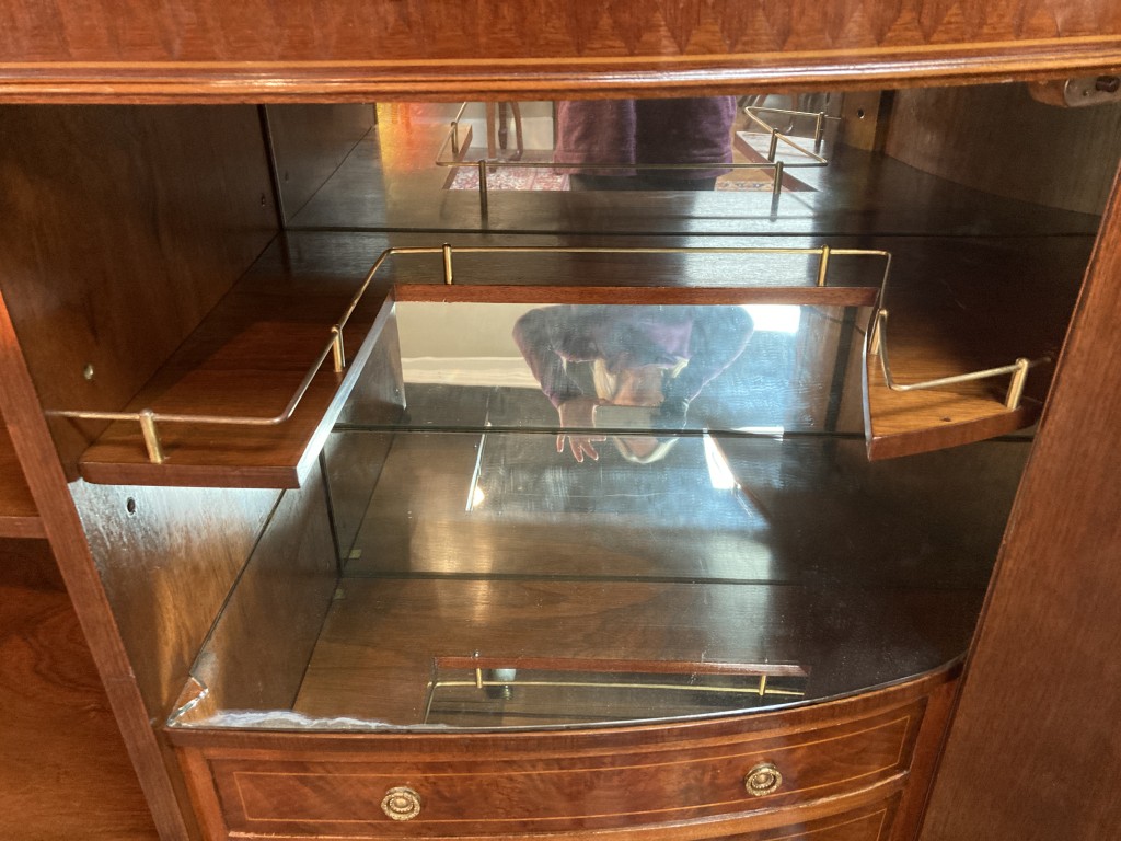 Your happiness with this item is of the utmost importance to us so please review the photographs carefully for condition. We endeavor to try and list any issues we may observe; we may not necessarily note all minor nicks and dings or we may simply miss something. Please inspect carefully to ensure your full happiness with this item. For this particular piece we found minor wear consistent with age and prior use, including some scuffs to the inside of the left door as pictured, and a broken corner on the glass shelf. Overall lovely condition.