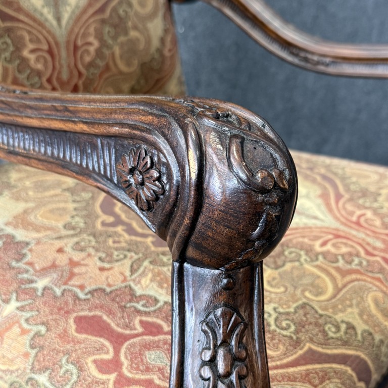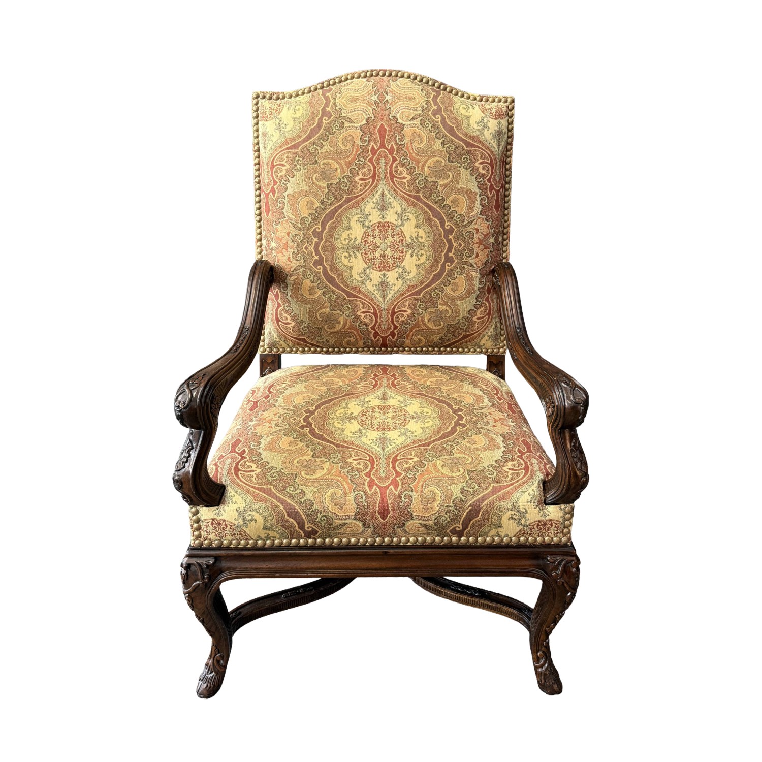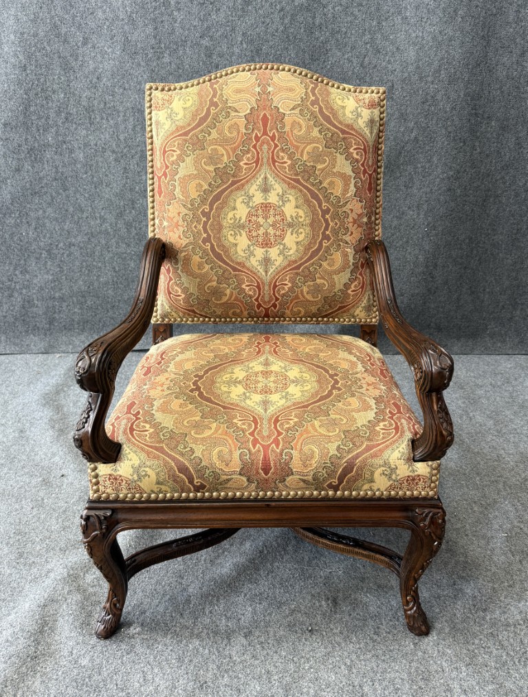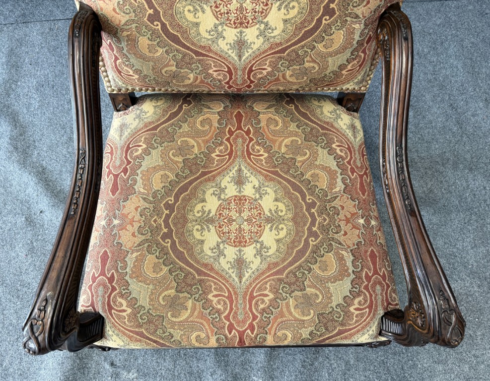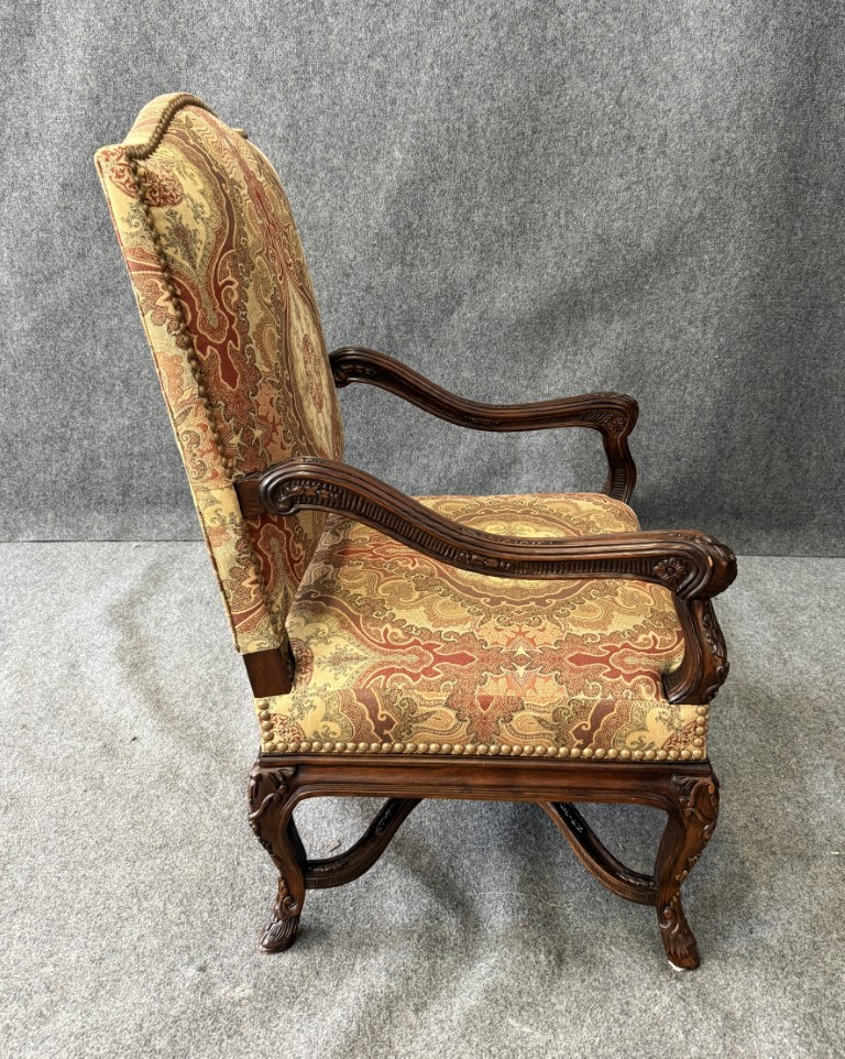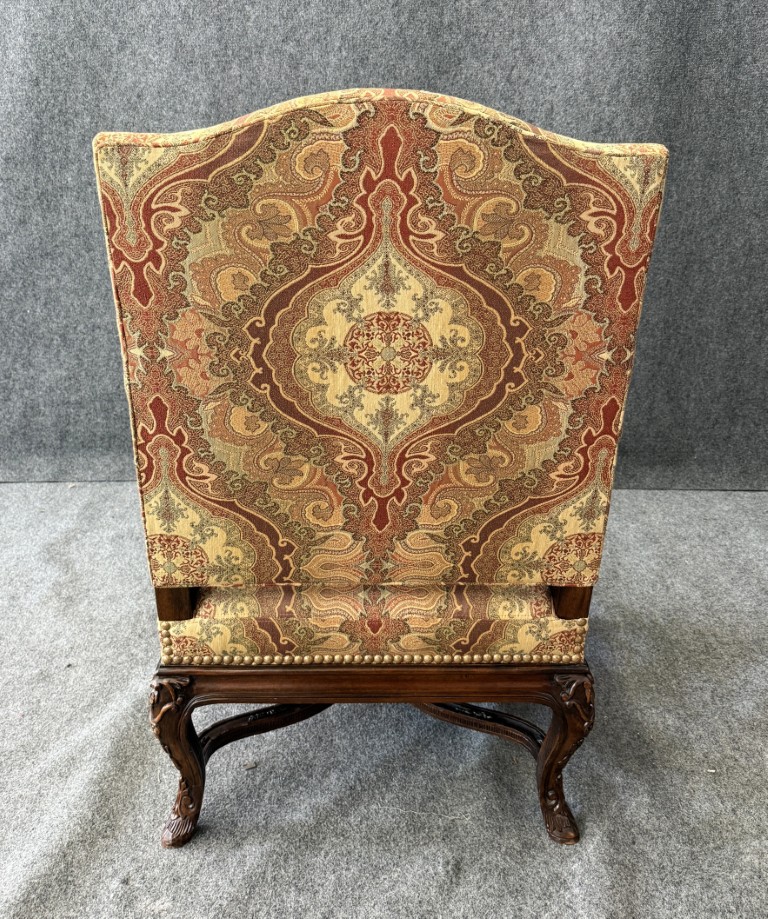 This traditional high-back upholstered arm chair features an elegant, gently arched crest and richly patterned fabric with classic medallion motifs in warm, inviting tones. Carved wood arms and cabriole-style legs with subtle detailing add a refined, timeless presence, making it a standout accent for both formal and transitional interiors.