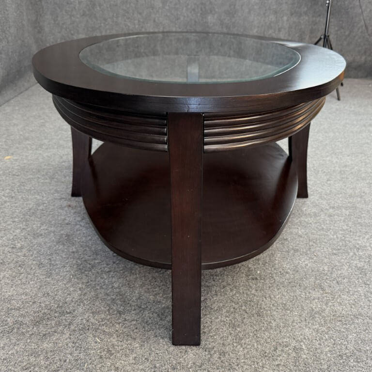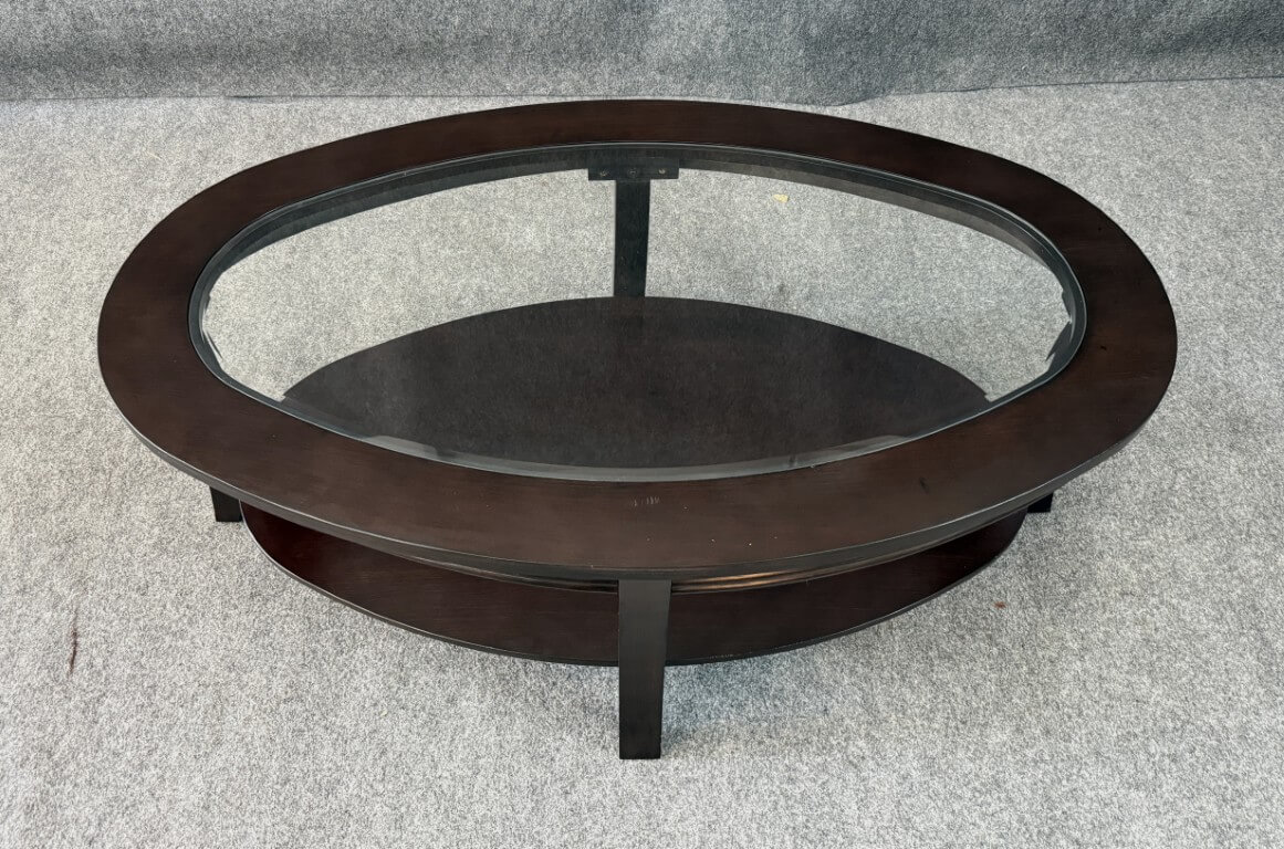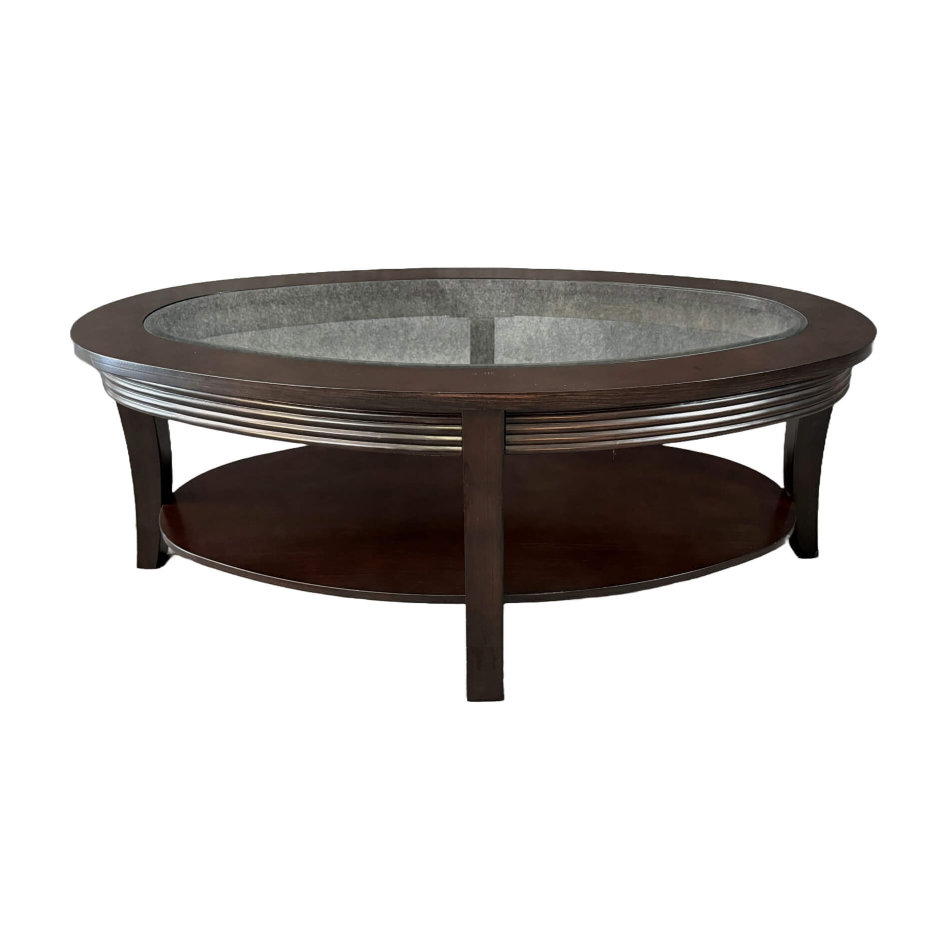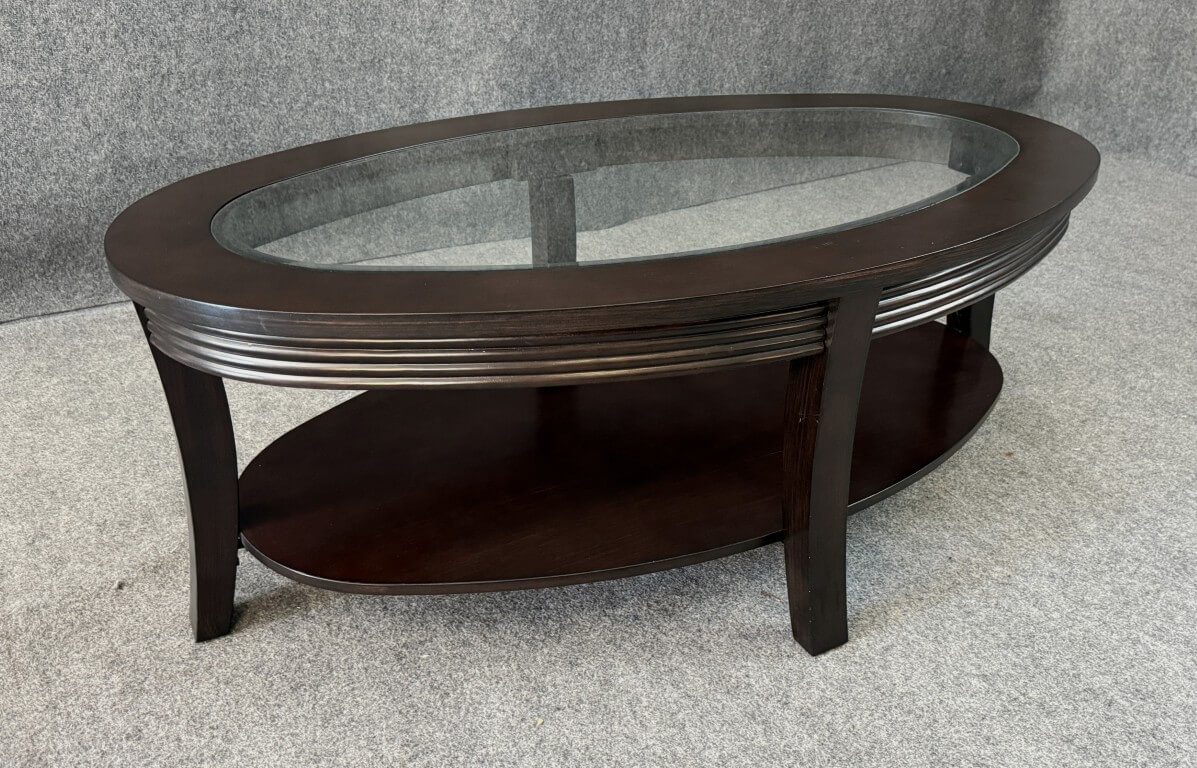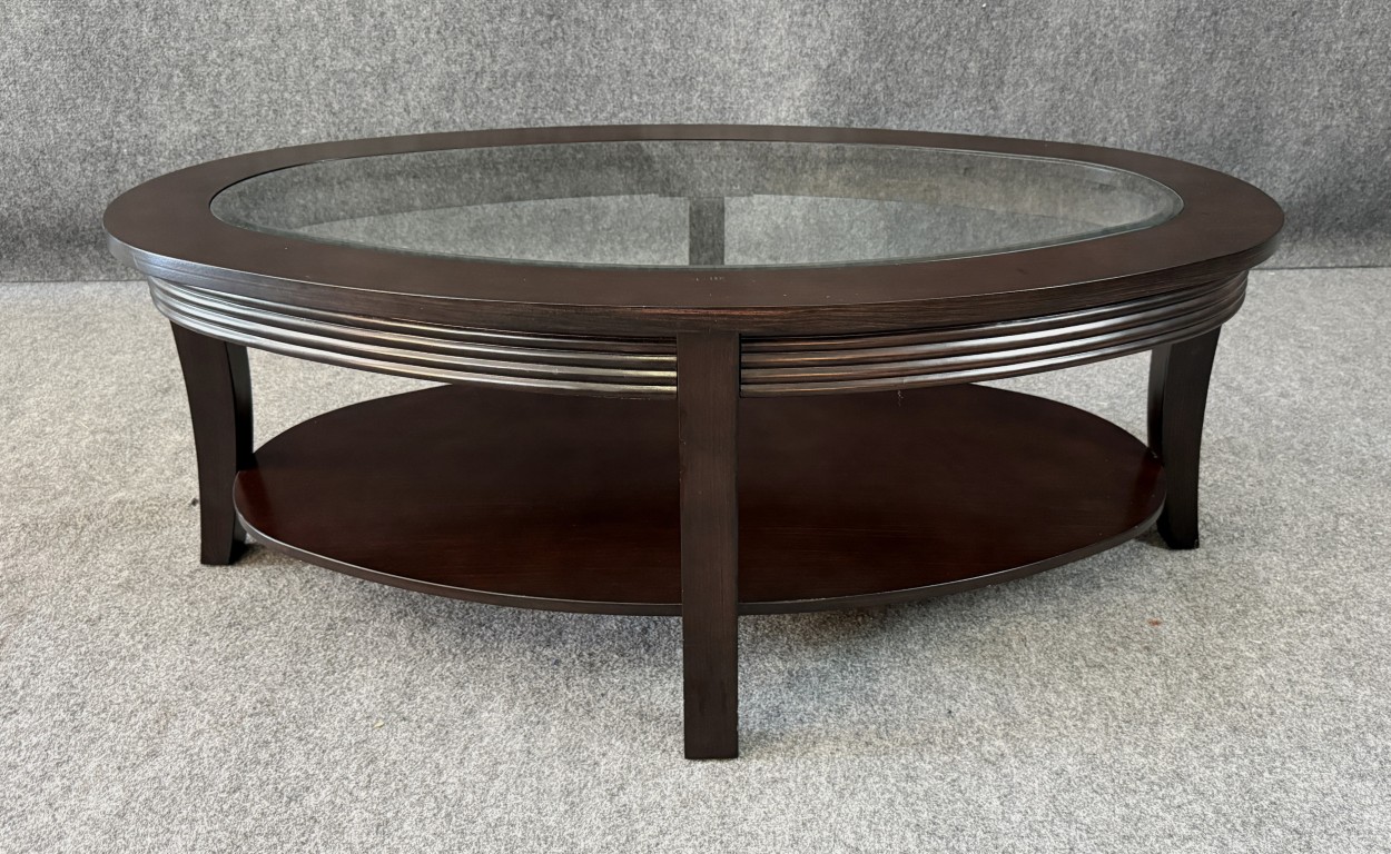 This transitional oval coffee table features a sleek glass inset top framed by a rich dark wood border, offering a balanced blend of contemporary and traditional design. A spacious lower display shelf provides convenient storage for books or décor, while the clean-lined supports and subtle metal accent detailing add refined visual interest.