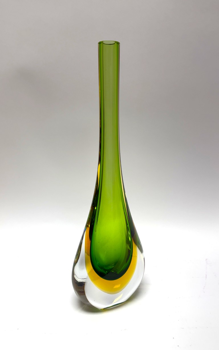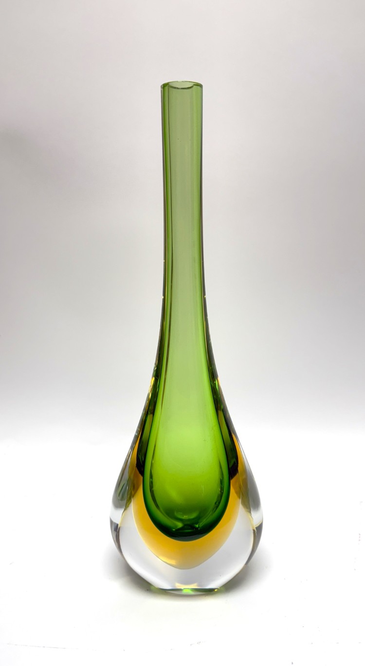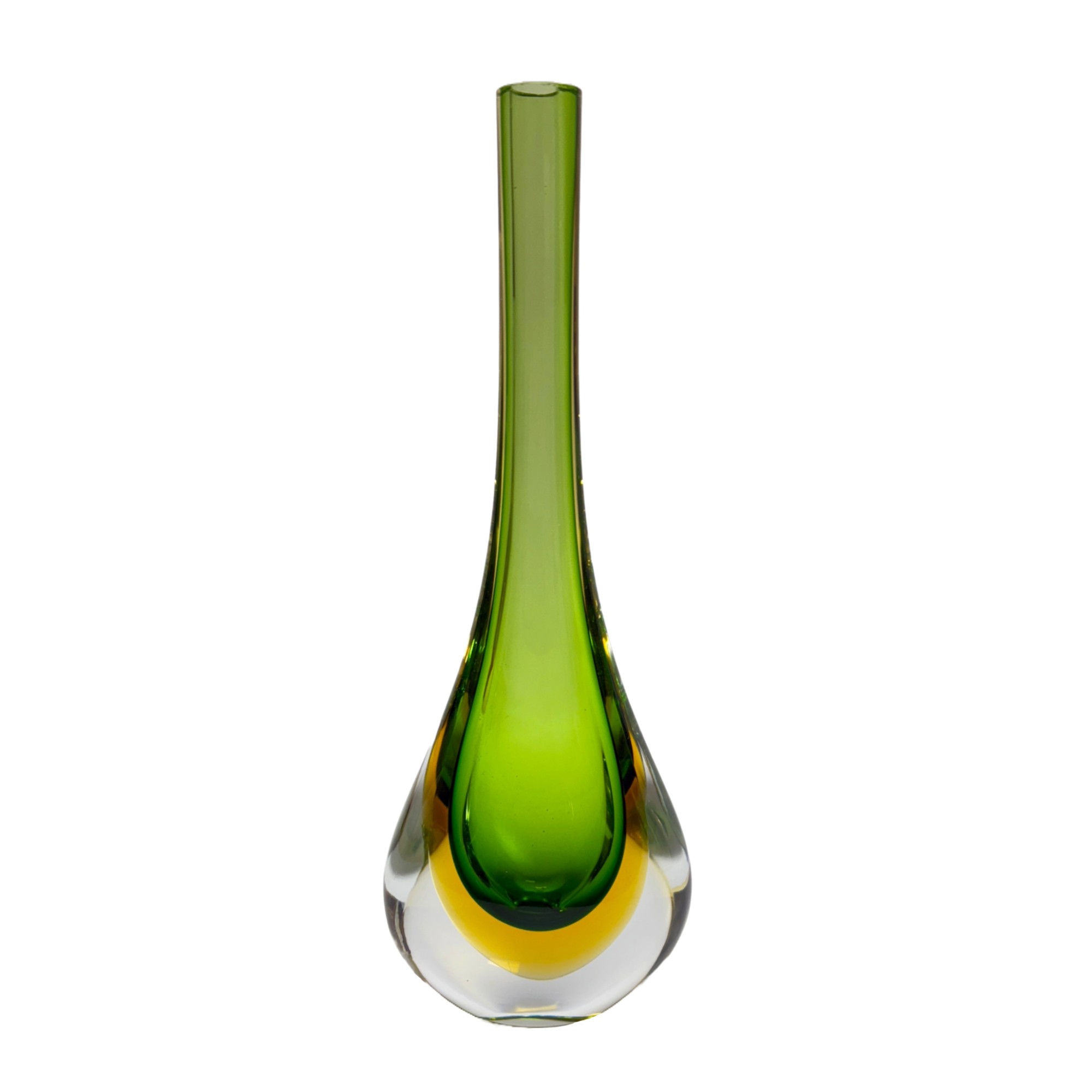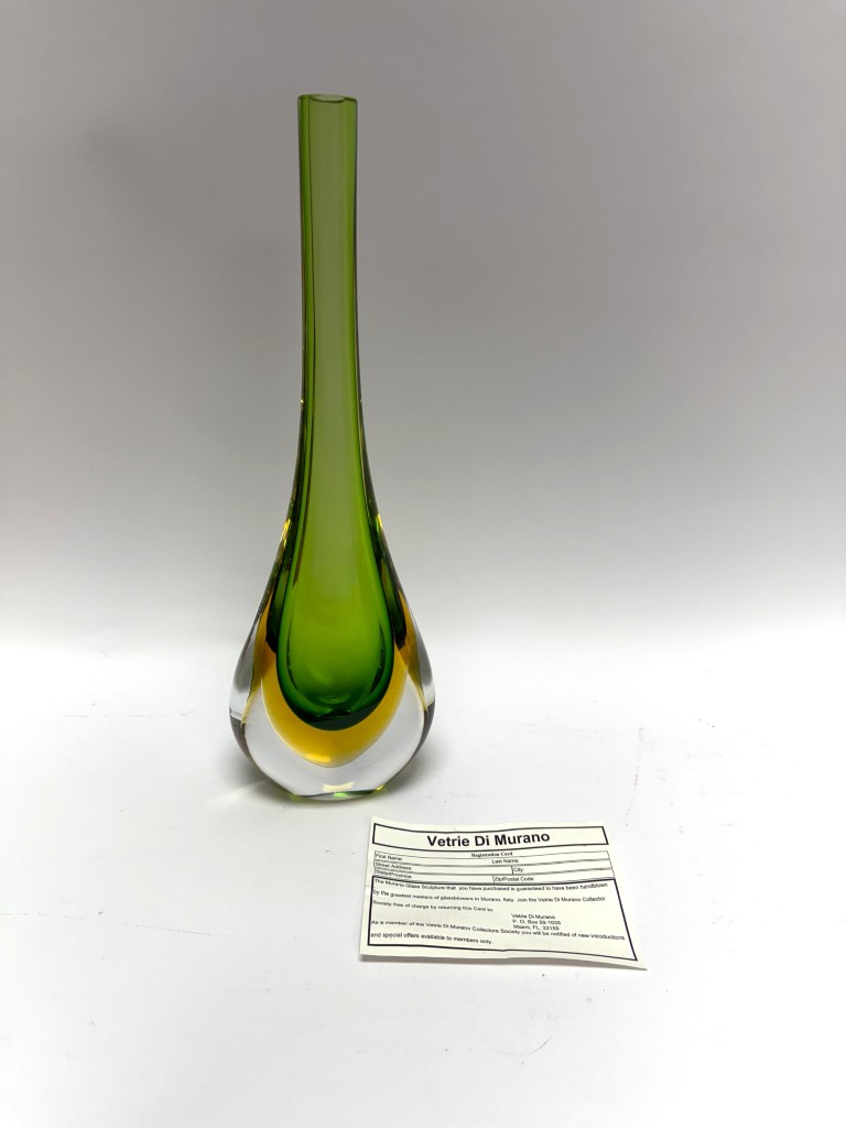 This Vetri Di Murano Elongated Teardrop Vase features a graceful tapered form with layered green and amber hues suspended in crystal-clear glass. Vetri Di Murano is known for its authentic Italian glass artistry, with each piece handblown by master glassmakers in Murano using centuries-old techniques. Beautifully sculptural and universally appealing, it makes an elegant and memorable gift for any lover of fine art glass.
