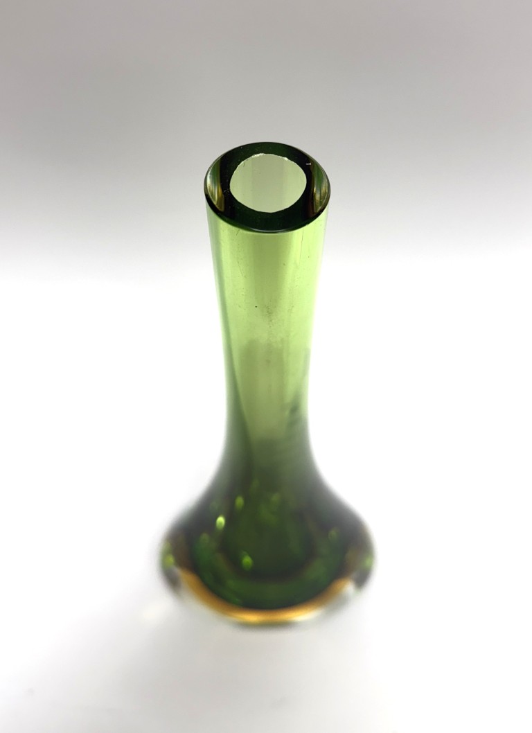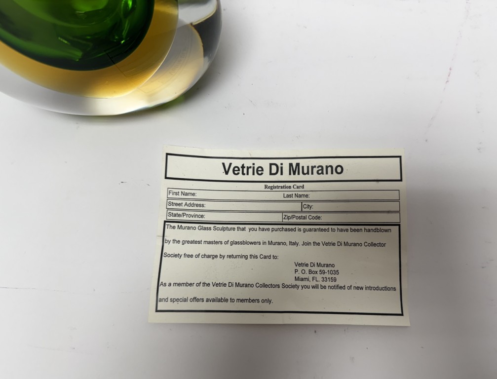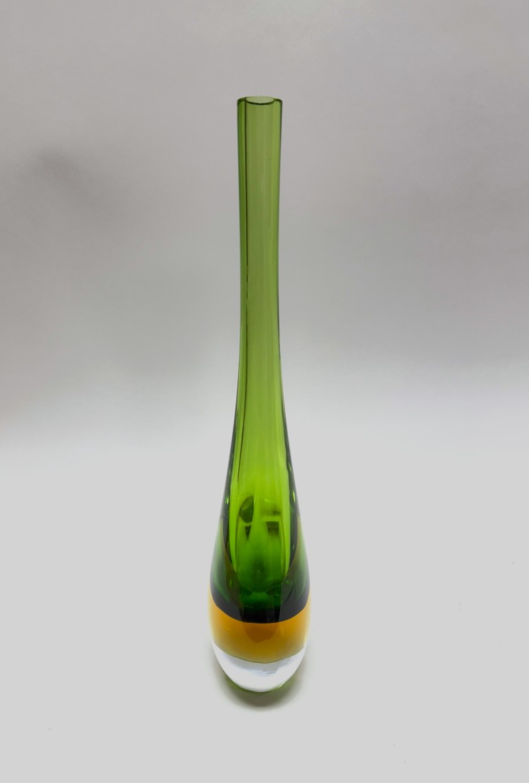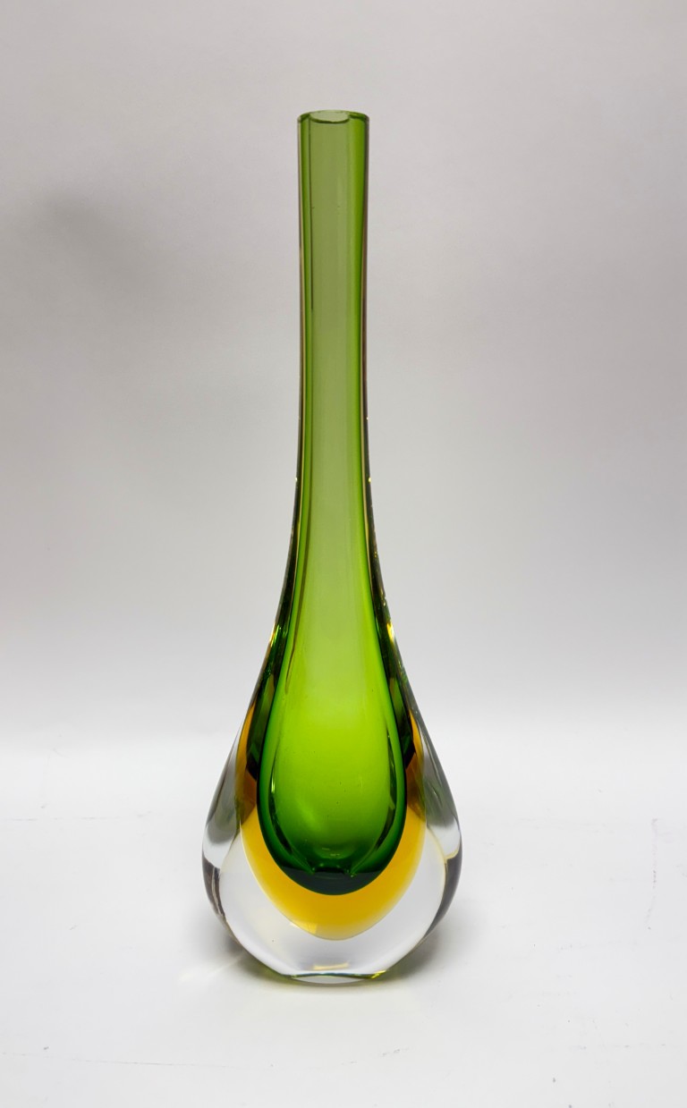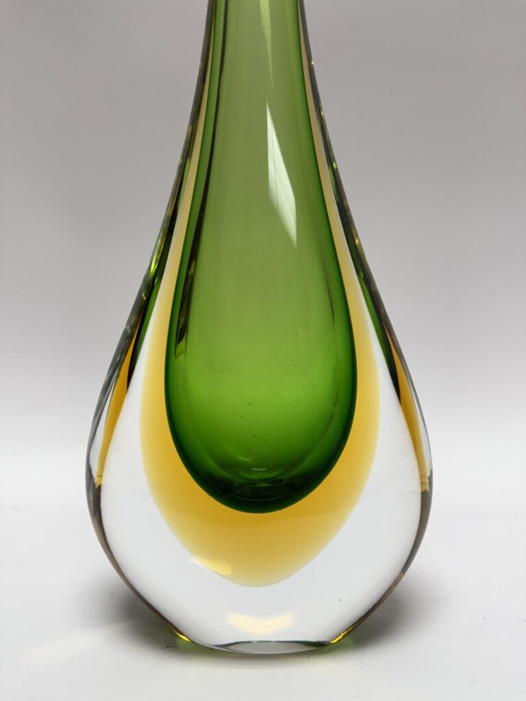 This Vetri Di Murano Elongated Teardrop Vase features a graceful tapered form with layered green and amber hues suspended in crystal-clear glass. Vetri Di Murano is known for its authentic Italian glass artistry, with each piece handblown by master glassmakers in Murano using centuries-old techniques. Beautifully sculptural and universally appealing, it makes an elegant and memorable gift for any lover of fine art glass.