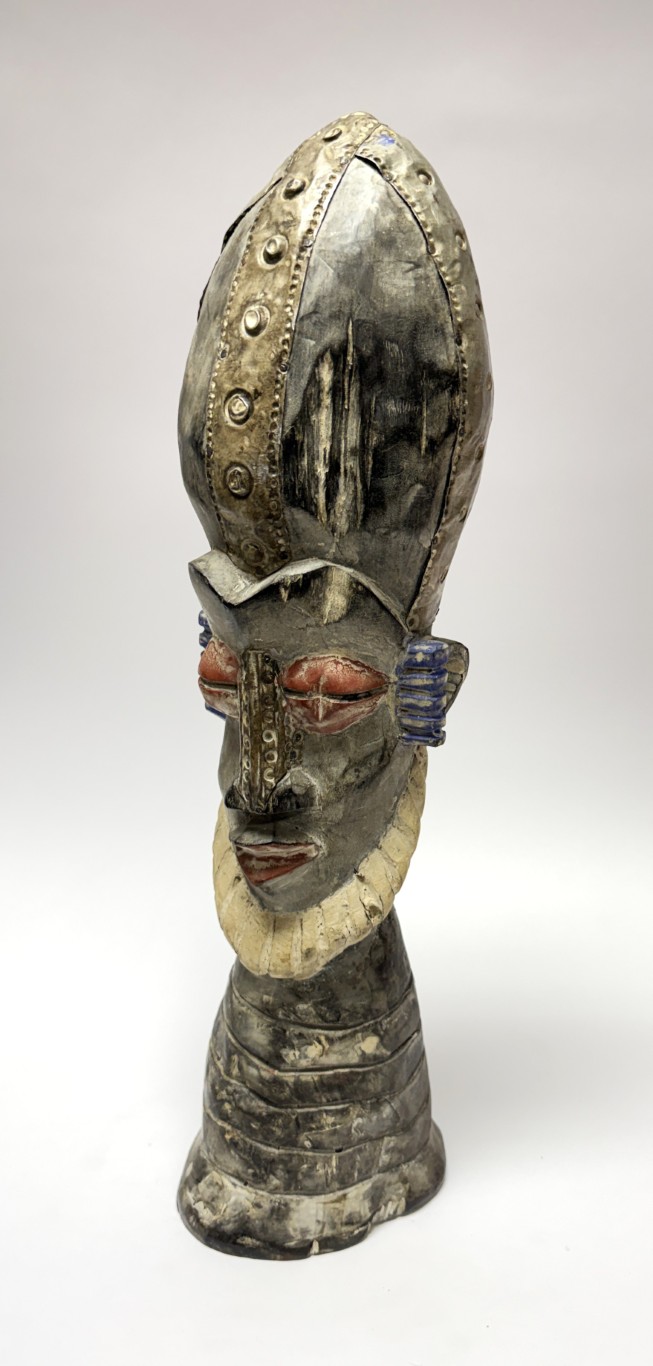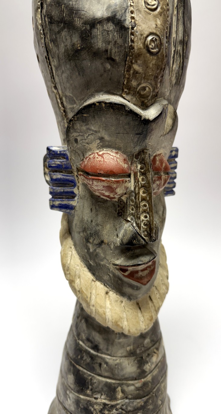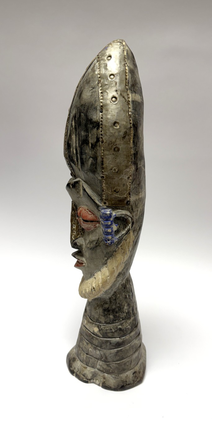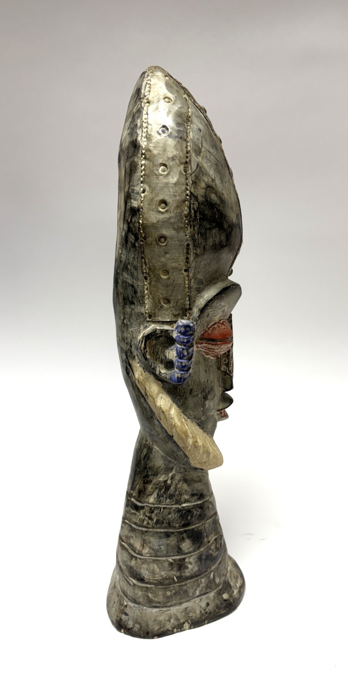 This vintage African hand-carved bust features a striking elongated form, accented with hammered metal overlay and decorative rivet detailing that emphasize its sculptural presence. Stylized facial features with red-painted eyes, blue ear accents, and a textured collar create a bold and visually compelling statement piece.