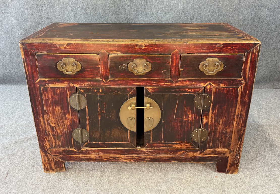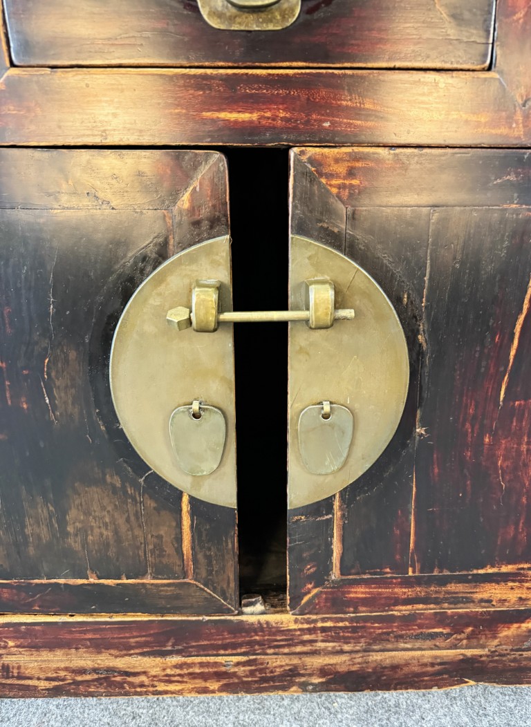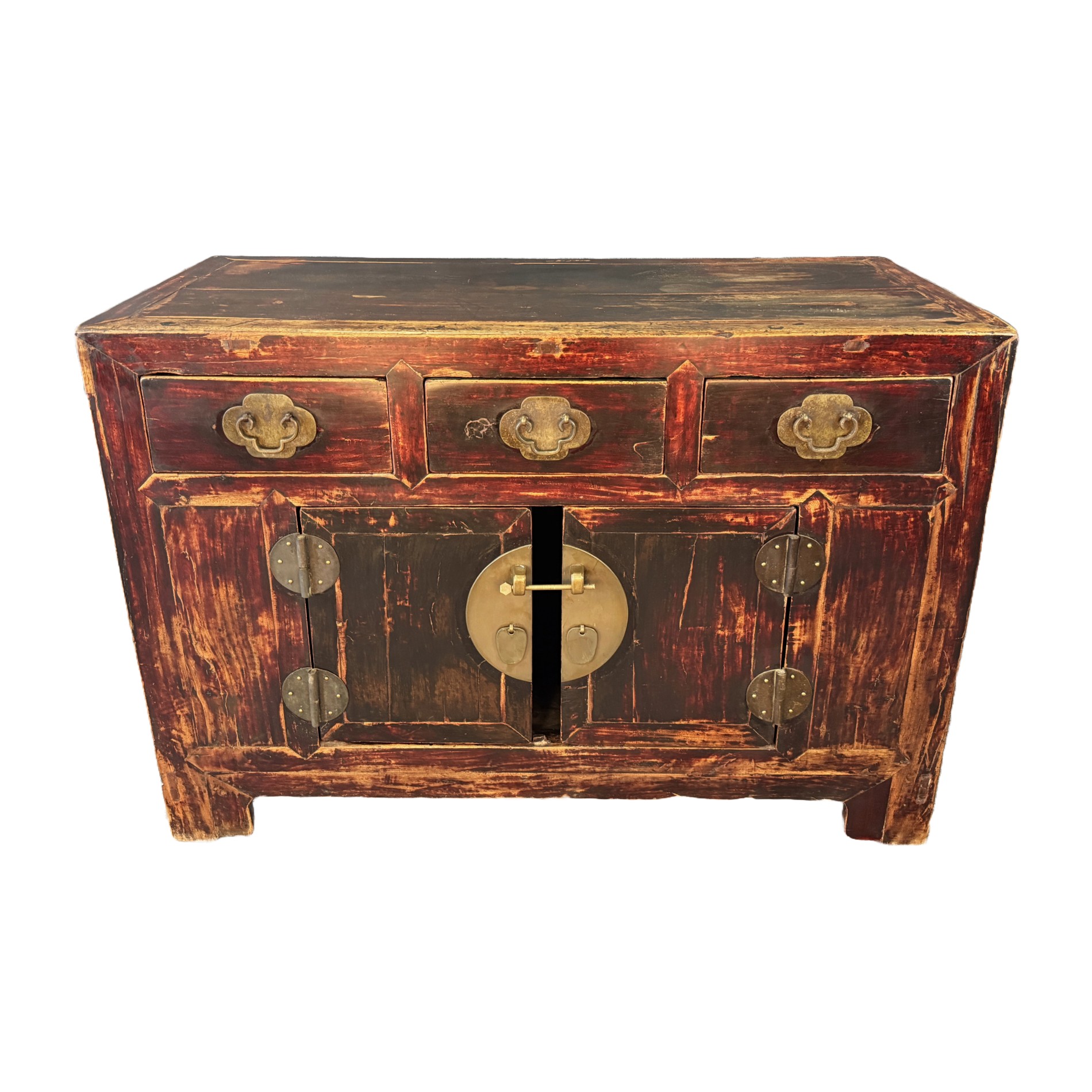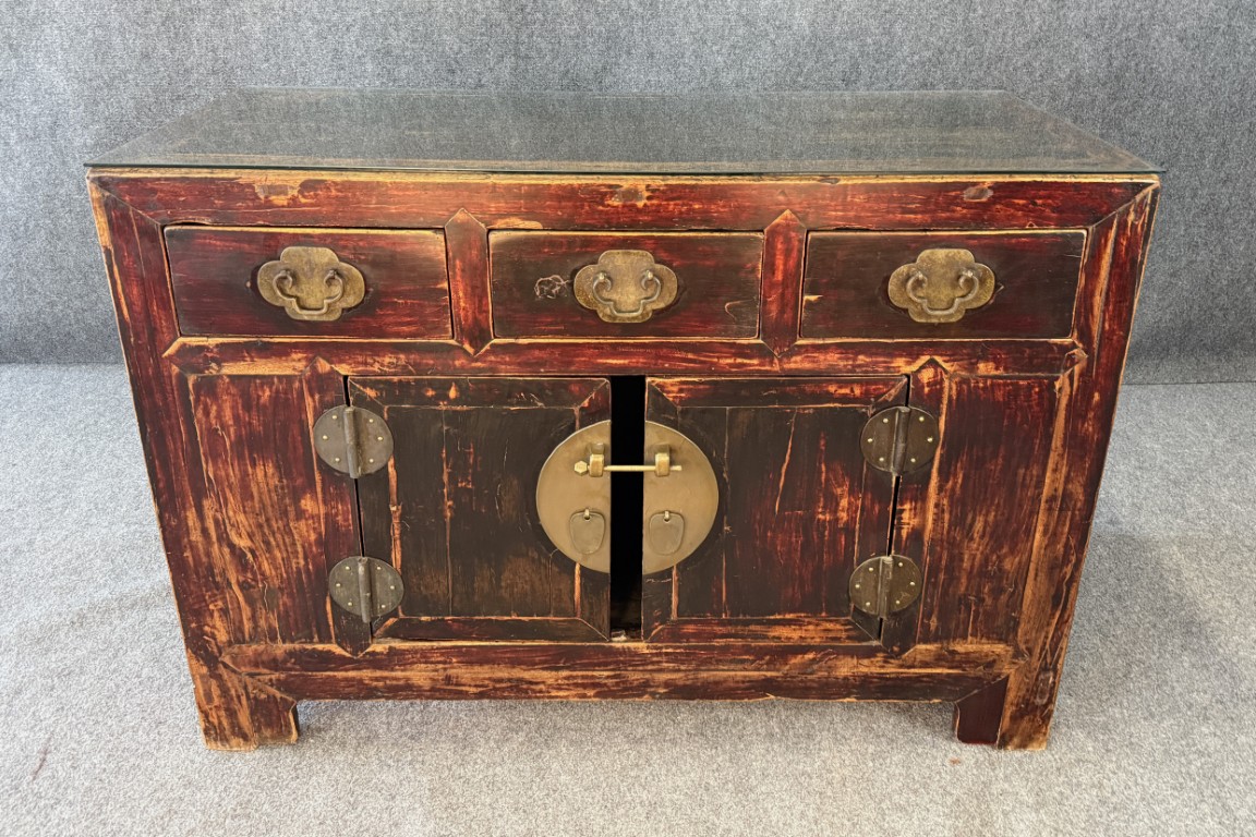 This vintage Asian cabinet chest features a richly distressed red lacquer finish accented by stately brass drawer pulls, round hinges, a traditional circular medallion lock plate, and a custom fit glass top. Offering three upper drawers and a spacious lower cabinet with double doors, it combines bold character with practical storage for an entryway, dining room, or living space.