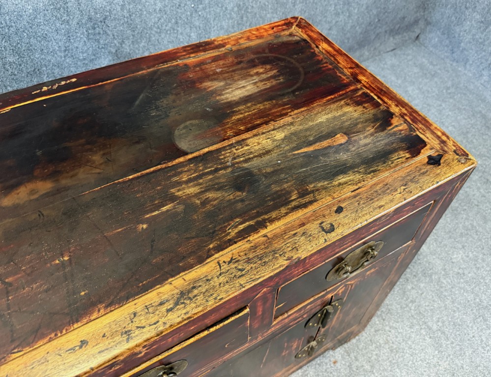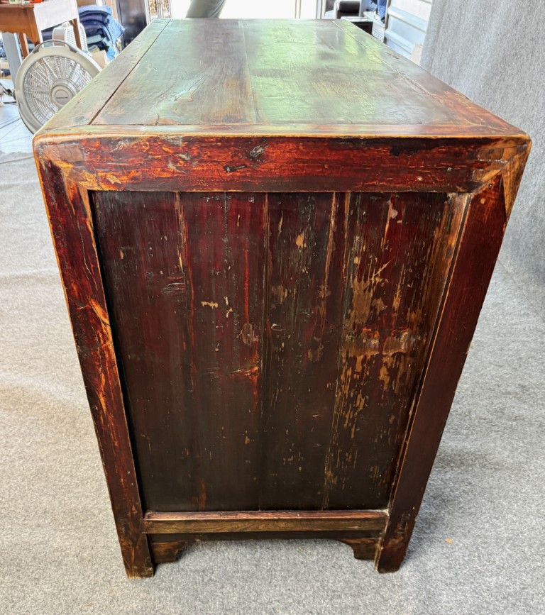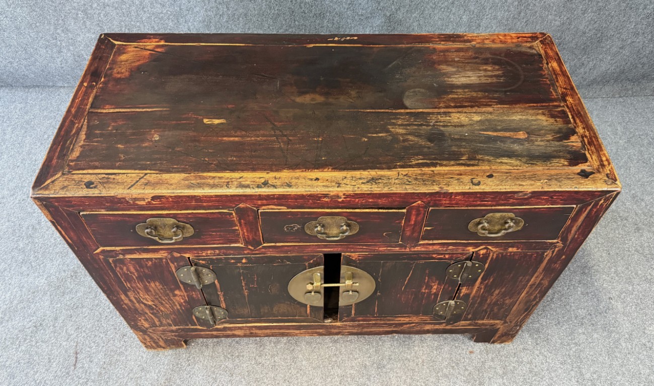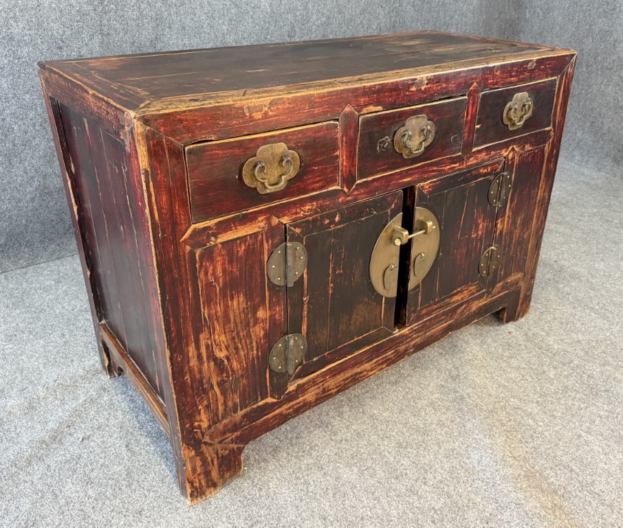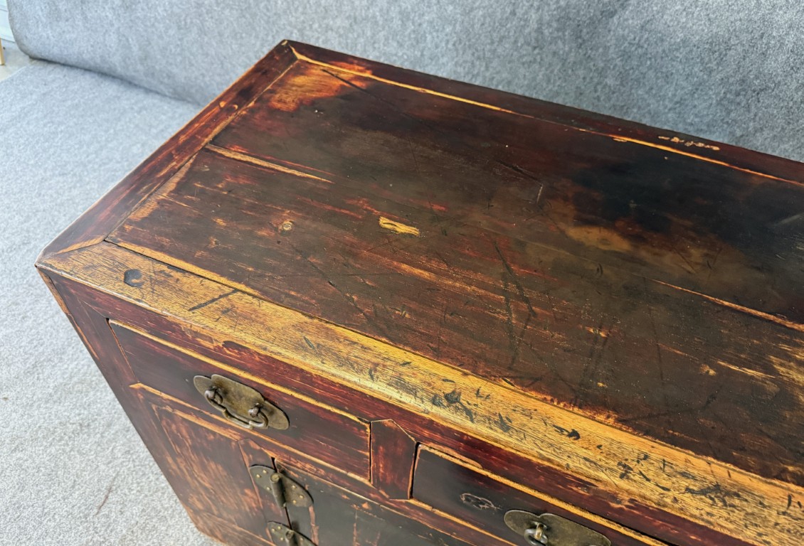 This vintage Asian cabinet chest features a richly distressed red lacquer finish accented by stately brass drawer pulls, round hinges, a traditional circular medallion lock plate, and a custom fit glass top. Offering three upper drawers and a spacious lower cabinet with double doors, it combines bold character with practical storage for an entryway, dining room, or living space.