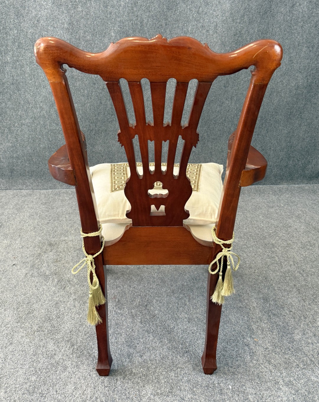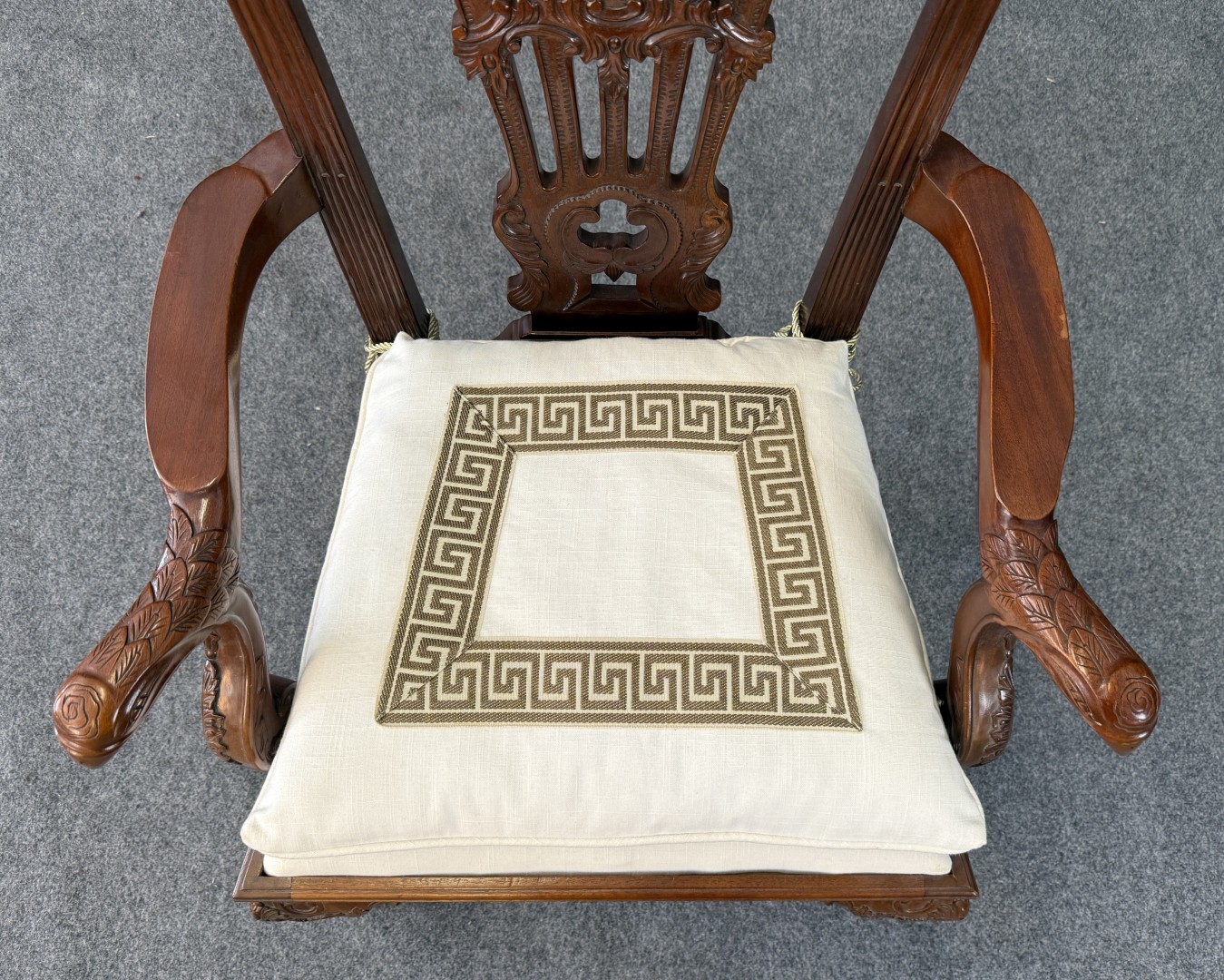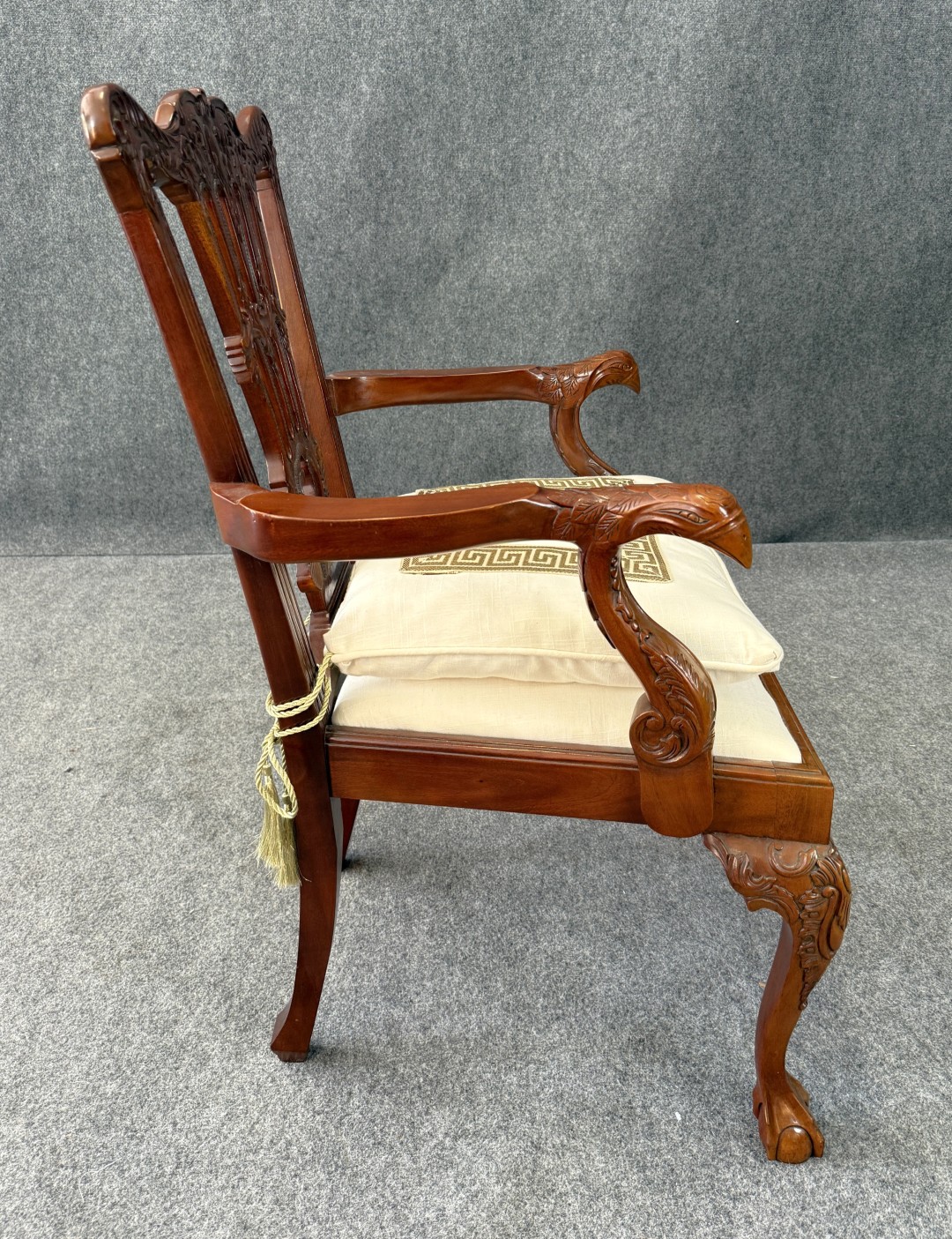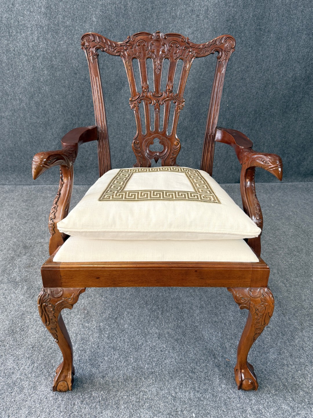 This carved mahogany Chippendale-style armchair features an intricately pierced back, acanthus leaf detailing, and boldly sculpted eagle-head arms. Resting on cabriole legs with claw-and-ball feet, it includes a tailored cushion with a Greek key border for an elegant finishing touch.