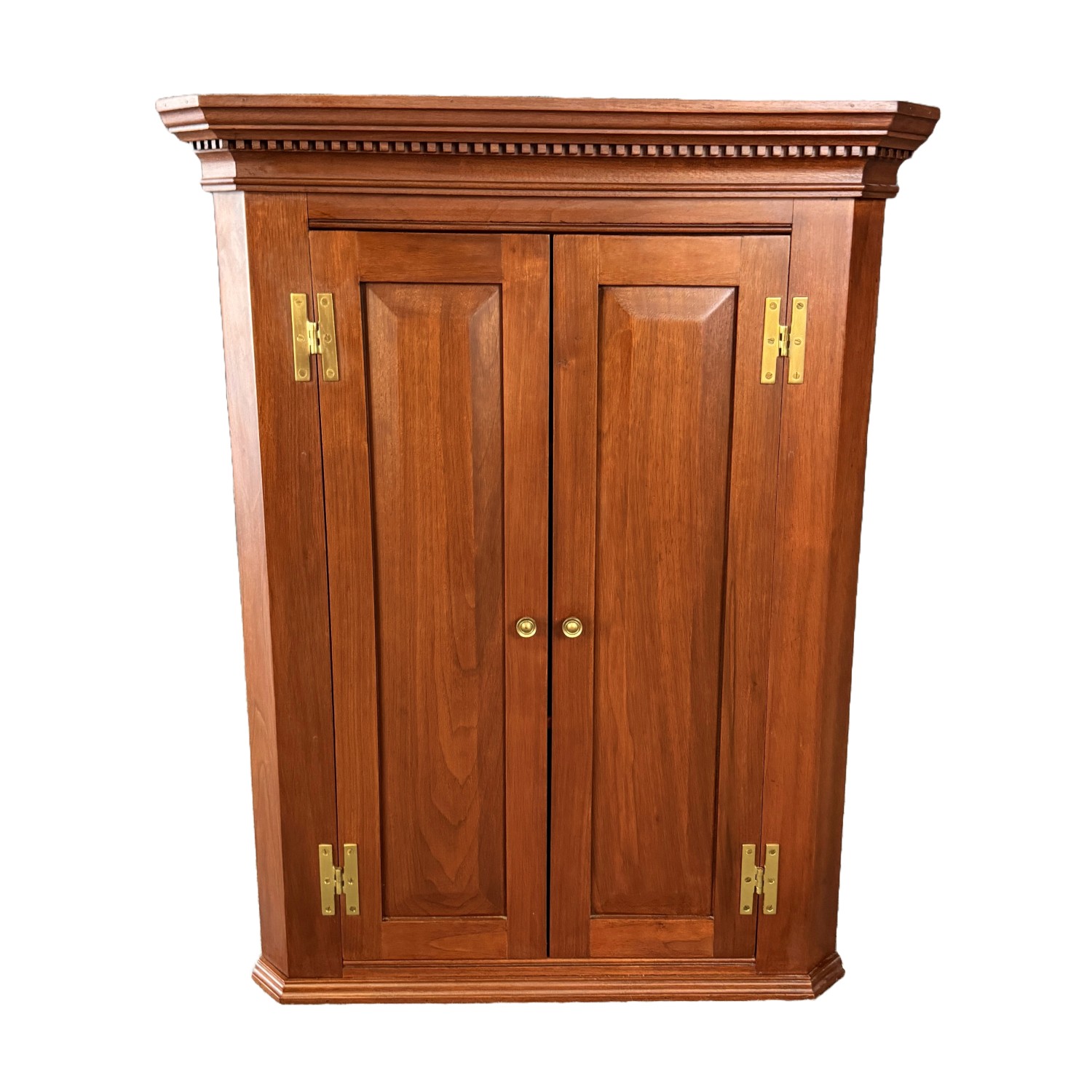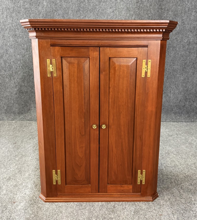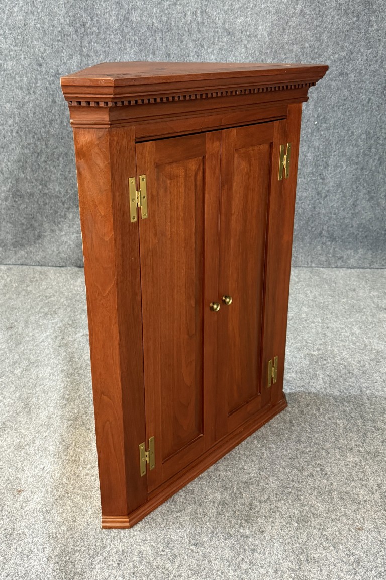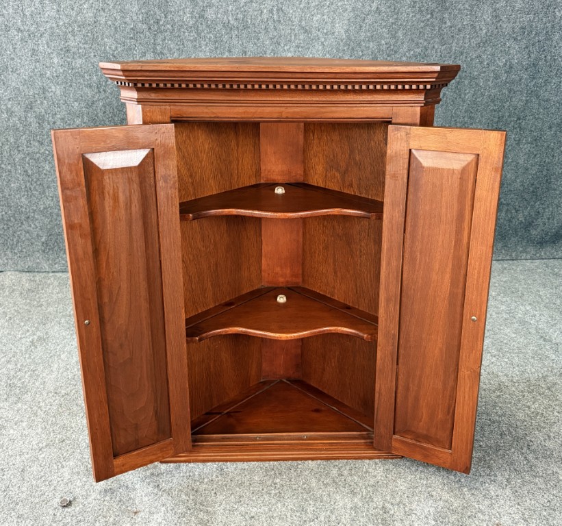 This vintage cherry hanging corner cabinet features a warm cherry finish, raised paneled doors, and a classic molded cornice that gives it a refined traditional presence. The interior offers shaped corner shelves for displaying small décor or collectibles, making it both decorative and practical for unused corner space.