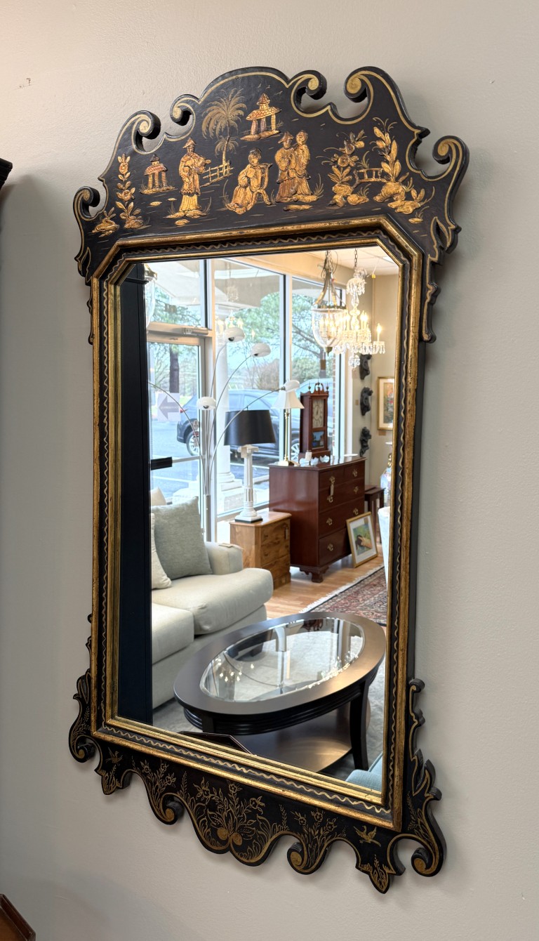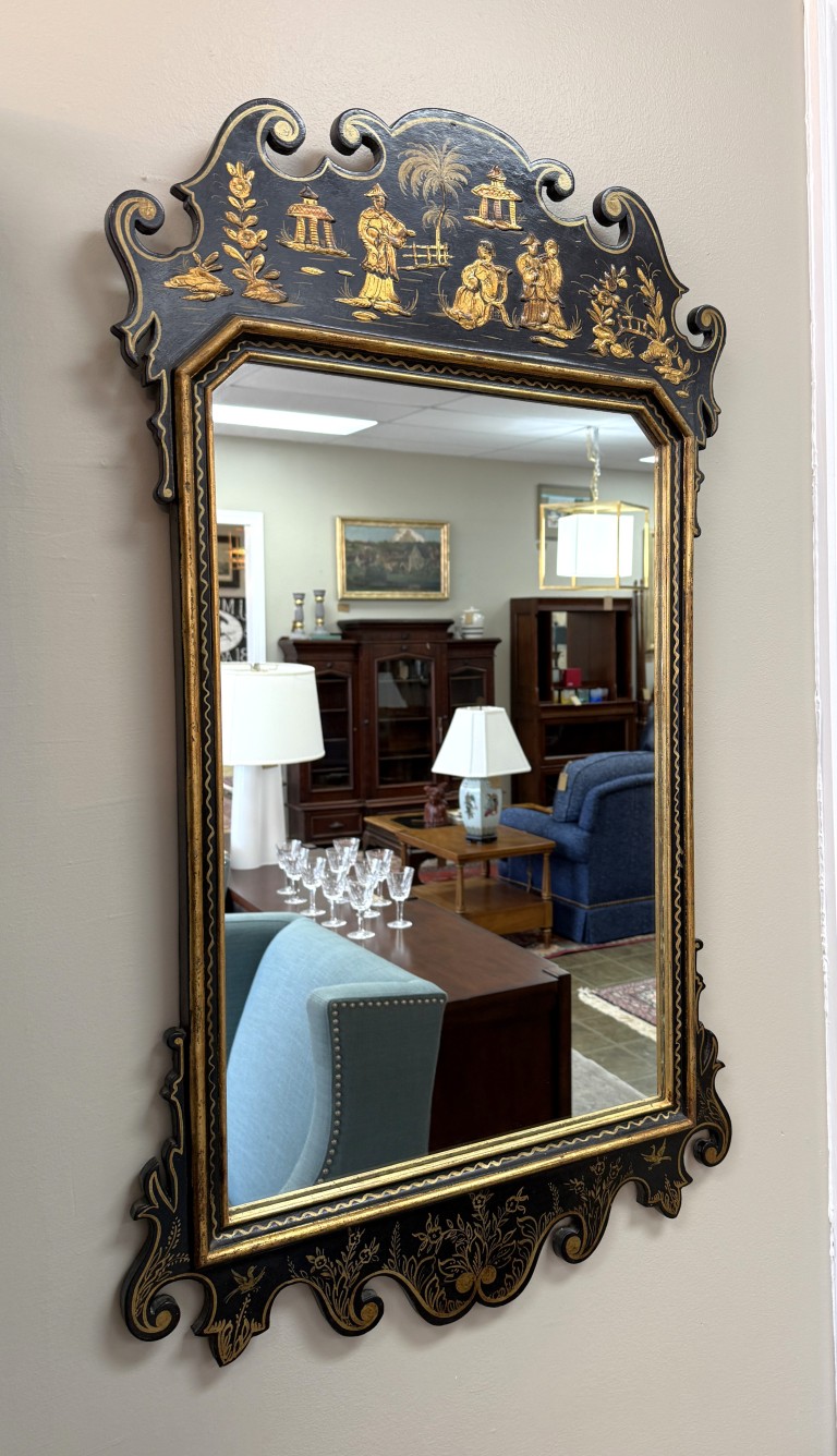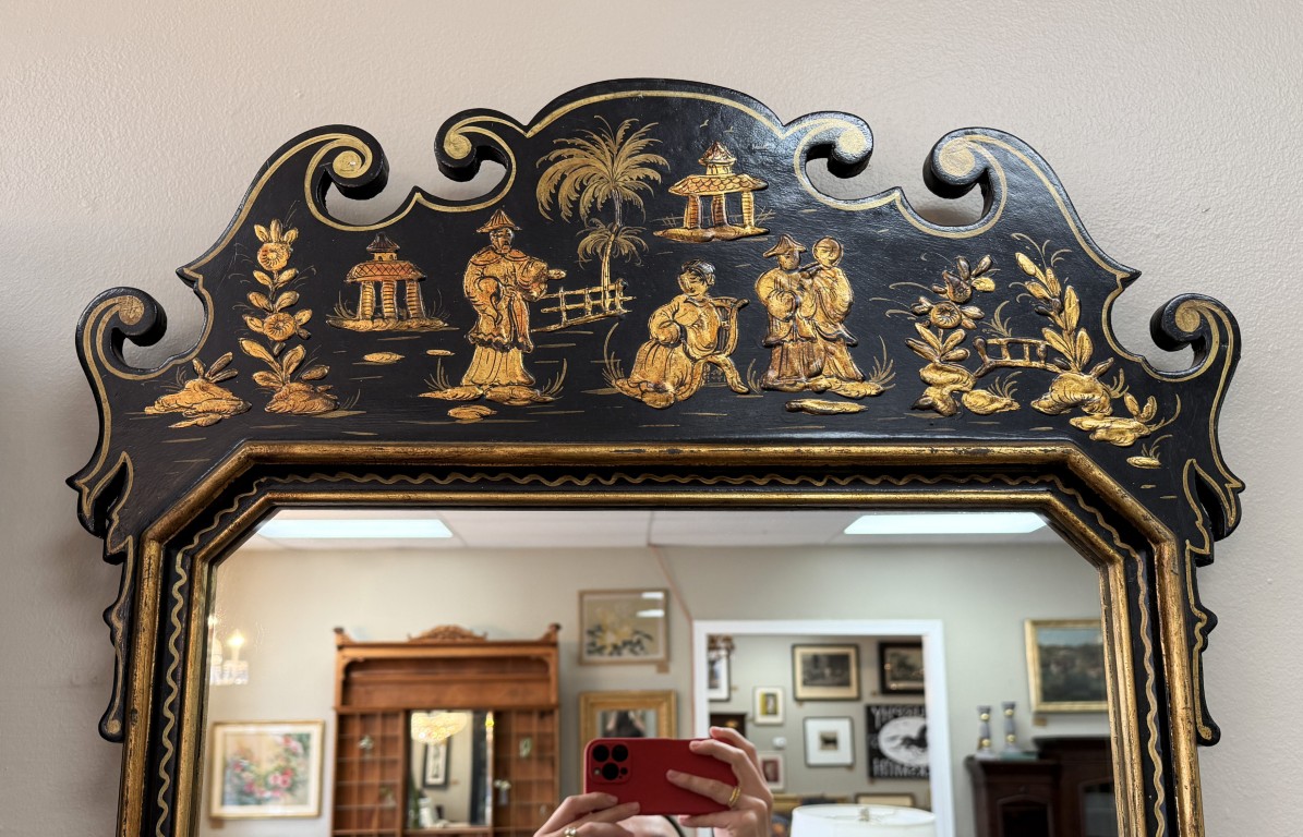 Vintage Chinoiserie Black and Gold Pagoda Scene Wall Mirror