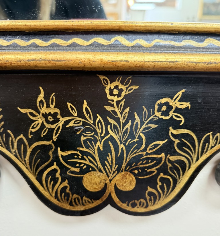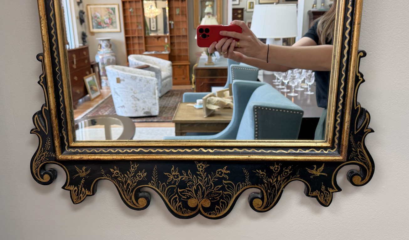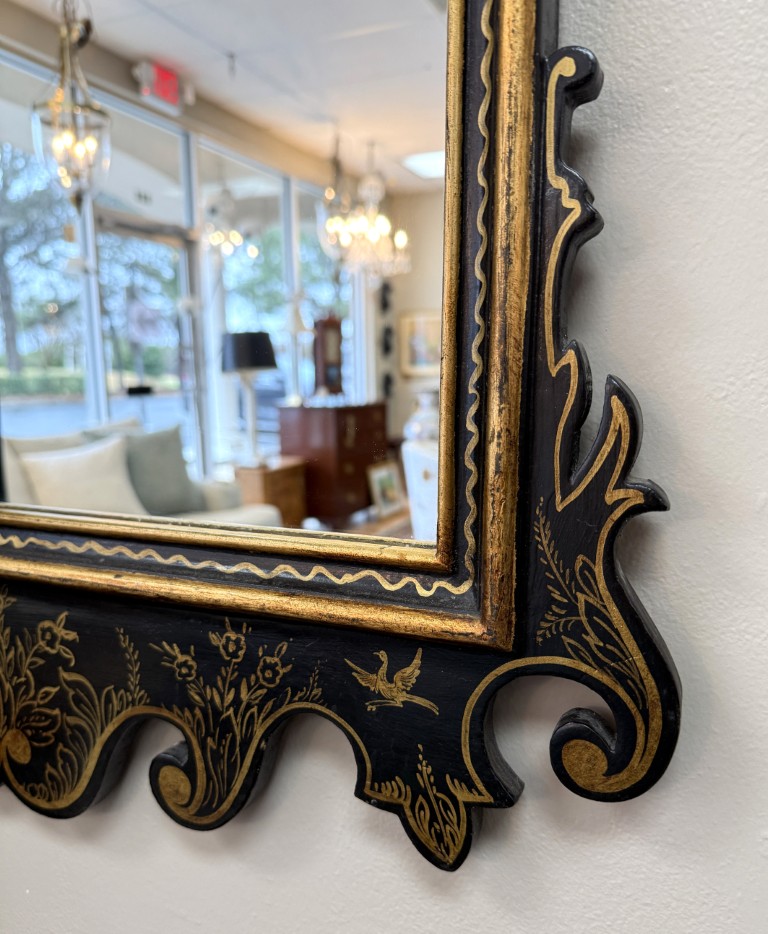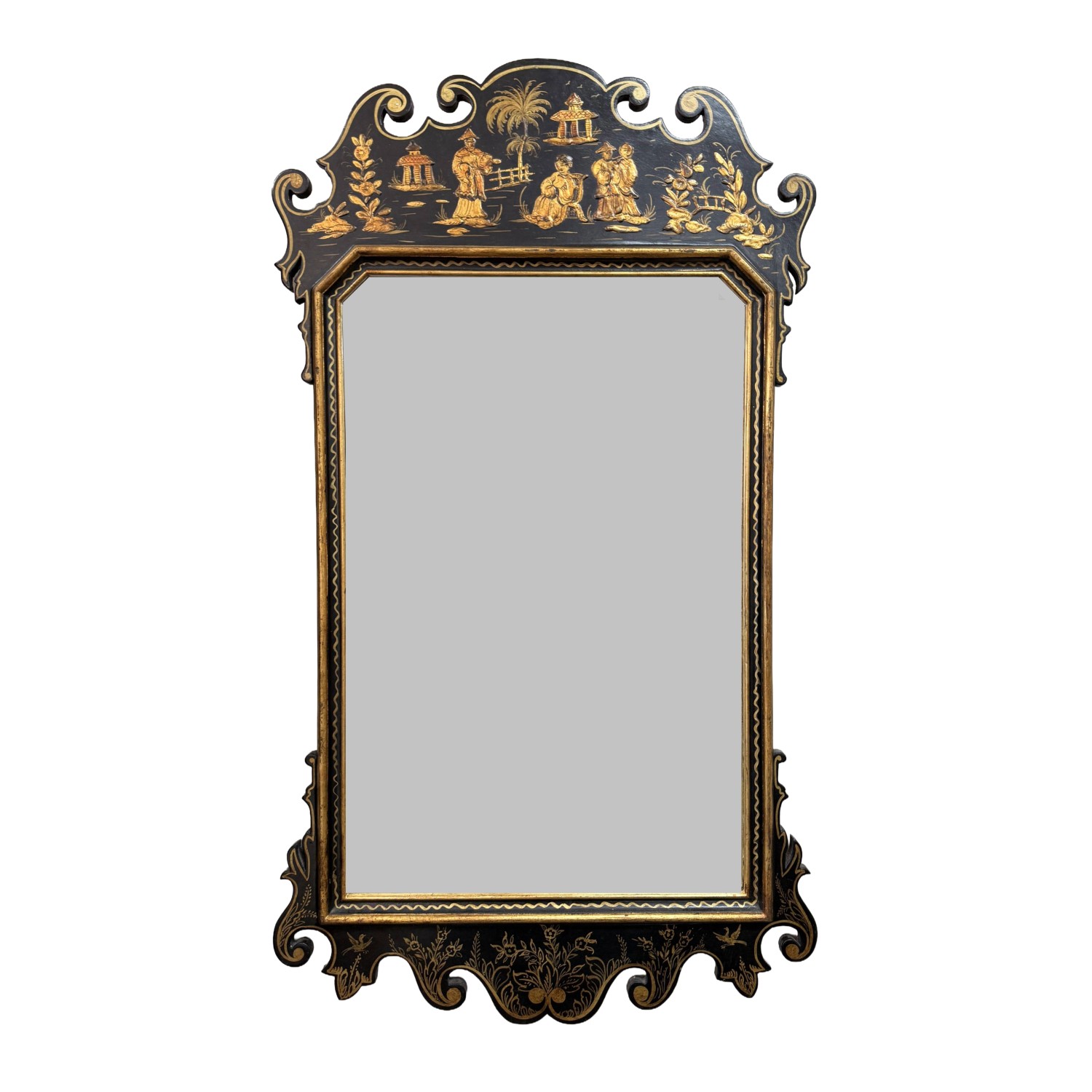 Vintage Chinoiserie Black and Gold Pagoda Scene Wall Mirror