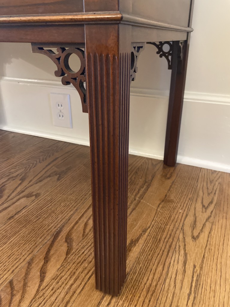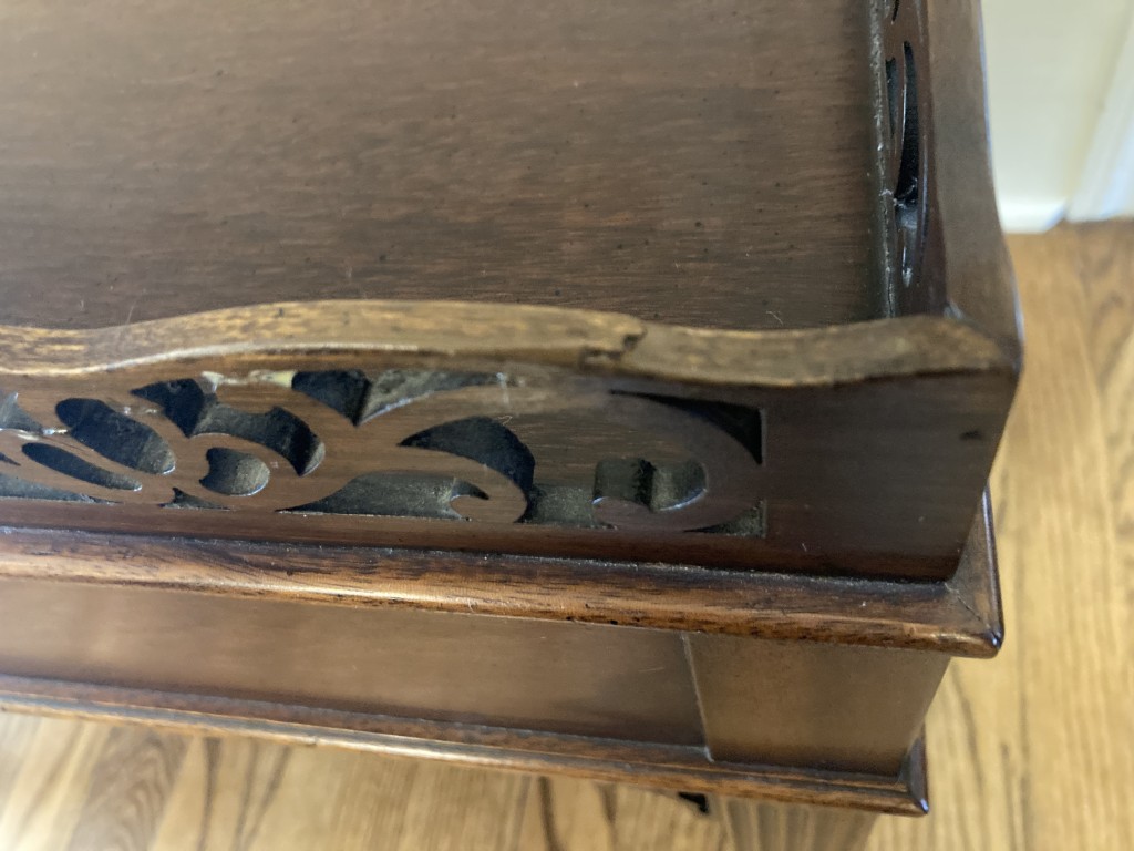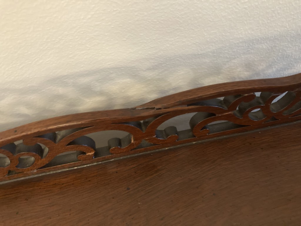 Your happiness with this item is of the utmost importance to us so please review the photographs carefully for condition. We endeavor to try and list any issues we may observe; we may not necessarily note all minor nicks and dings or we may simply miss something. Please inspect carefully to ensure your full happiness with this item. For this particular piece we found some wear consistent with age and prior use, including repairs to the fretwork gallery in several places. Overall very good condition.