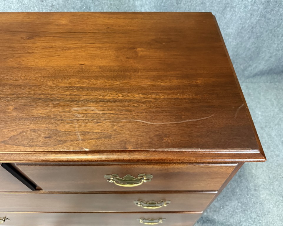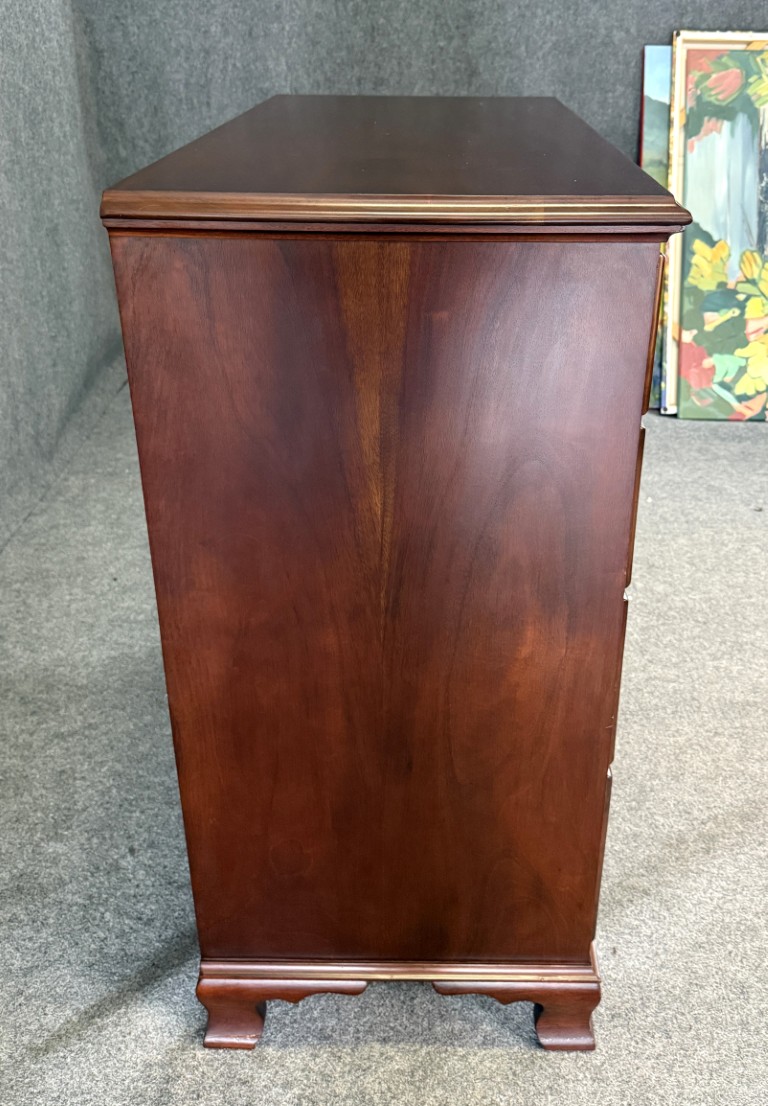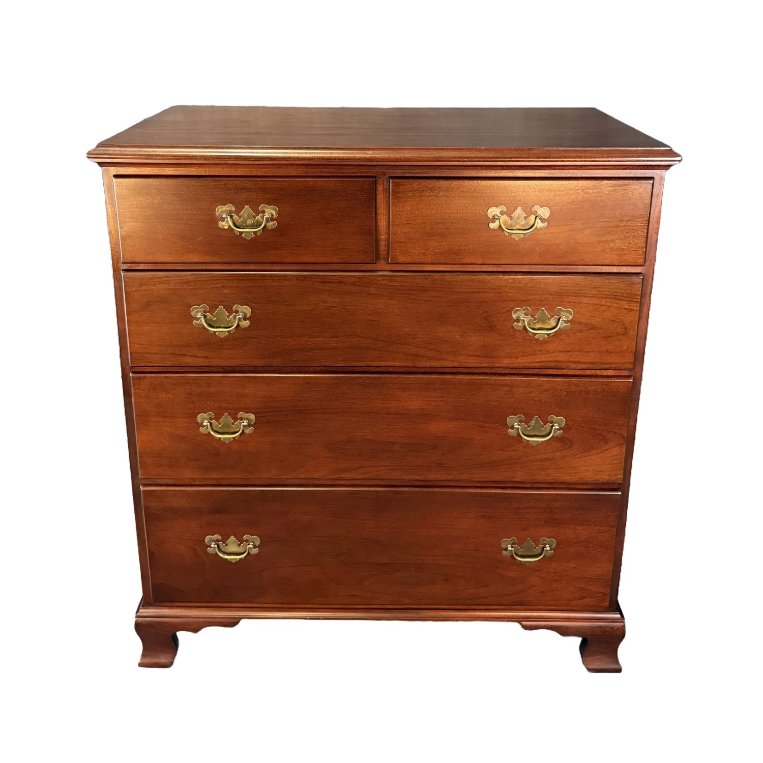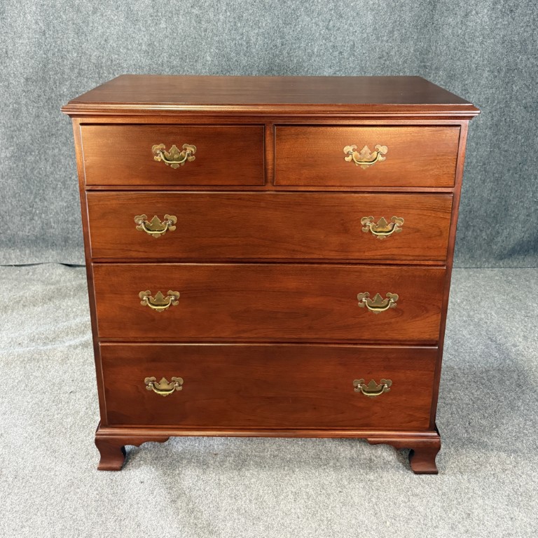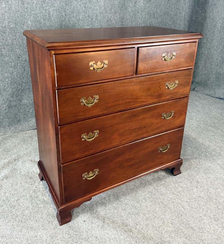 This vintage five drawer solid cherry dresser chest features a warm, rich finish with clean traditional lines and gently shaped feet. The spacious drawers are fitted with classic brass bail pulls, offering generous storage in a timeless, well-crafted form.