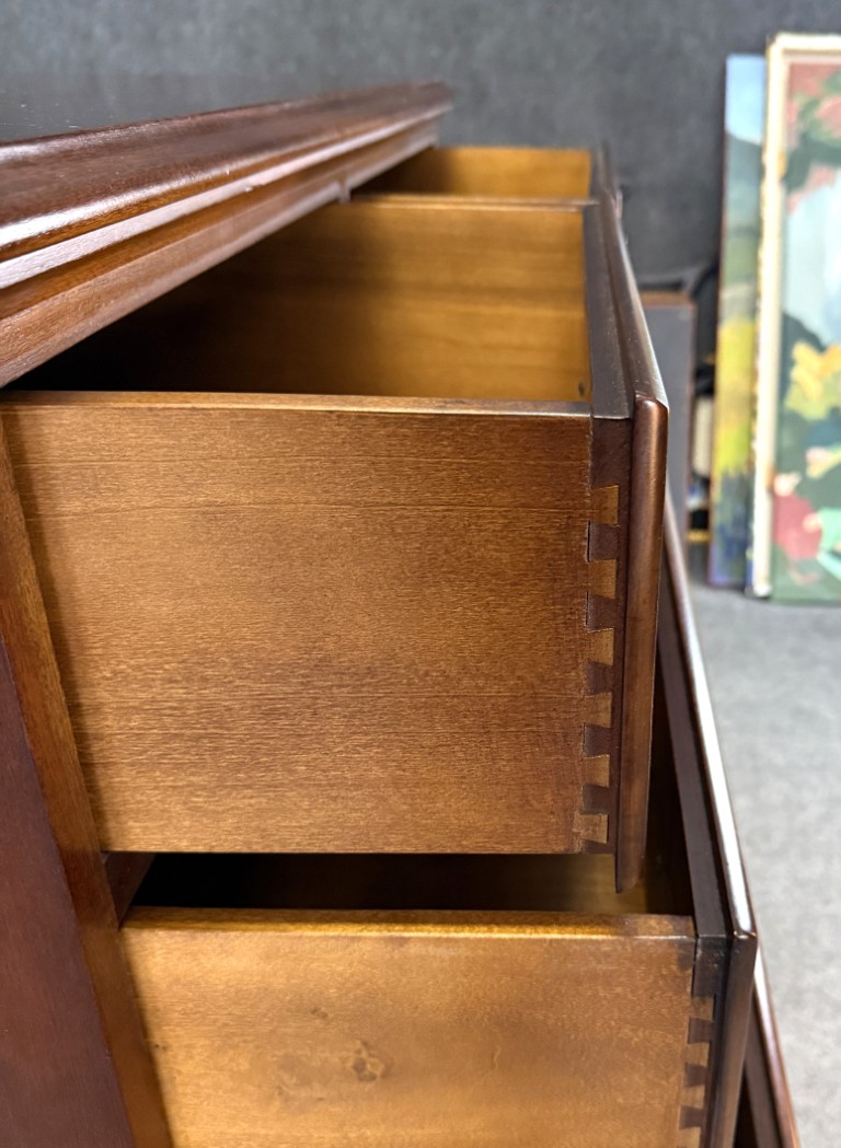 Your happiness with this item is of the utmost importance to us so please review the photographs carefully for condition. We endeavor to try and list any issues we may observe; we may not necessarily note all minor nicks and dings or we may simply miss something. Please inspect carefully to ensure your full happiness with this item. For this particular piece we found wear consistent with age and prior use, including a gouge on top, scuff on the top left drawer, and a repaired chipped back left leg.