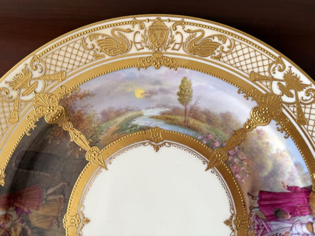 This vintage Holzner’s Glaspalast Karlsbad decorative plate features an ornate gilt border richly embellished with classical motifs surrounding finely detailed hand-painted scenes inspired by Meistersinger. The vignettes depict “In the Bootmaker’s Workshop” and “Coronation of Singers – To Be Crowned with Wreath,” rendered in soft, painterly tones that contrast beautifully with the luminous white porcelain ground. Marked “Made in Czecho-Slovakia” on the reverse, this elegant collector’s plate reflects the refined craftsmanship associated with historic Karlsbad porcelain.