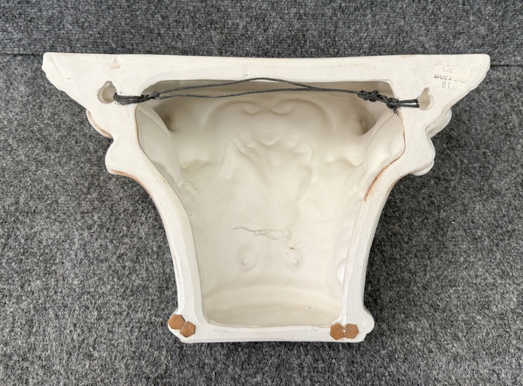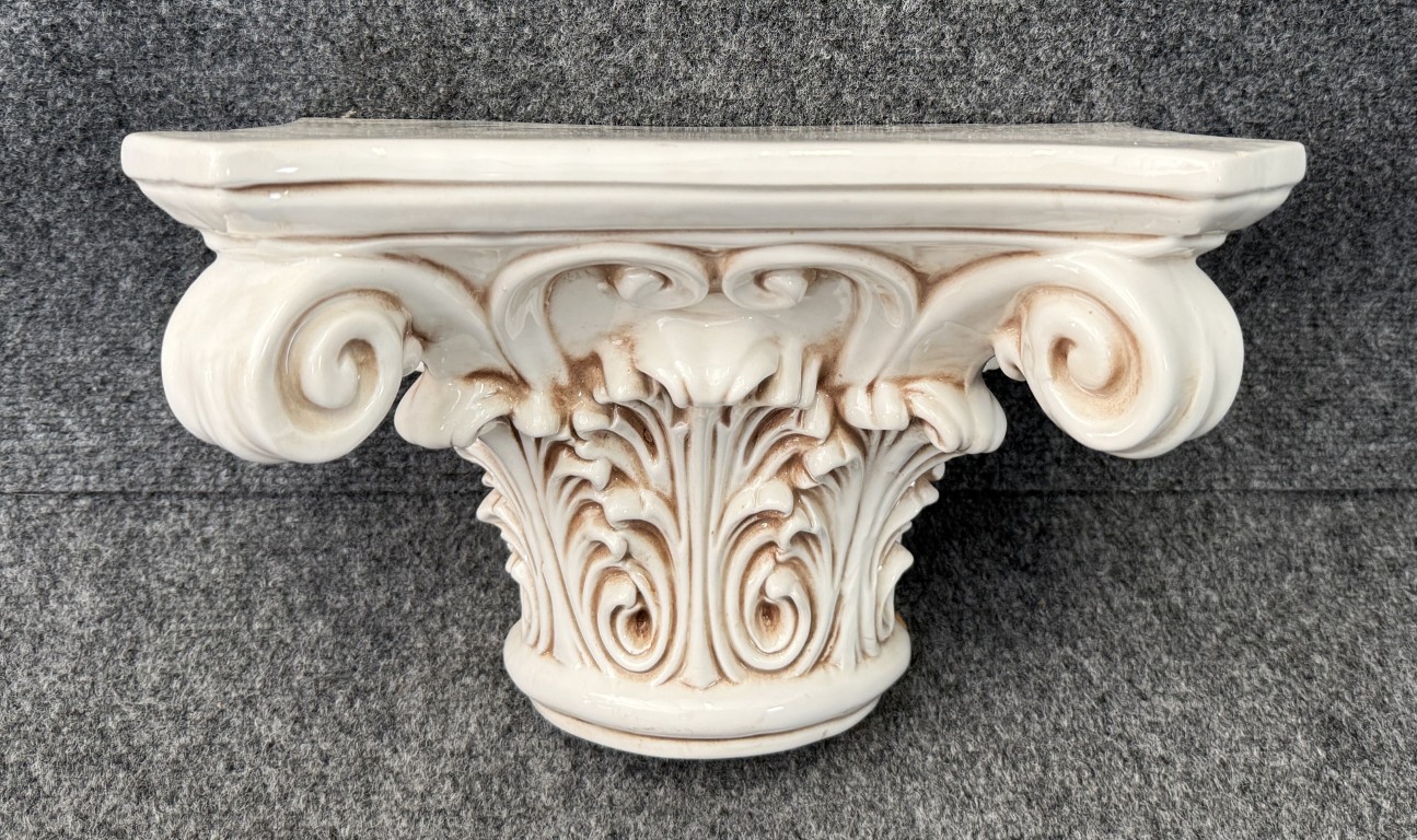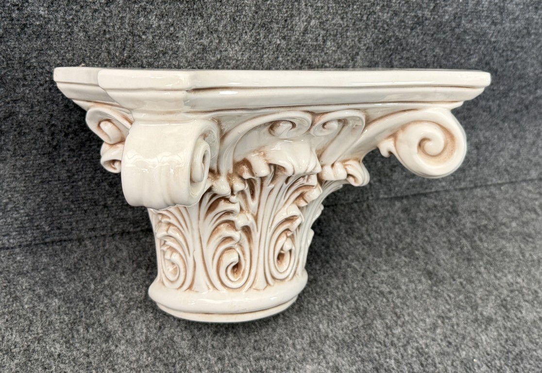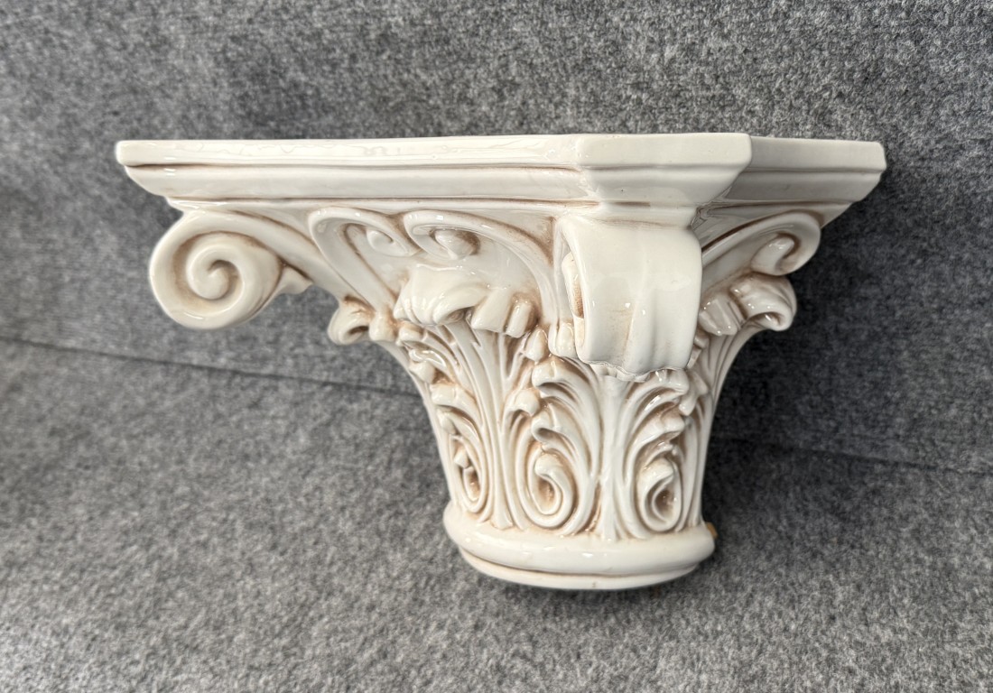 This vintage Italian-made porcelain wall sconce features a classical Corinthian-inspired form with deeply molded acanthus leaves, scrolling volutes, and a softly antiqued ivory glaze. Designed to hang on the wall as a decorative shelf or accent bracket, it offers Old World elegance and sculptural architectural presence.