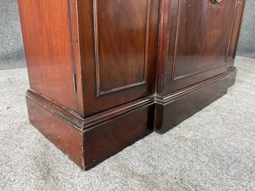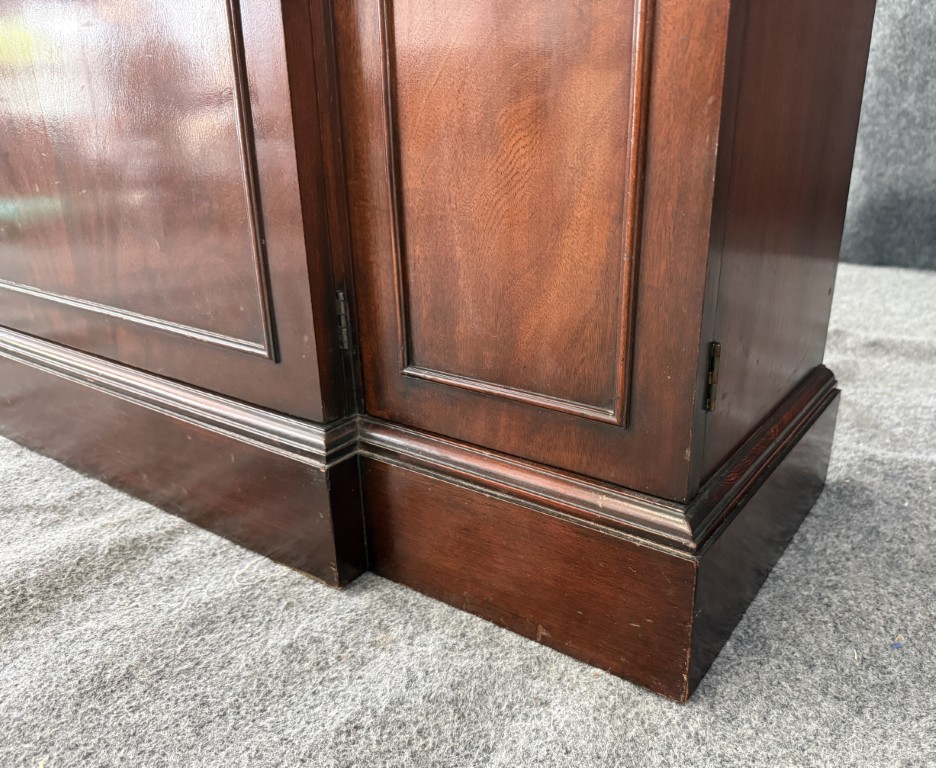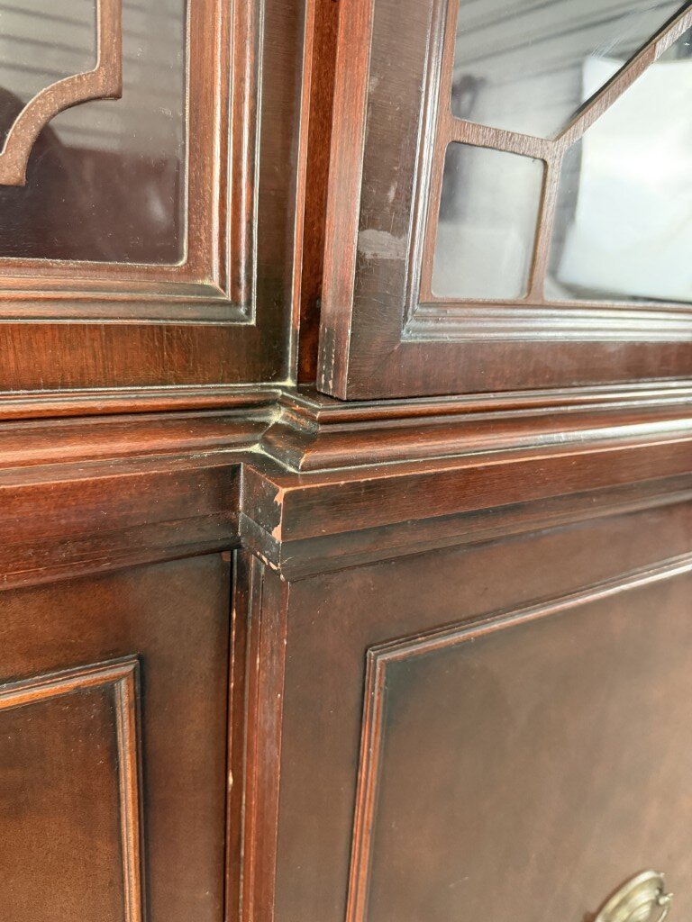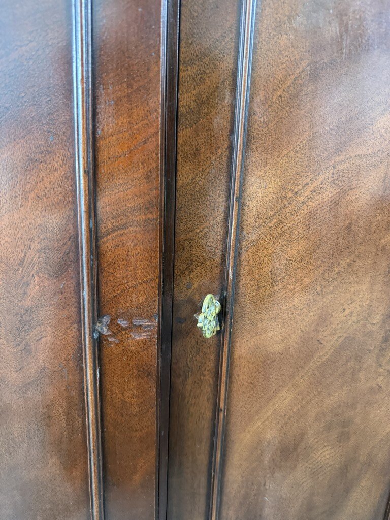 Your happiness with this item is of the utmost importance to us so please review the photographs carefully for condition. We endeavor to try and list any issues we may observe; we may not necessarily note all minor nicks and dings or we may simply miss something. Please inspect carefully to ensure your full happiness with this item. For this particular piece we found minor wear consistent with age and prior use, including chipping veneer on decorative molding, a bent pull on the bottom right door, a scratch on right side of bottom middle door, and finish loss around the pulls.