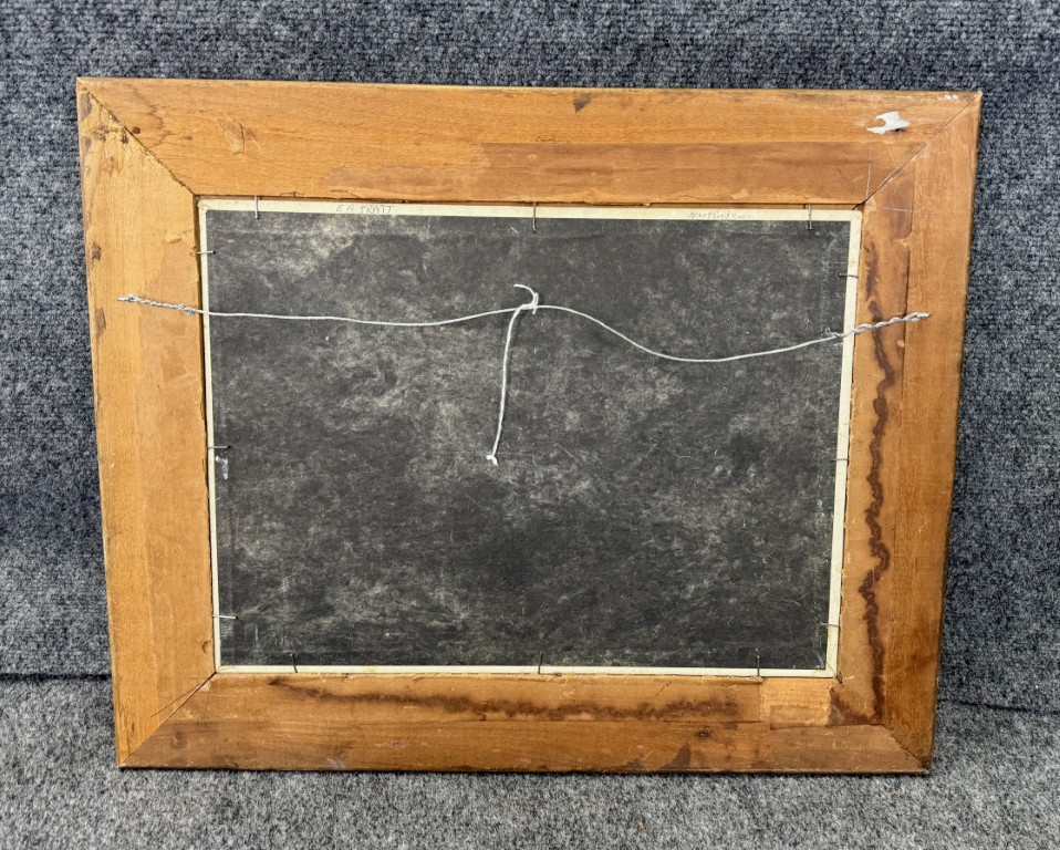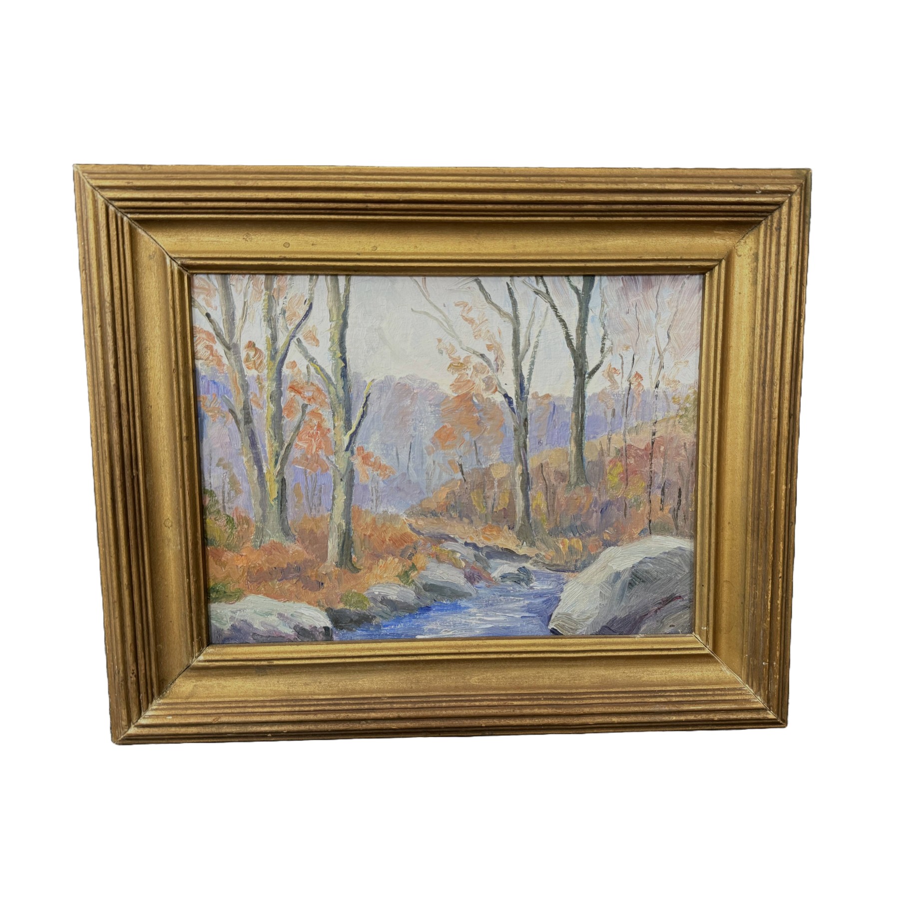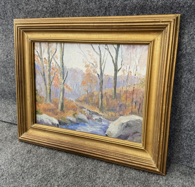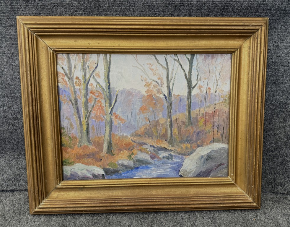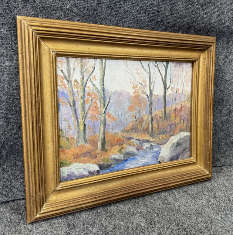 This vintage mid-century landscape oil on board, signed on the reverse by Connecticut artist Emmett A. Pratt (1884–1978), depicts a tranquil woodland stream framed by autumnal trees. Pratt, a Hartford-based painter known for his regional New England scenes, captures the quiet beauty of the changing seasons through expressive color and confident brushwork.