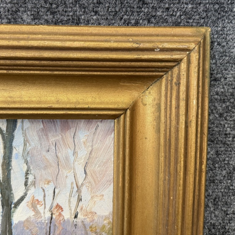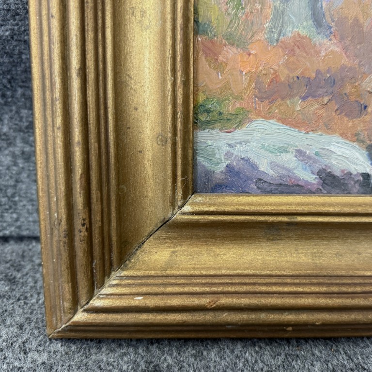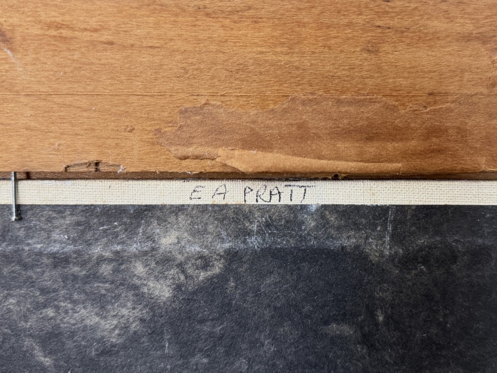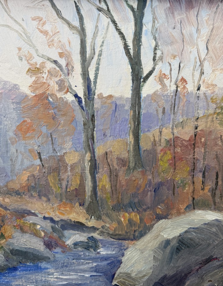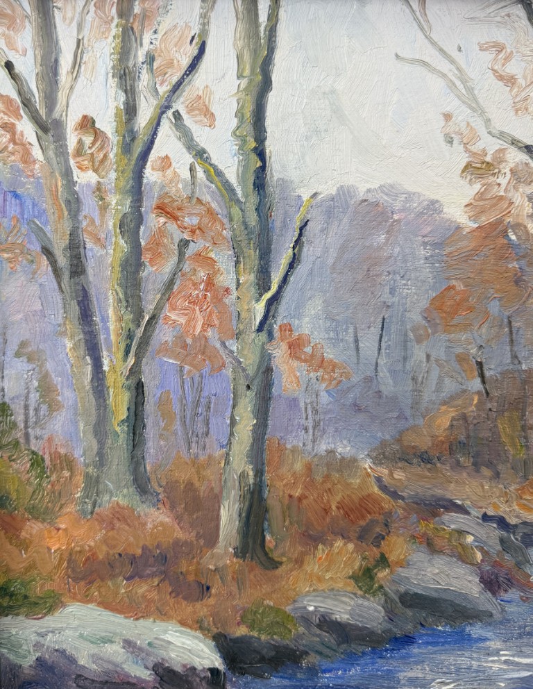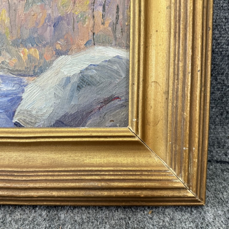 This vintage mid-century landscape oil on board, signed on the reverse by Connecticut artist Emmett A. Pratt (1884–1978), depicts a tranquil woodland stream framed by autumnal trees. Pratt, a Hartford-based painter known for his regional New England scenes, captures the quiet beauty of the changing seasons through expressive color and confident brushwork.
