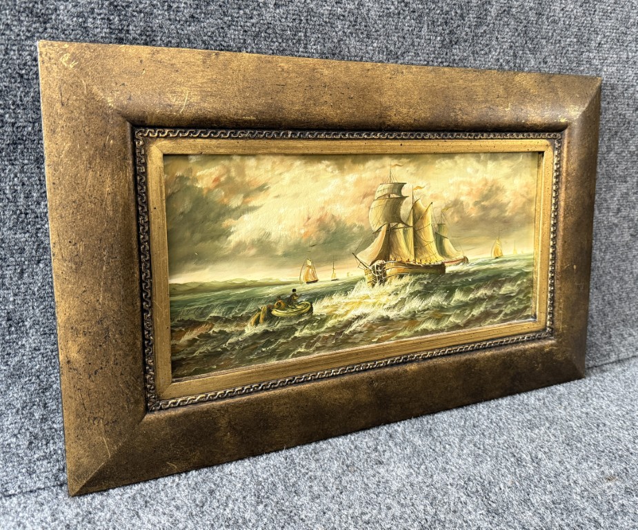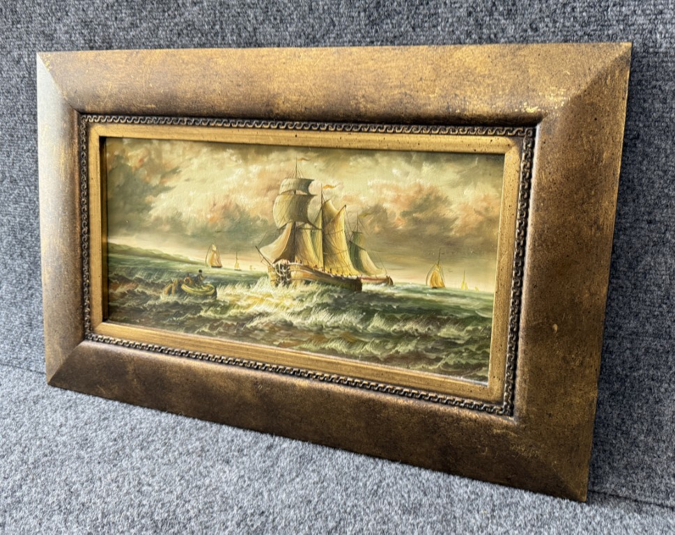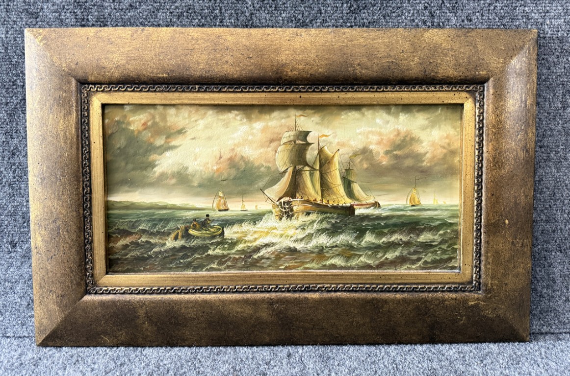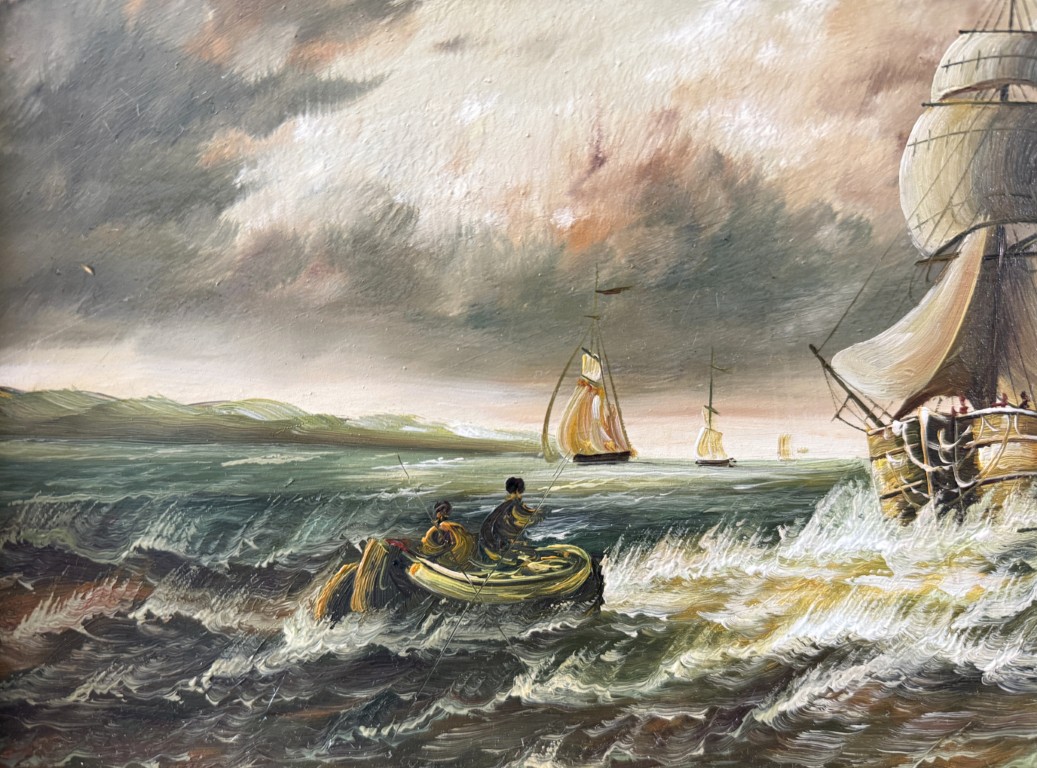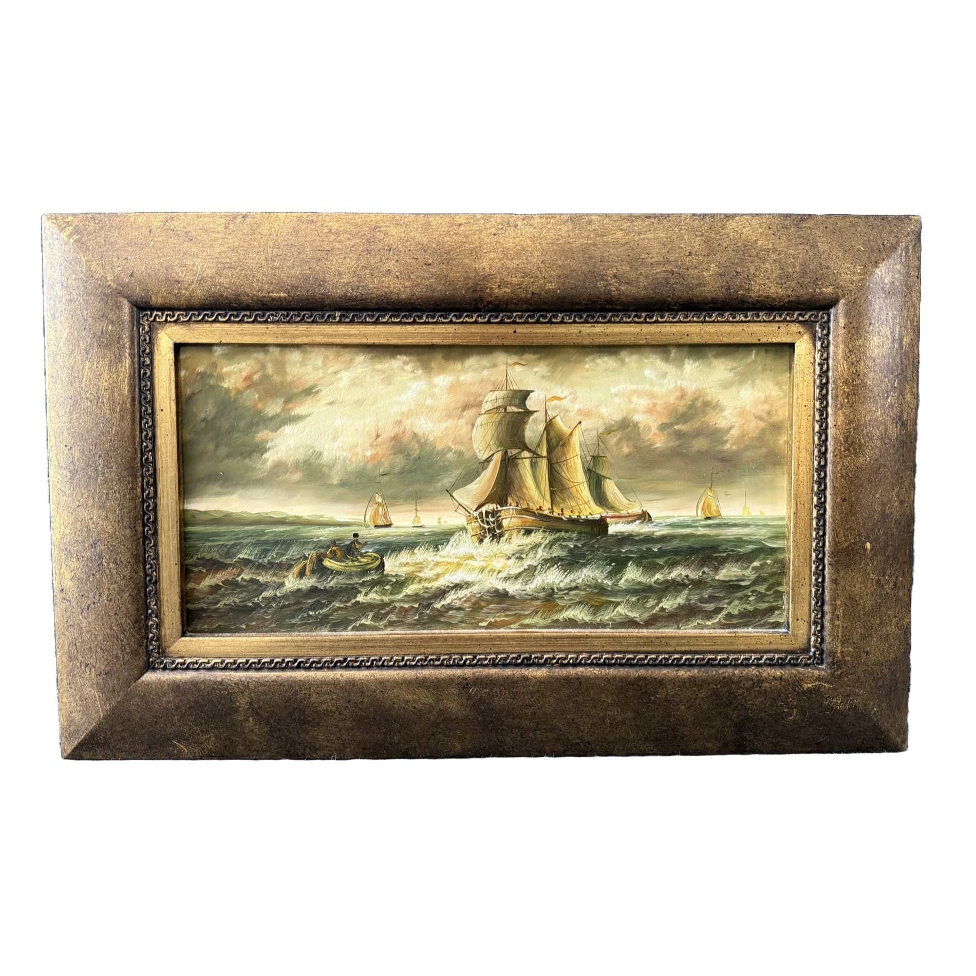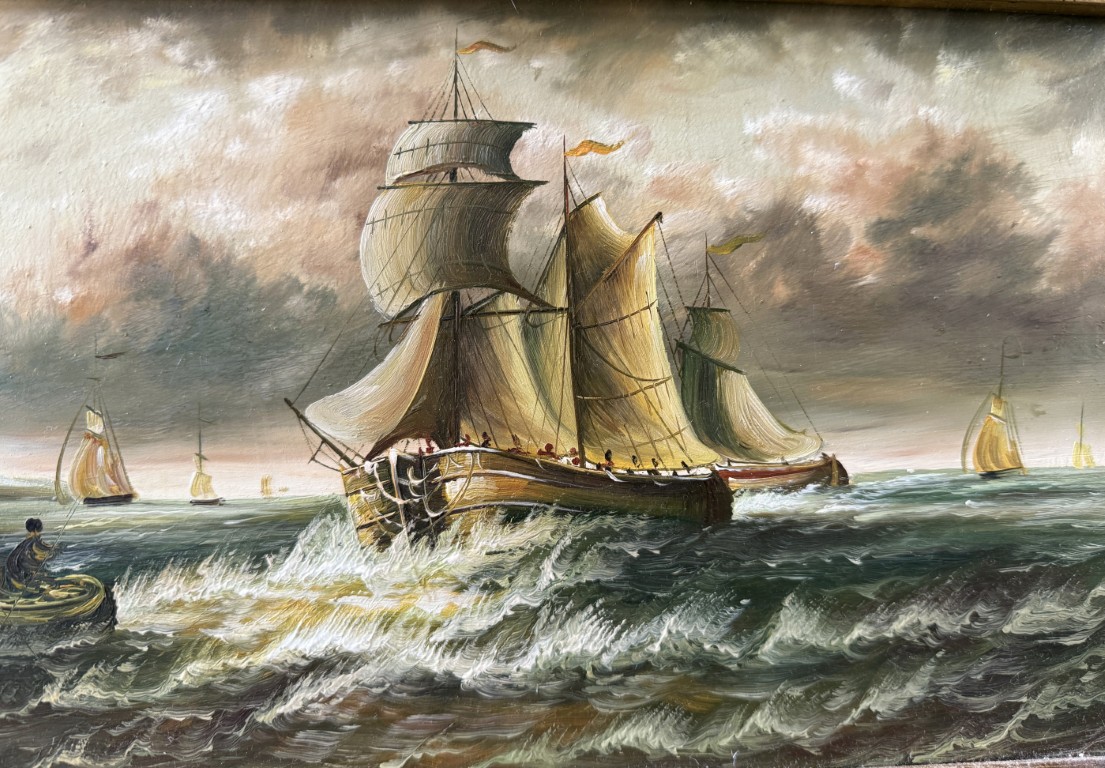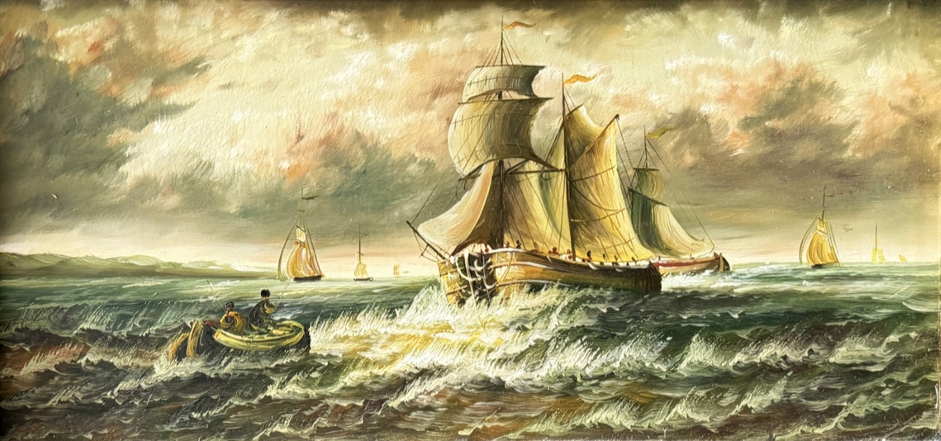 A powerful clipper ship is depicted cutting through rolling waves, its sails filled with wind under a dramatic sky. Smaller boats surround the vessel, adding to the sense of movement and activity on the open sea. The richly textured brushwork and bold maritime subject make this a striking nautical painting.