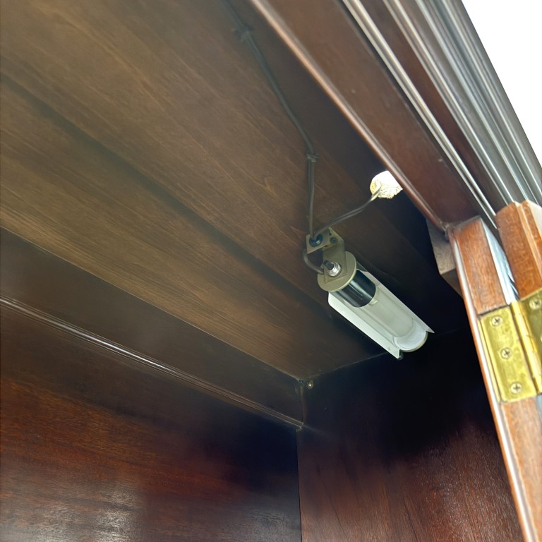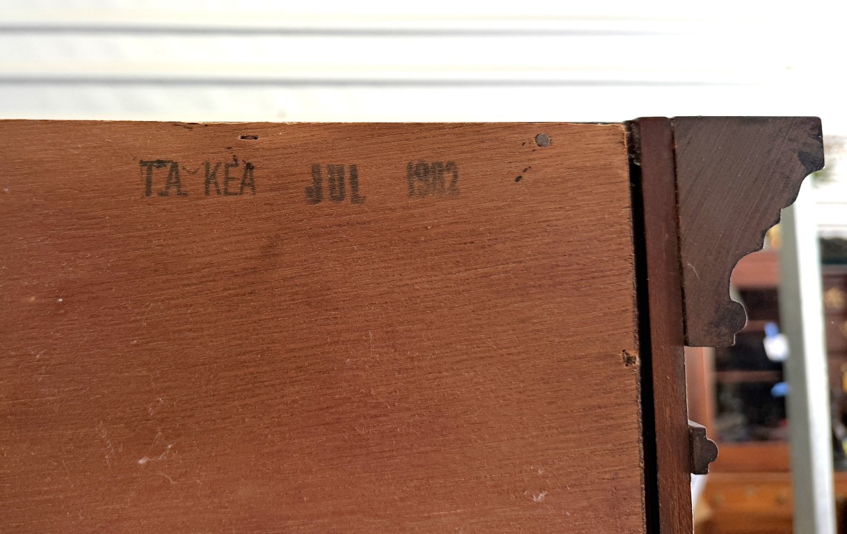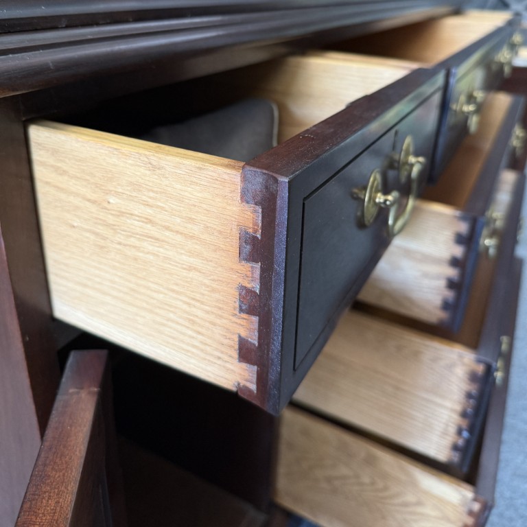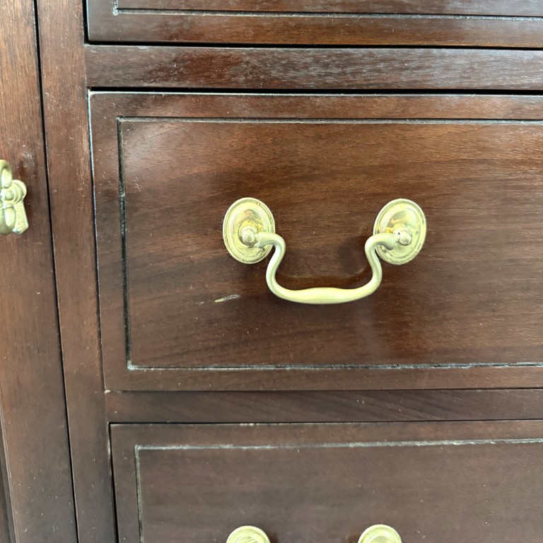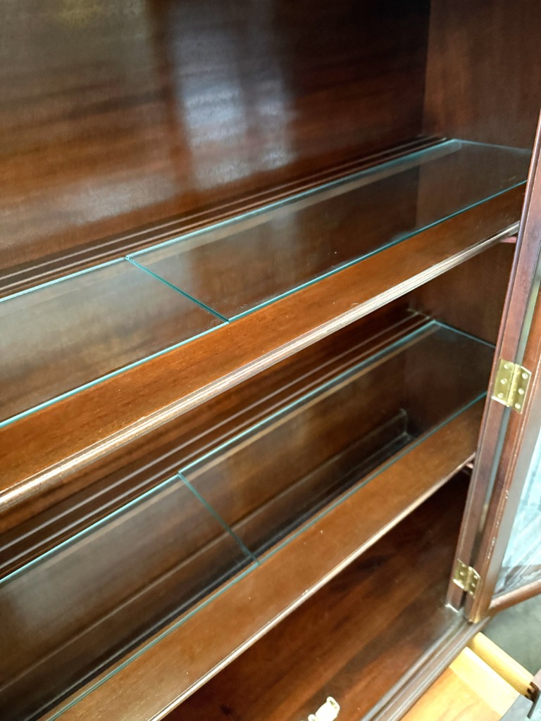 Your happiness with this item is of the utmost importance to us so please review the photographs carefully for condition. We endeavor to try and list any issues we may observe; we may not necessarily note all minor nicks and dings or we may simply miss something. Please inspect carefully to ensure your full happiness with this item. For this particular piece we found wear consistent with age and prior use, including a scuff on one of the drawers and minor nicks and dings on the base. Please note the glass inserts for the shelves are in half sheets, meaning two pieces of glass per shelf.